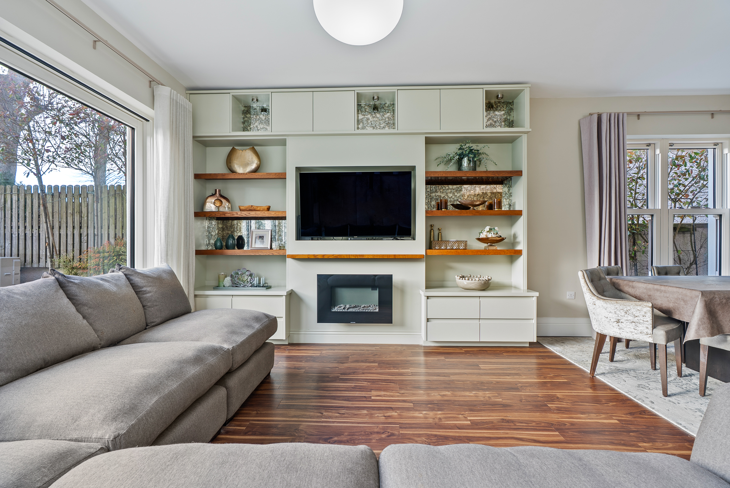 Double doors lead into the superb lounge area. This spectacular room has beautiful décor throughout with a feature bay window to the front of the property allowing in extensive natural light, attractive built-in display units on either side of the built-in fireplace, with a multi fuel stove, and one centre light fitting.