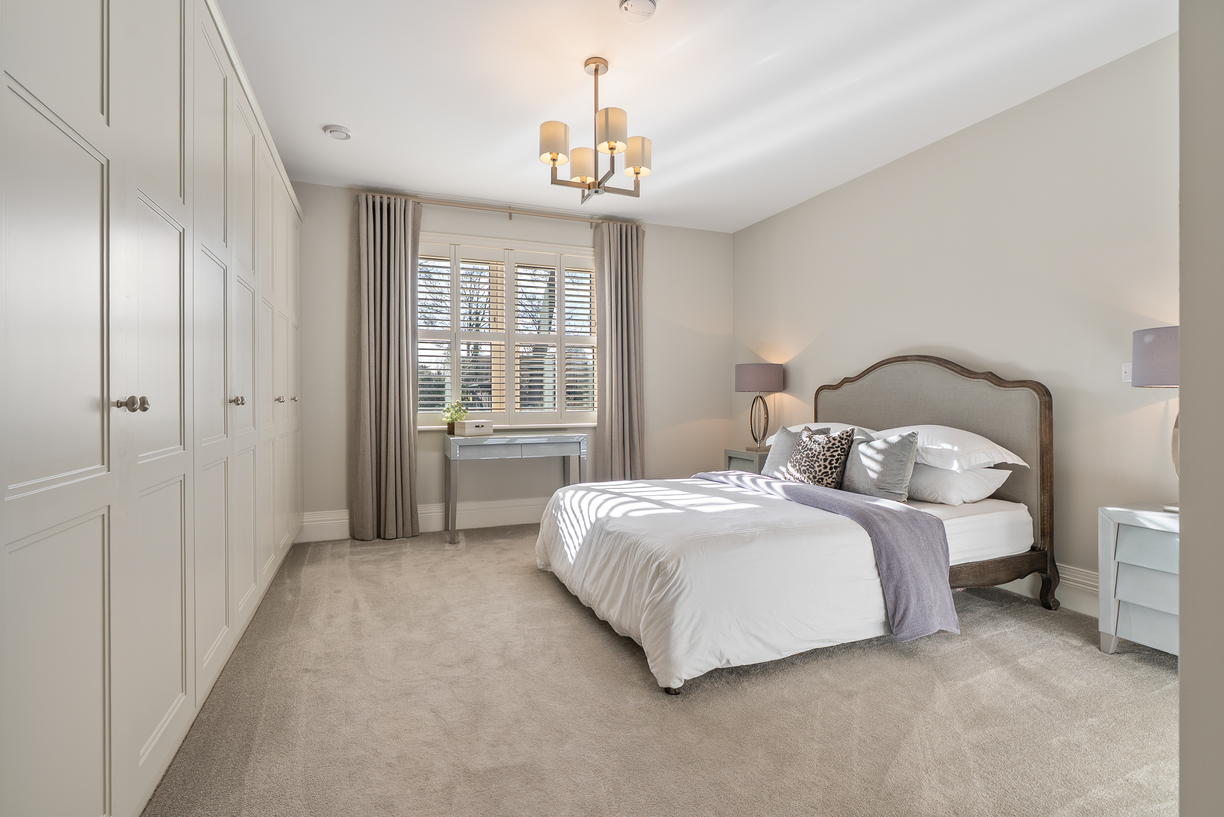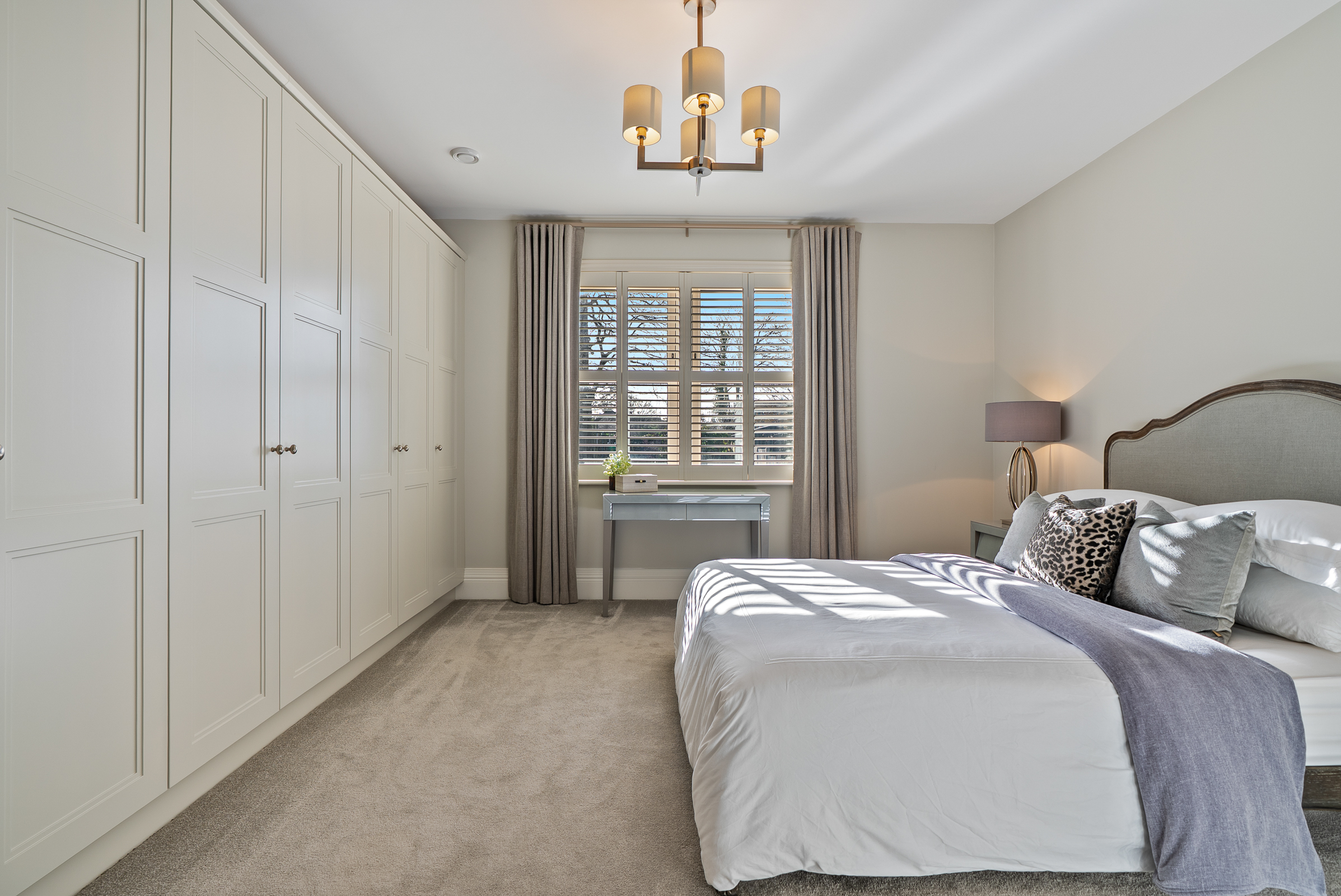 This spacious double bedroom has extensive built-in wardrobe units, neutral décor, and a large window overlooks the rear of the property, one radiator and carpet flooring, A door allows access to the second en suite bathroom.