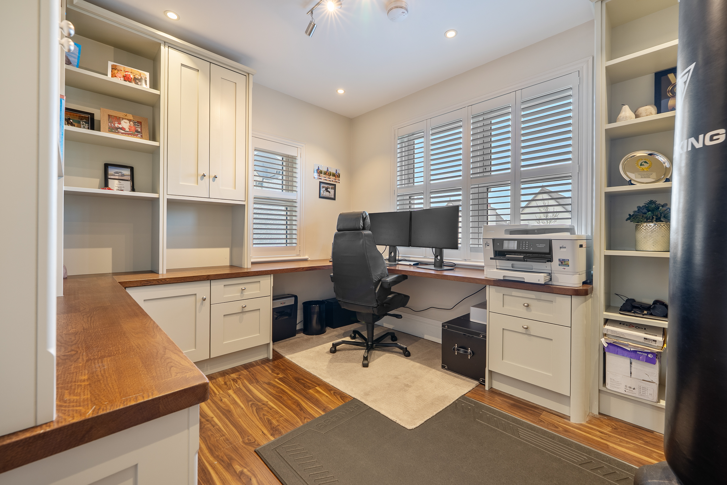 Currently in use as a fully fitted home office, this dual aspect bedroom has one window to the front of the property and one window to the side, built-in units, recessed spot lighting, radiator and Amtico flooring.