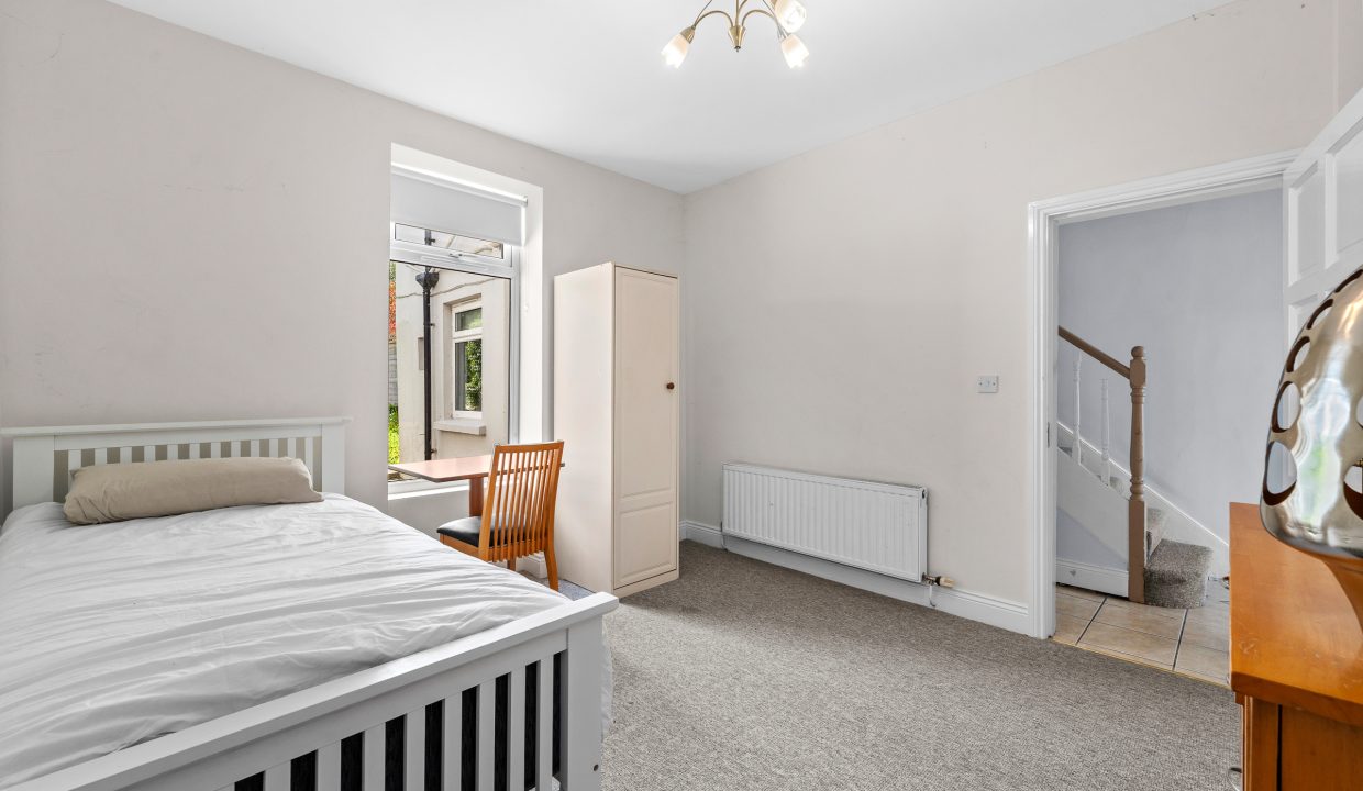 This spacious bedroom has one centre ceiling light, one window to the front of the property offering beautiful views of The Lough, ample power points, one wall-mounted radiator and carpet flooring.