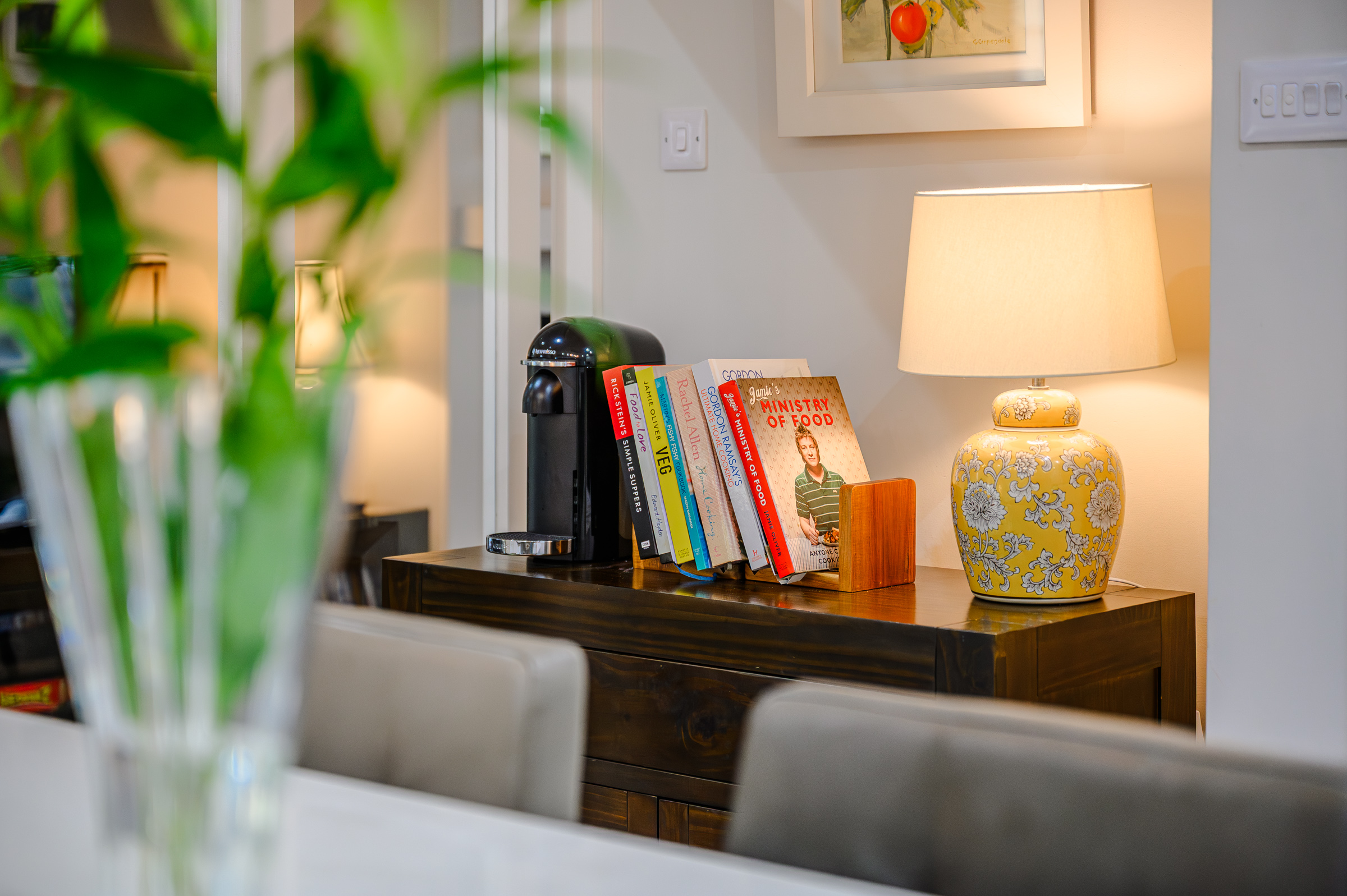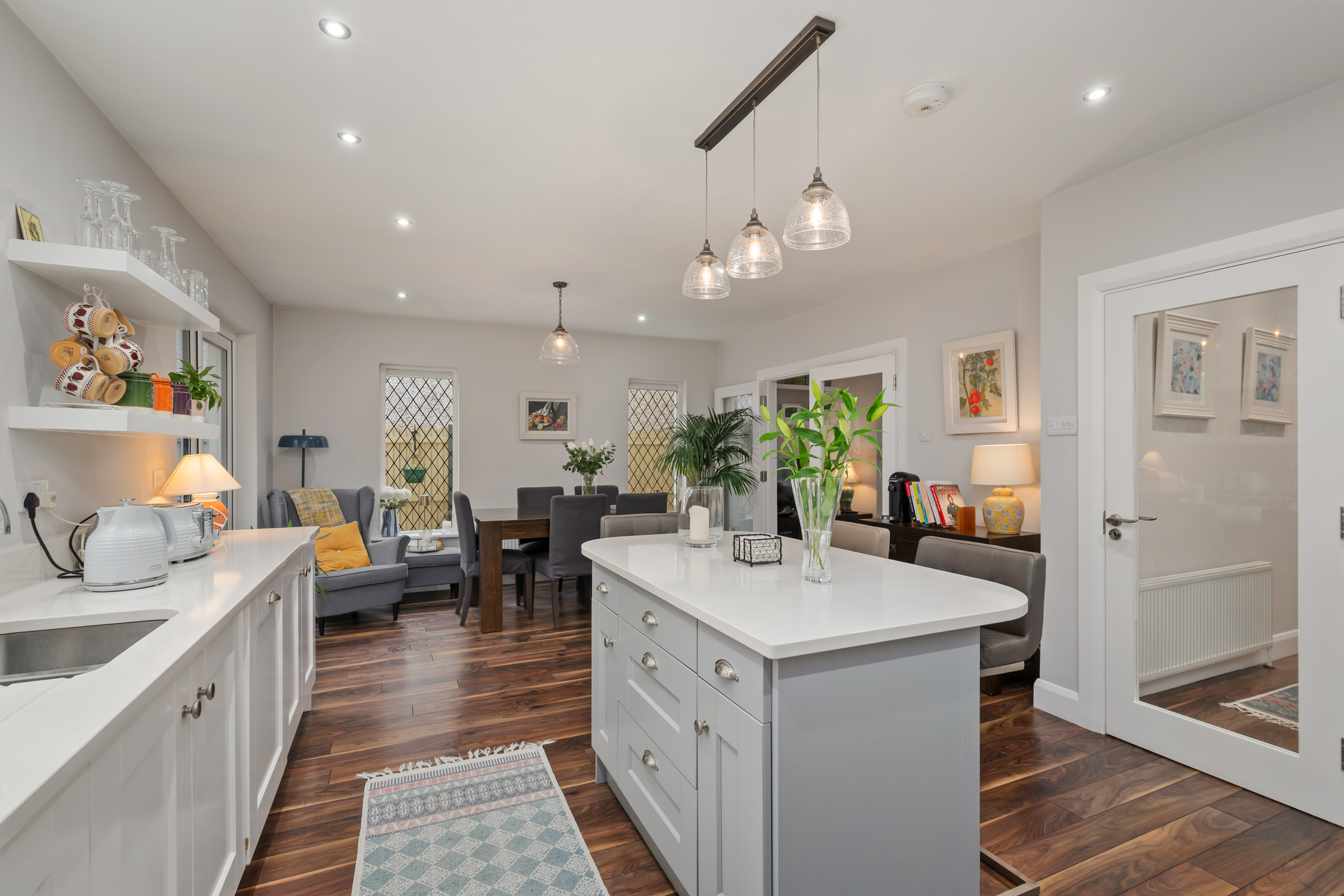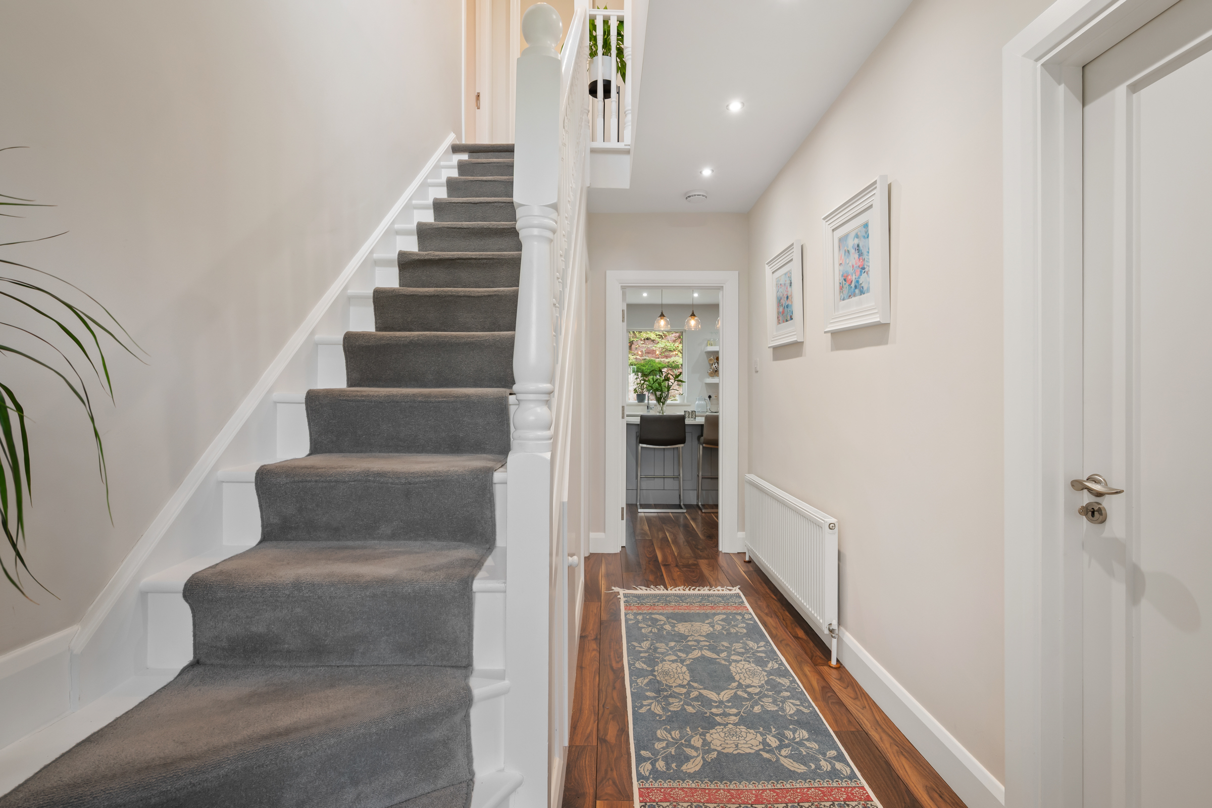 A high quality composite door with frosted glass panelling allows access into the main reception hallway. This bright and welcoming reception hallway features high quality laminate timber flooring, attractive neutral décor, one large radiator, and recessed spot lighting.