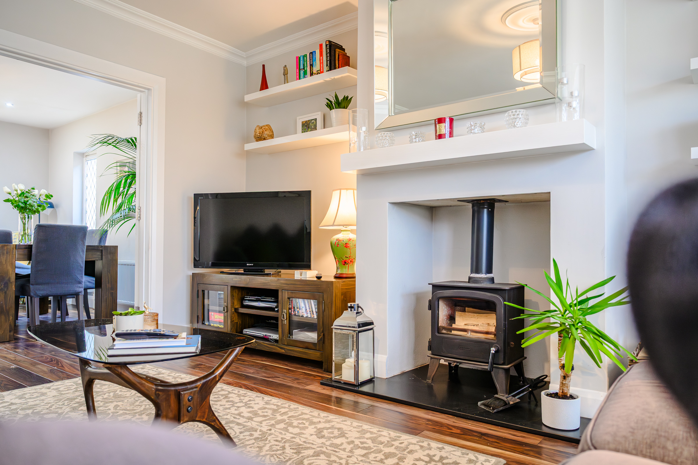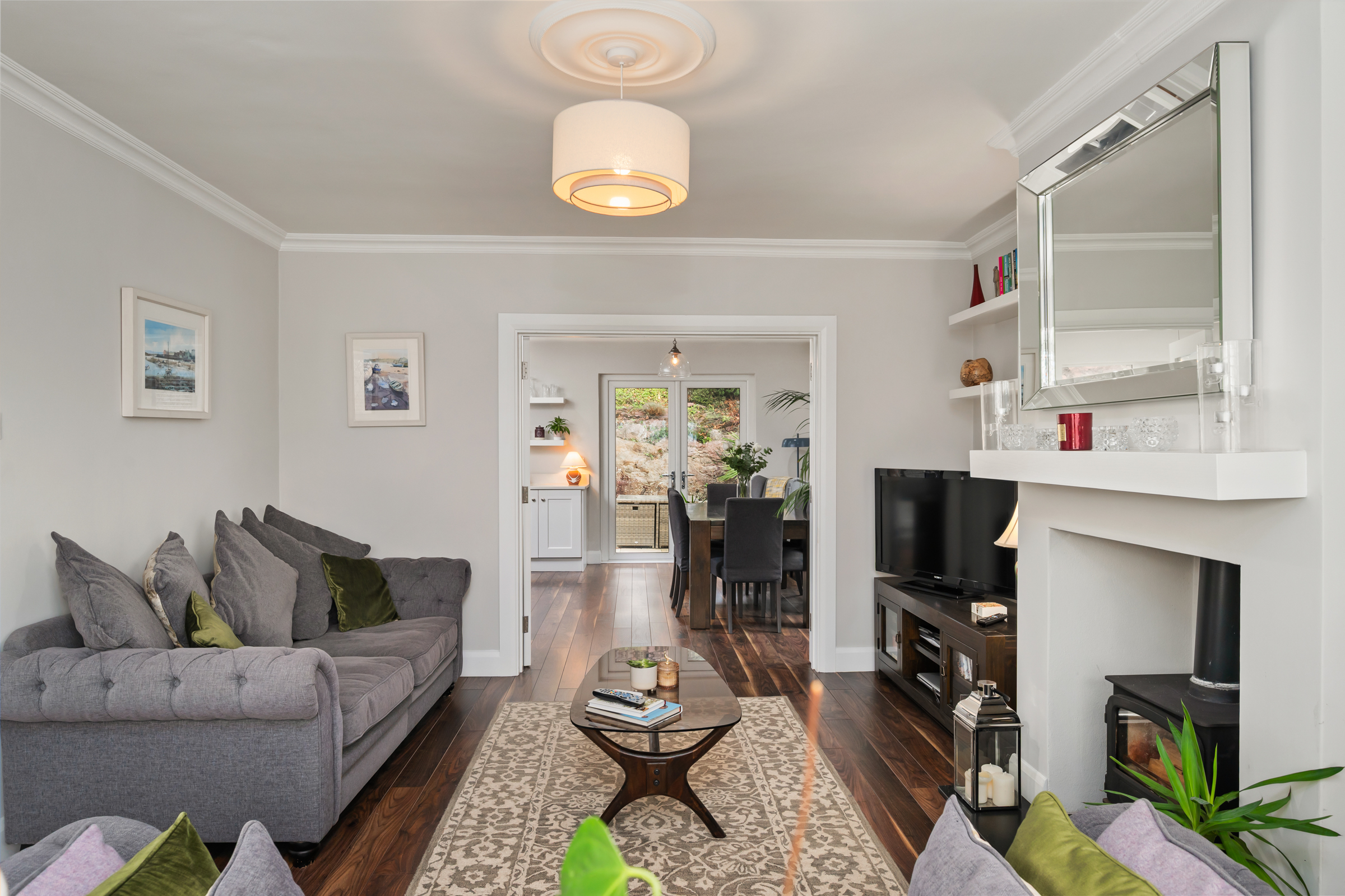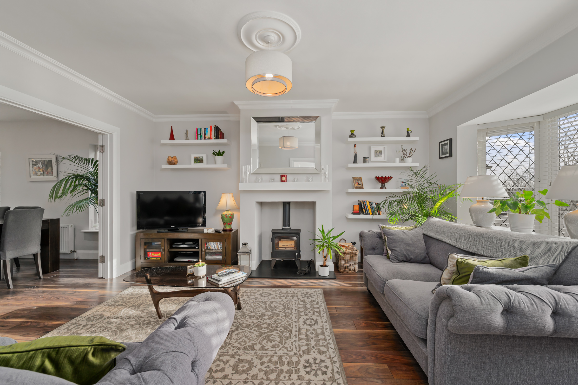 This spacious main living room has a feature bay window to the front of the property, allowing extensive natural light to flood the area. The room has a feature fireplace with a stove insert, high quality laminate timber flooring, one centre light fitting and two radiators. Attractive neutral décor features throughout and double doors allow access to the spacious kitchen/dining area.