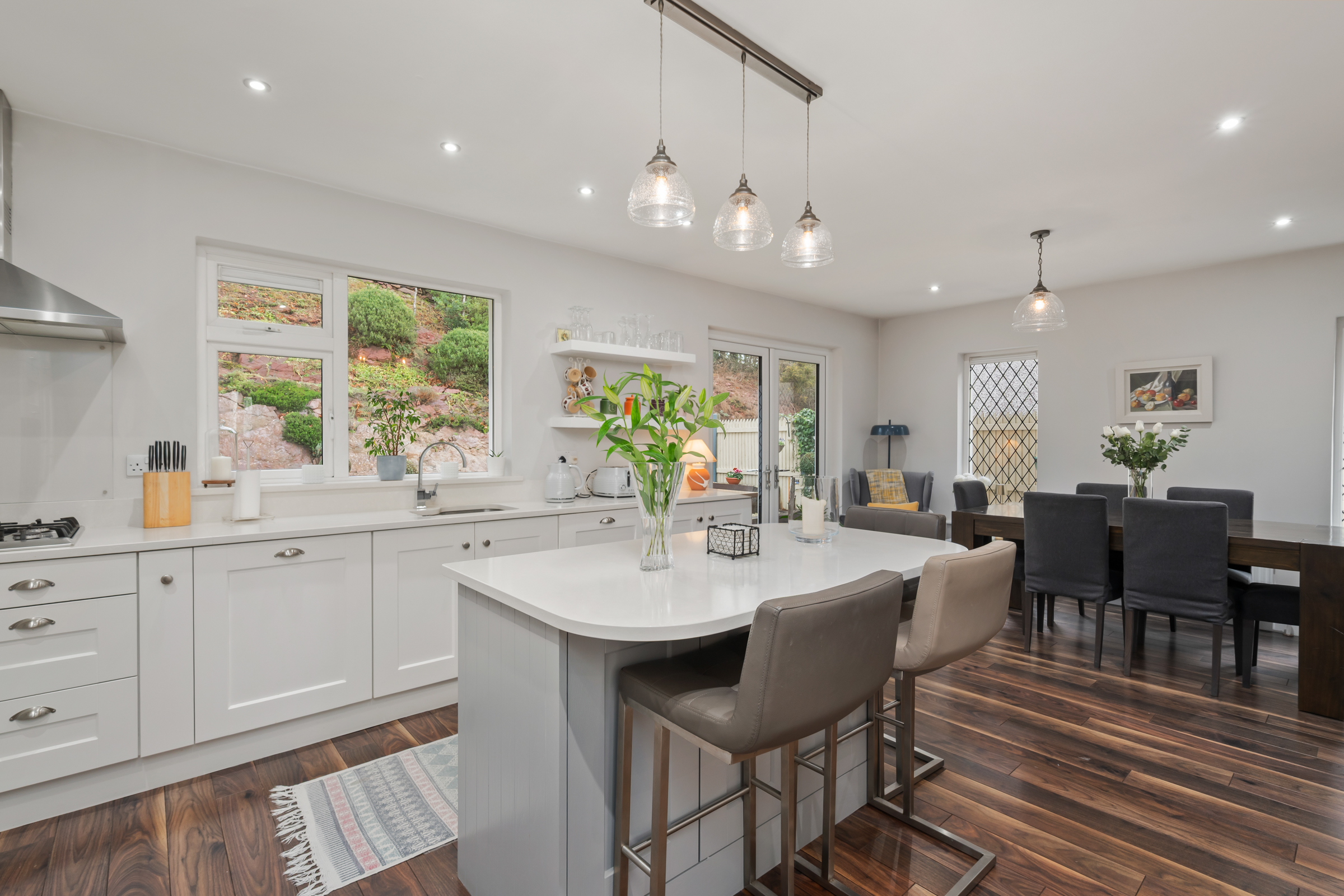 This truly exquisite and beautifully presented room has one window to the rear of the property, two windows to the side, and double doors allowing access to the rear garden. The area has a continuation of the high quality laminate flooring, extensive dining space, one feature light fitting, one radiator, and recessed lighting throughout.