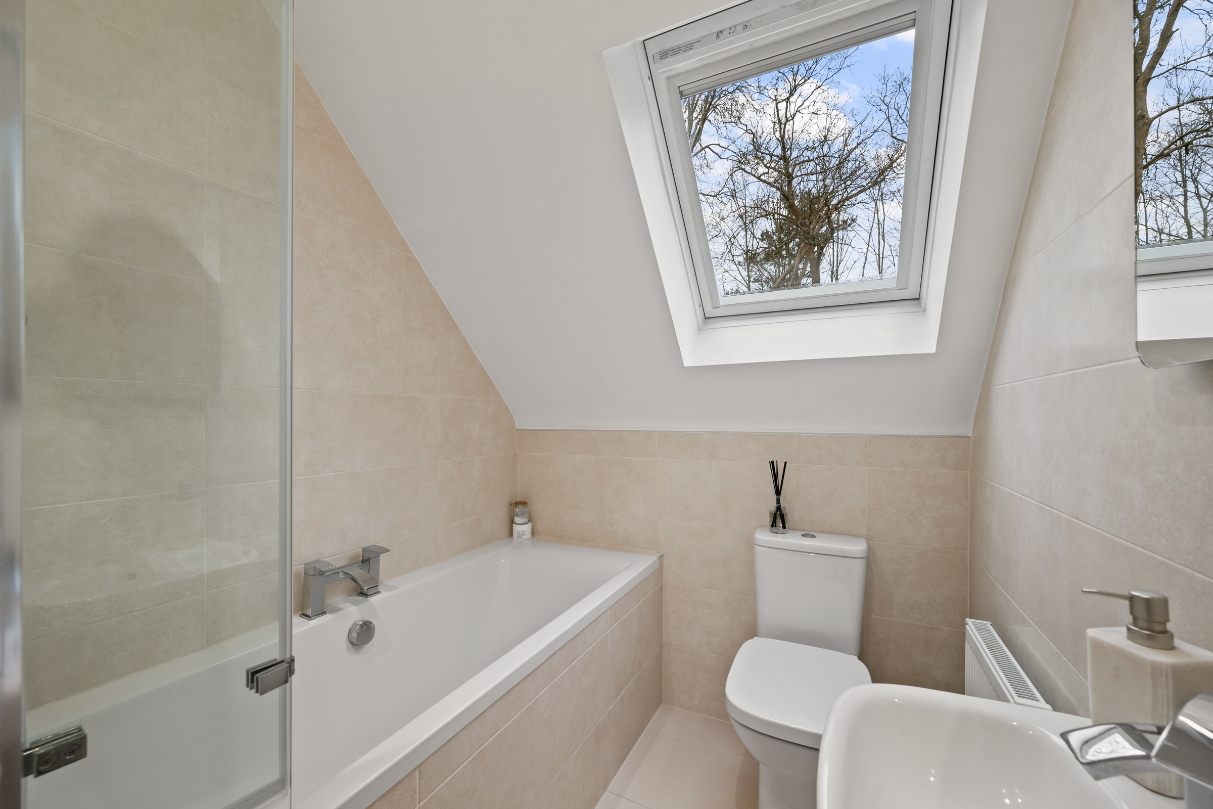 The en suite bathroom features a four piece suite including a shower fitted over the bath, attractive floor and wall tiling, one Velux window to the rear, one radiator, attractive neutral décor, and recessed spot lighting.