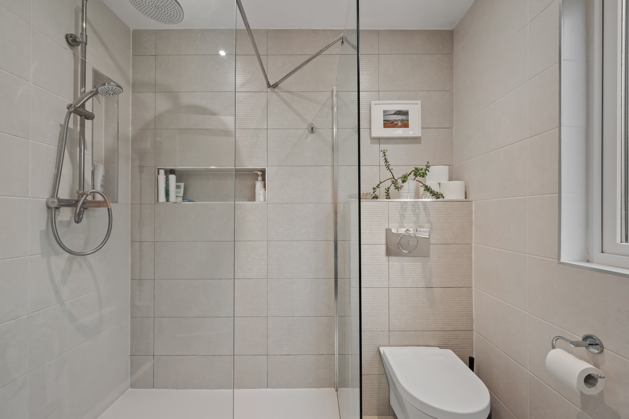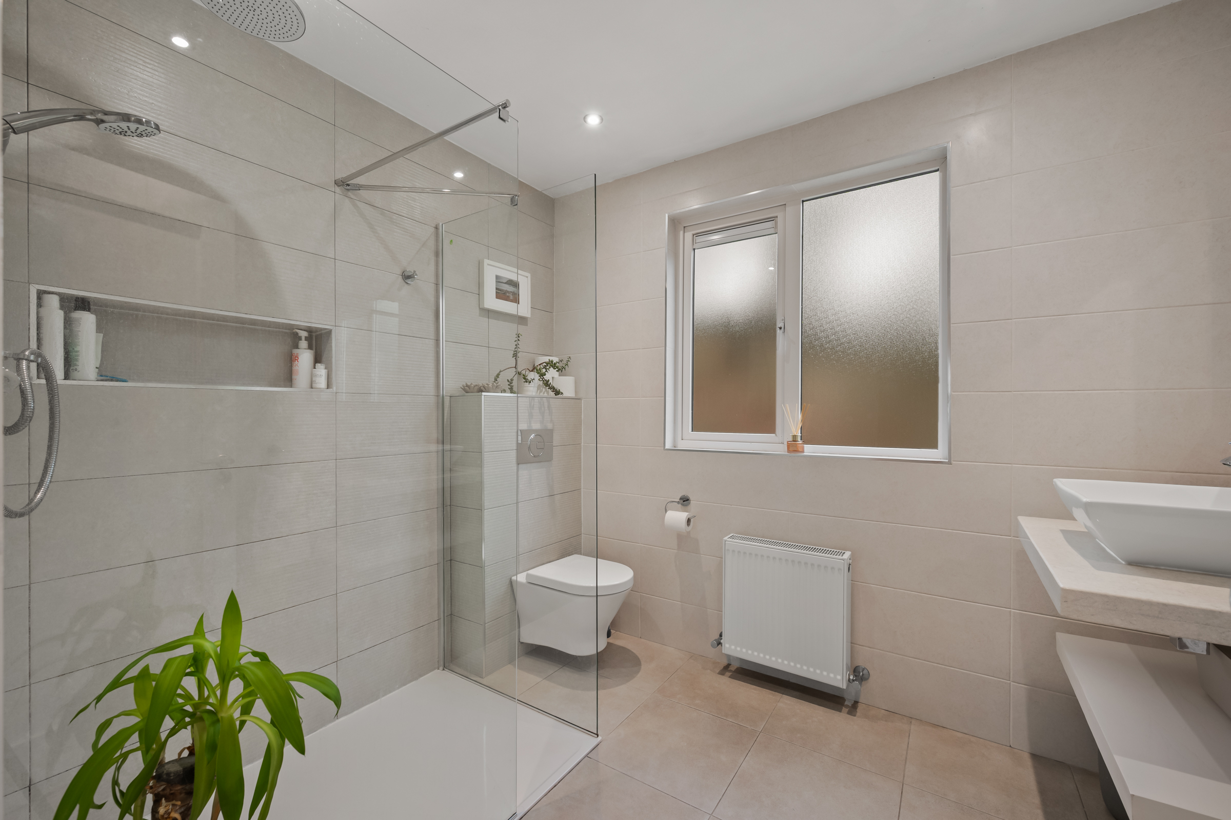 The modern family bathroom features a three piece suite including a large walk-in shower cubicle incorporating a power shower off the mains, high quality floor and wall tiling, recessed spot lighting, attractive neutral décor, one radiator, and a frosted window to the rear.
