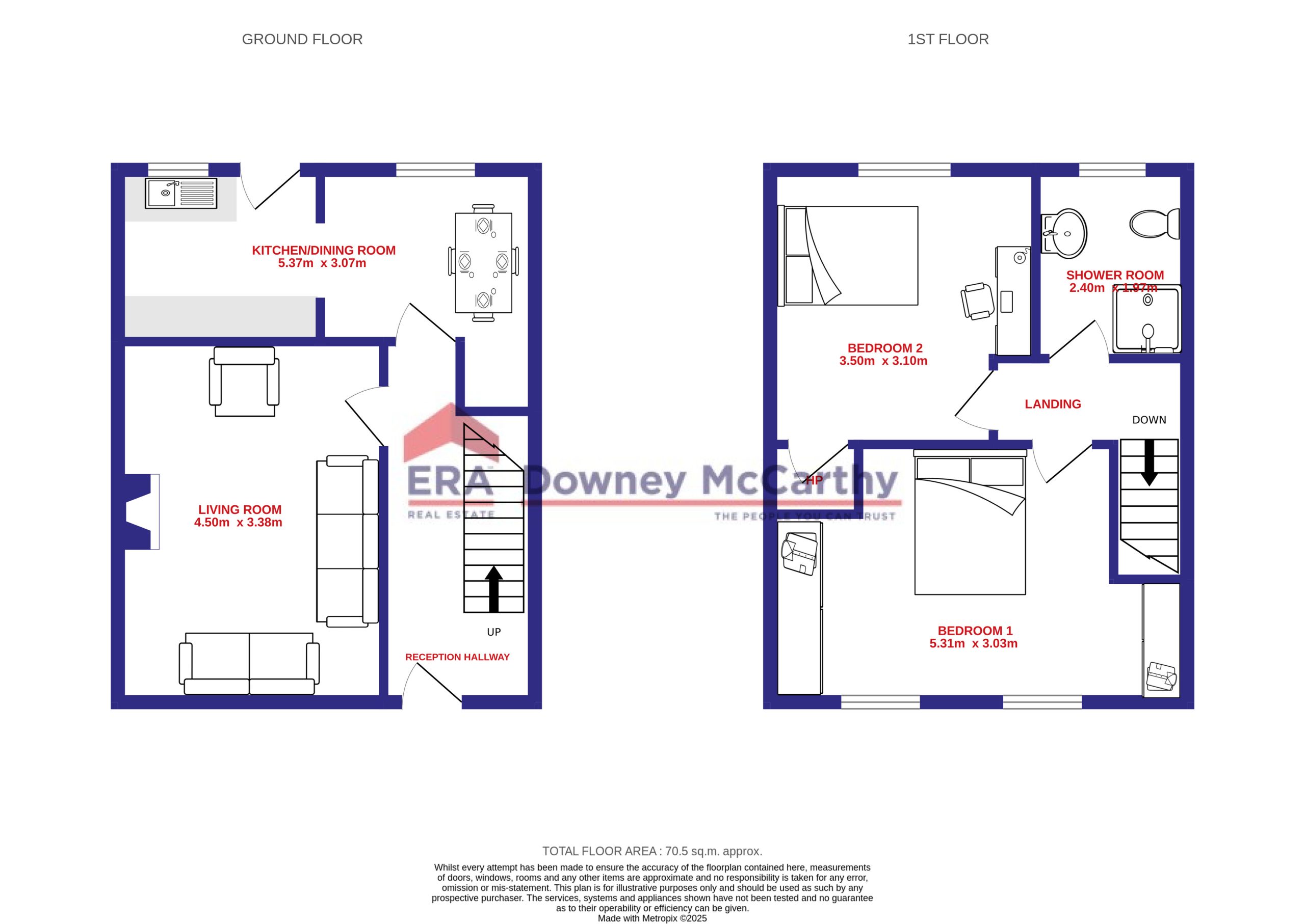 Accommodation consists of reception hallway, living room, and kitchen/dining area on the ground floor. Upstairs the property offers two spacious double bedrooms, and a newly modernised shower room.
