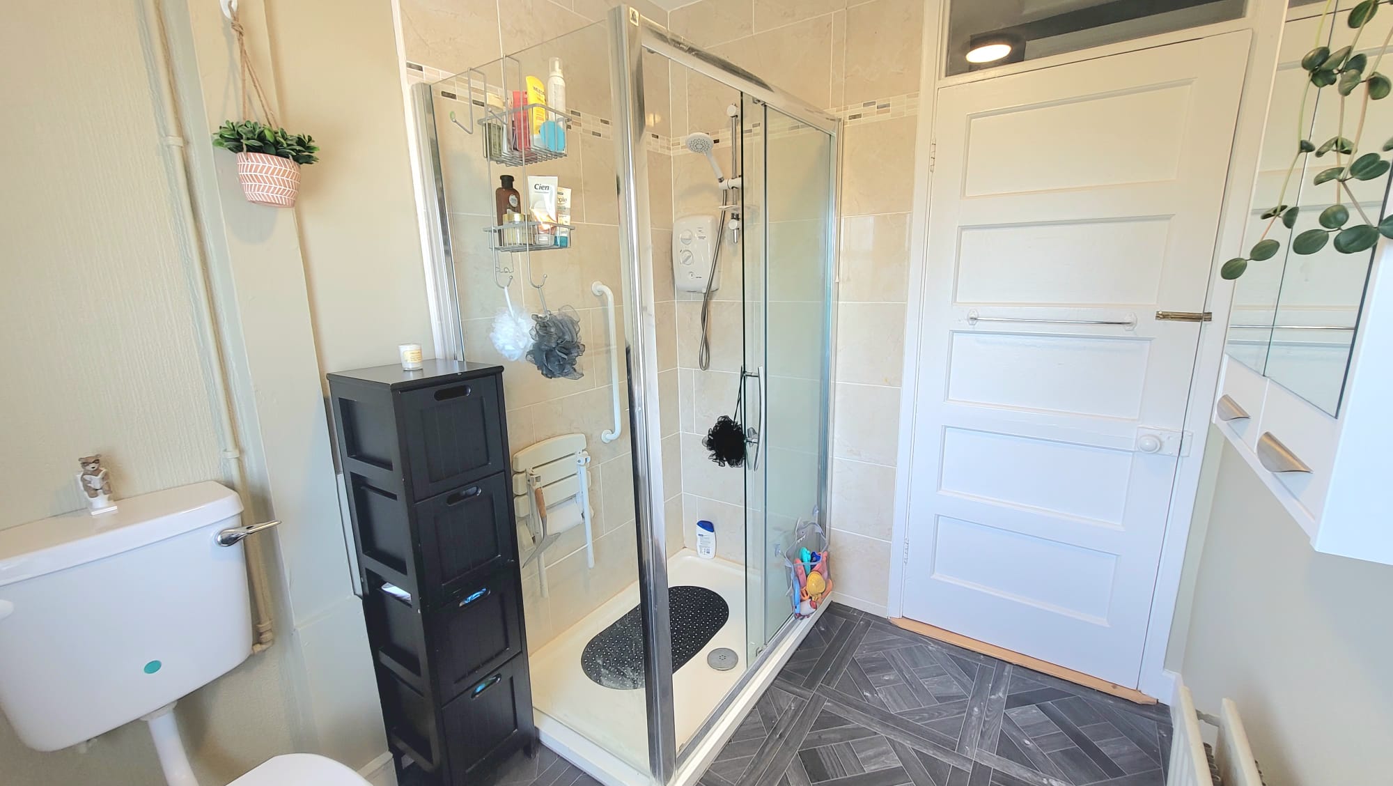 The newly modernised shower room features a three piece suite including a double corner shower cubicle incorporating attractive modern wall tiling and a Triton T80Z electric shower. The room has vinyl timber flooring, one window to the rear, one centre light piece, wall-mounted shelving, and one radiator.