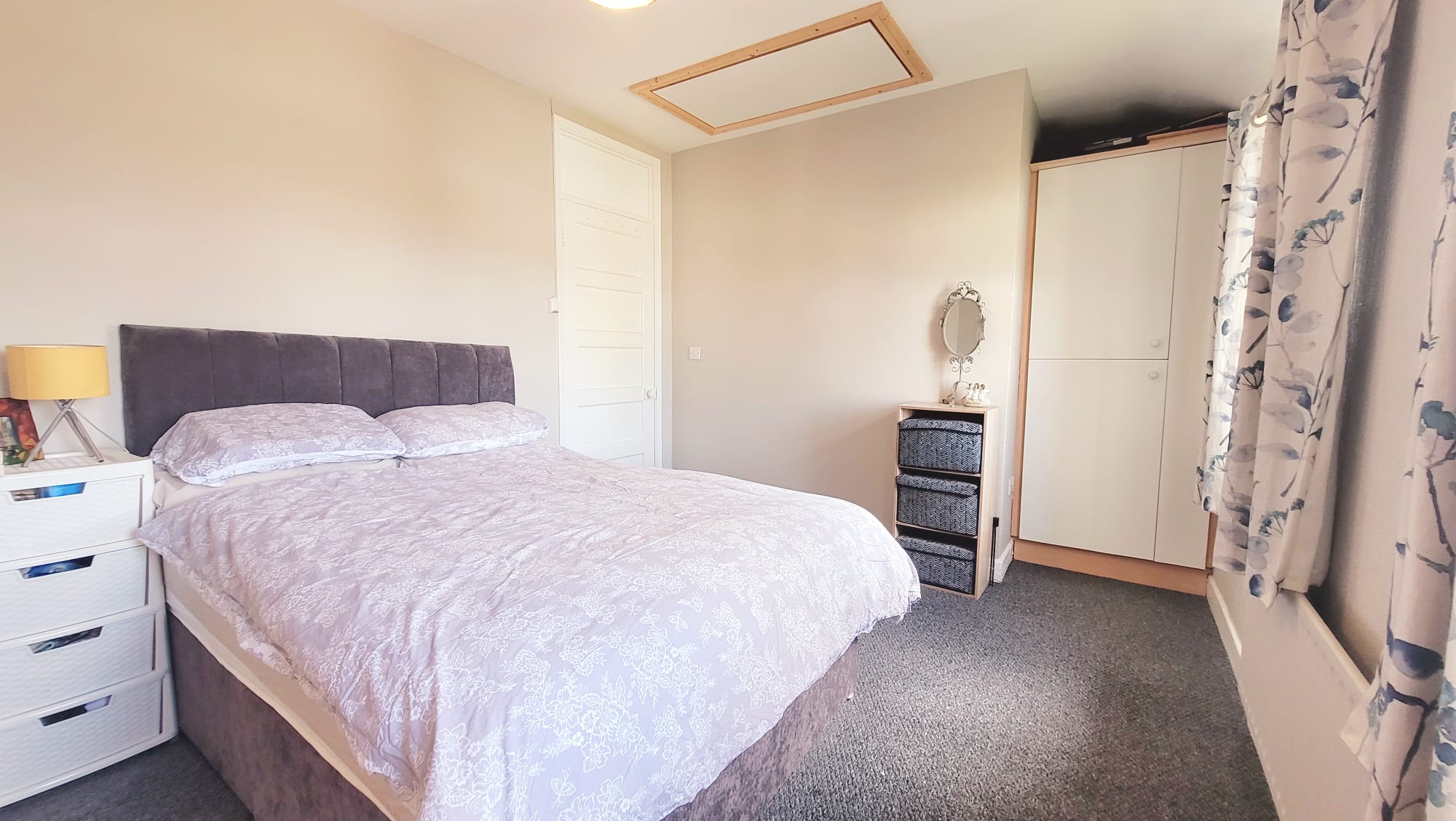 A spacious double bedroom has two windows to the front of the property, both including curtain rails and curtains. The room has high quality carpet flooring, extensive built-in storage space, one centre light piece, one radiator, eight power points, and one television point. A Stira staircase allows access to the attic from the room.