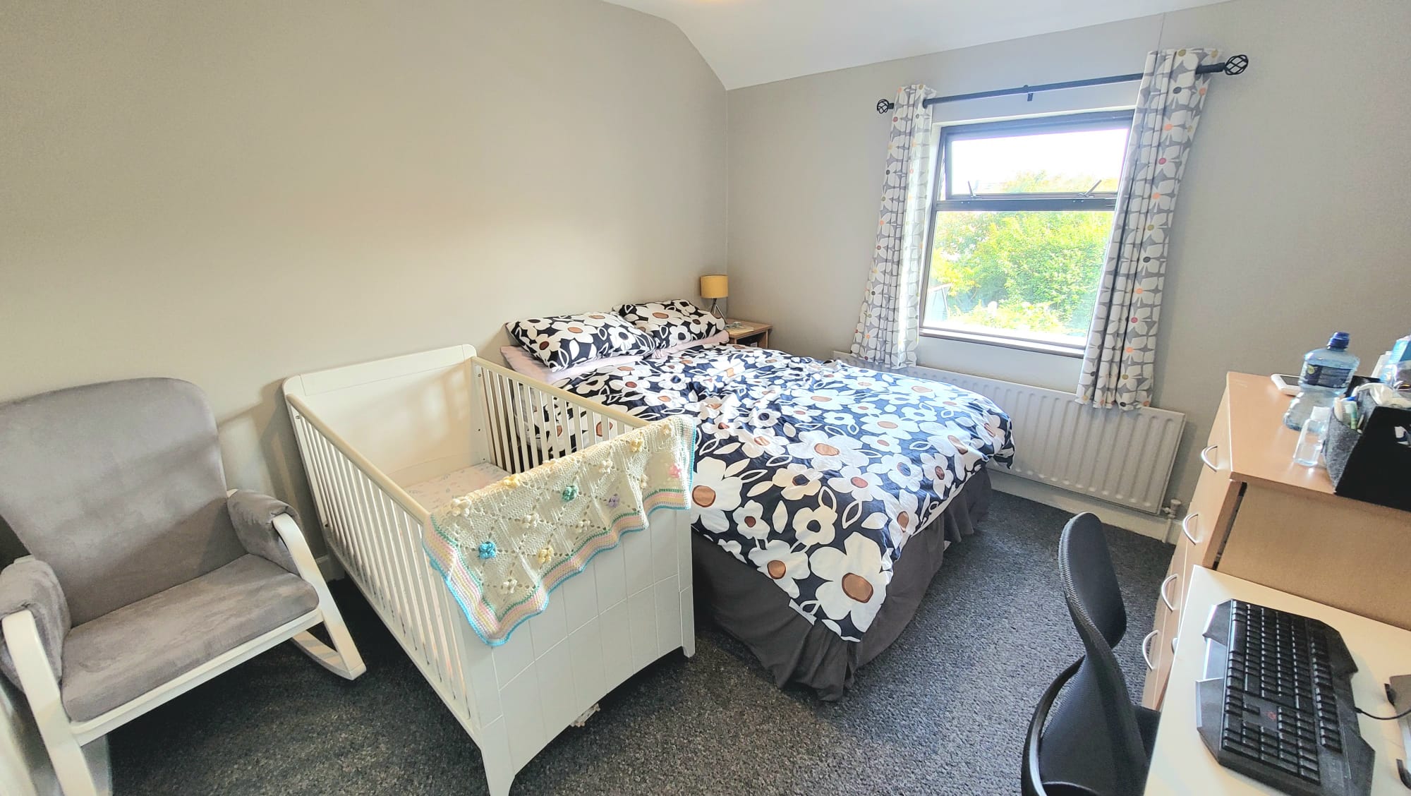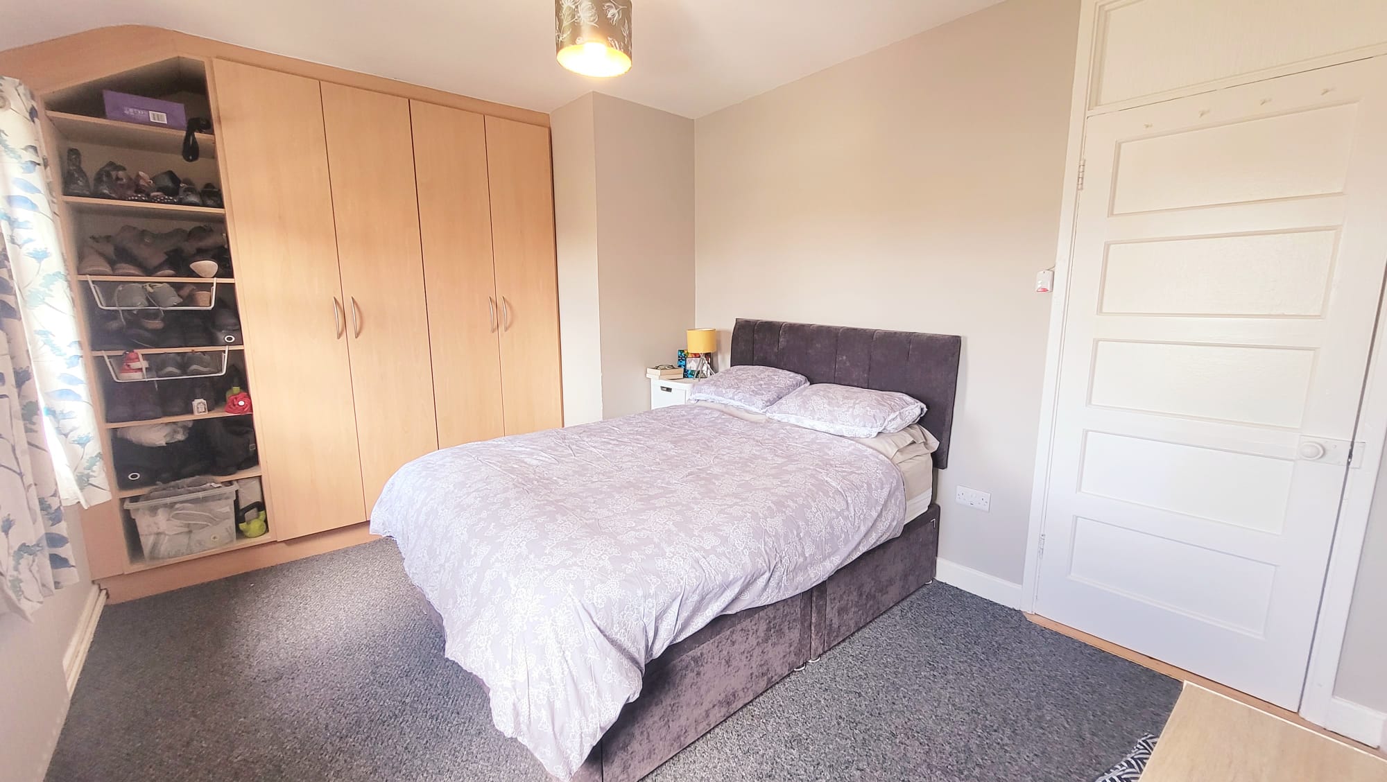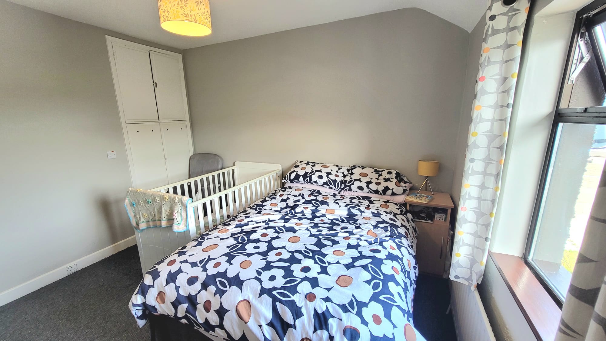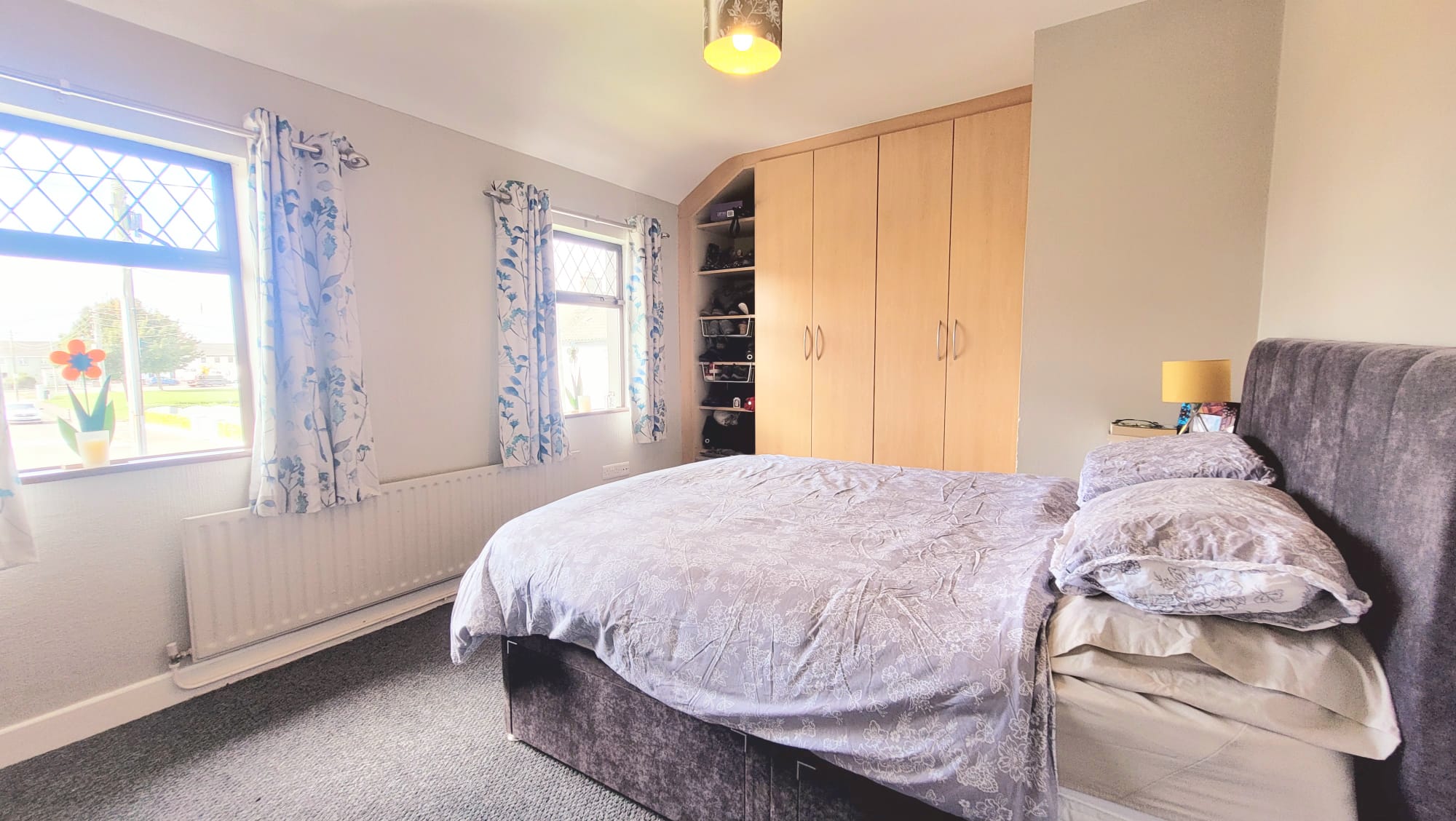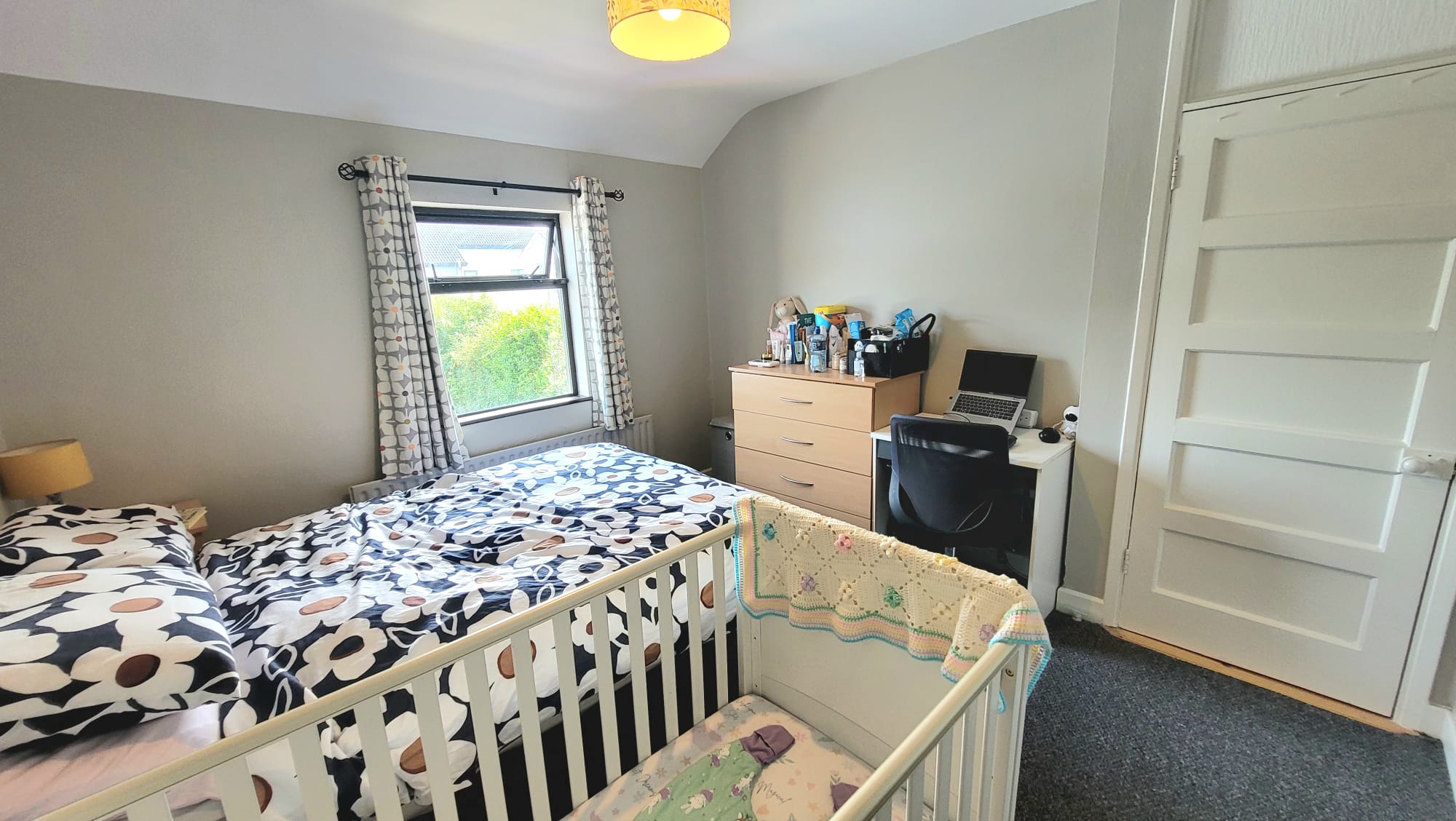 A spacious double bedroom has one window to the rear of the property including a curtain rail and curtains. The room has carpet flooring, attractive décor, one centre light piece, one radiator, eight power points, one television point, and a hot press area which is shelved for storage.