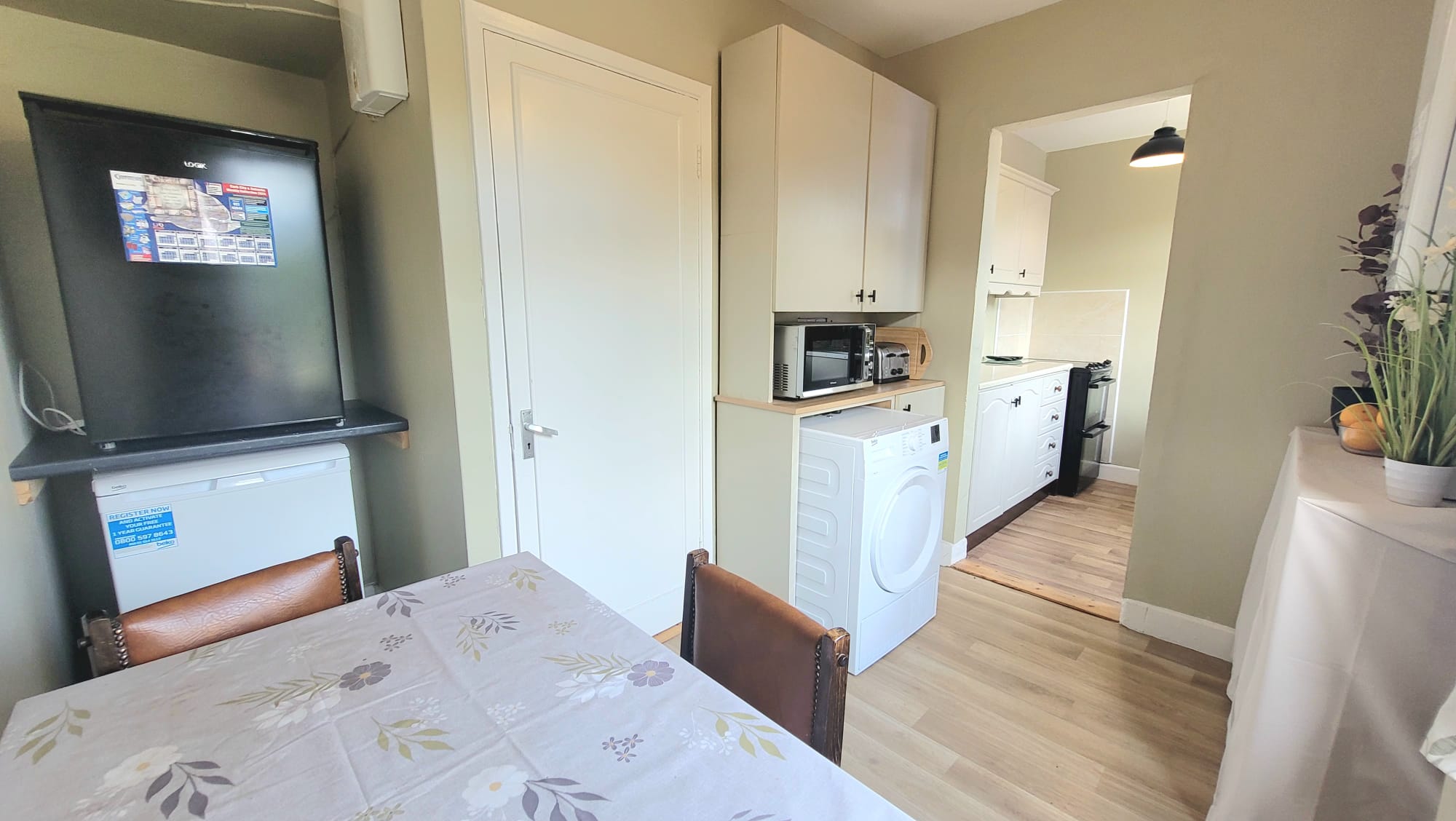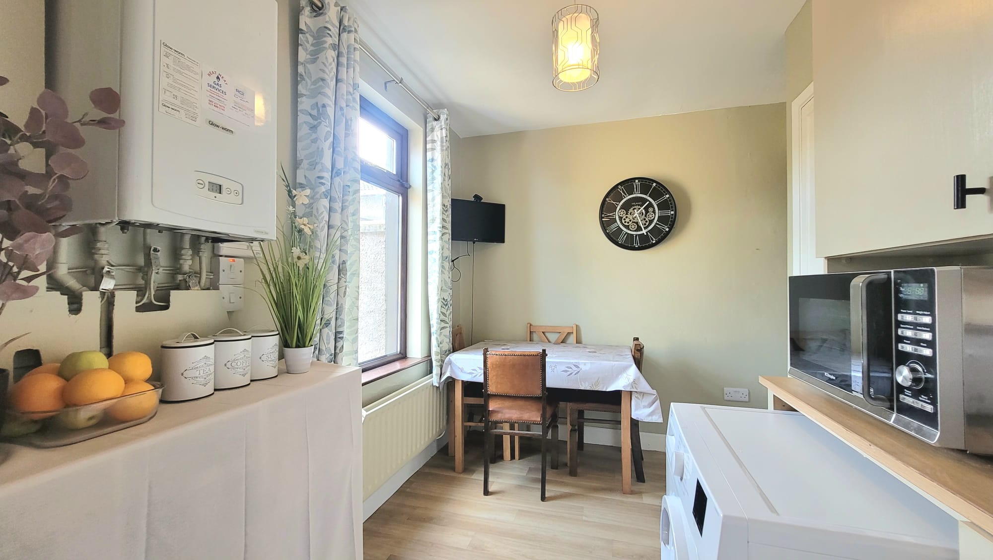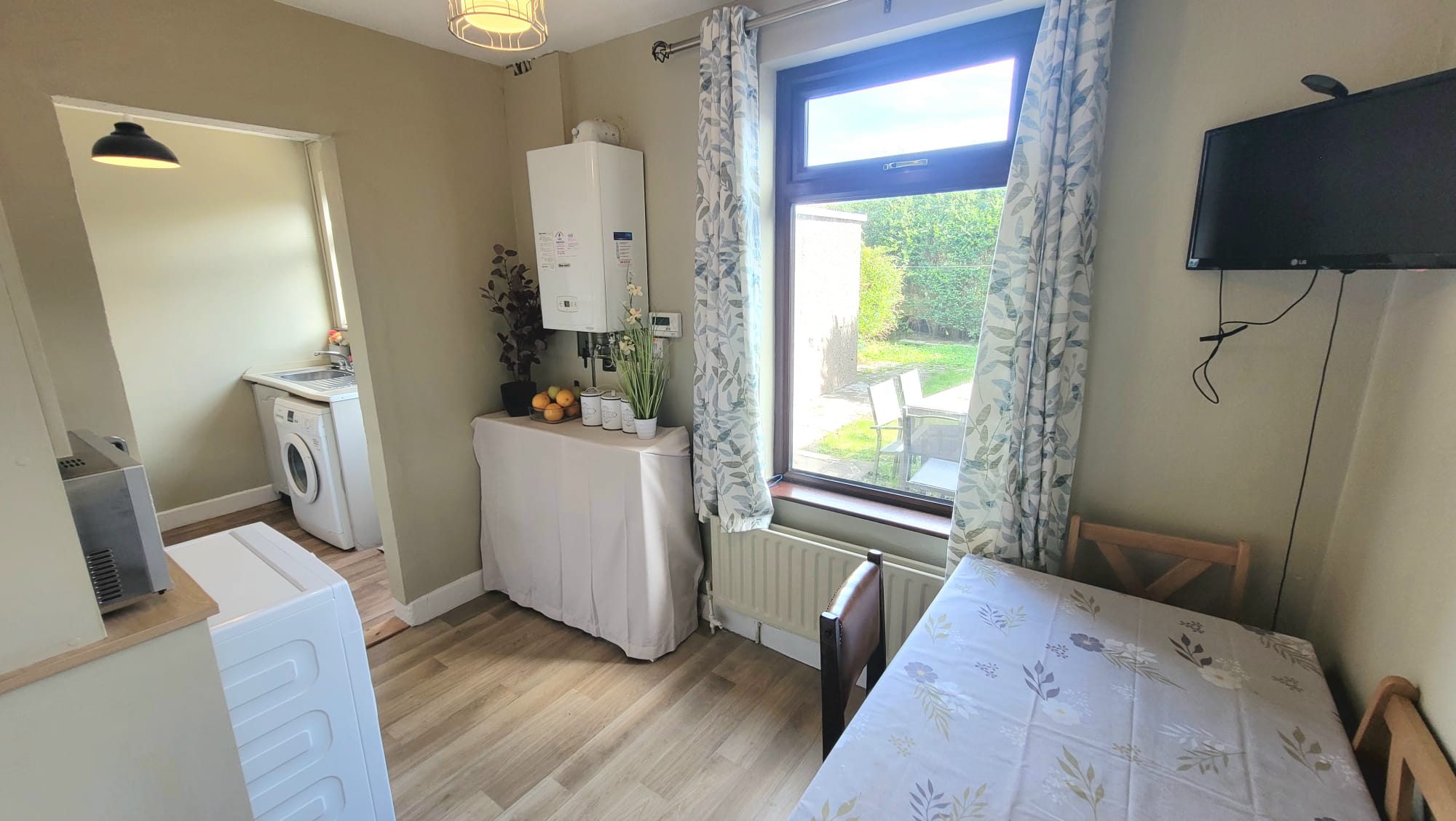 The L-shaped dining area has vinyl flooring, one window to the rear with curtain rail and curtains, one centre light piece, one large radiator, built-in storage, one television point, and four power points.