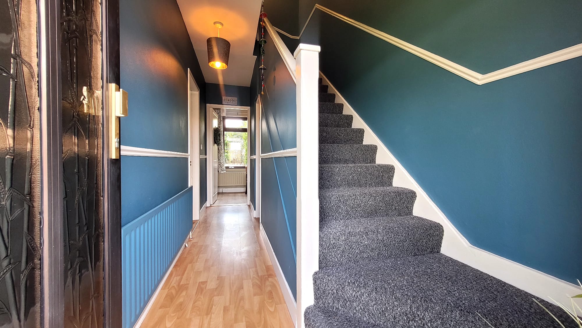 A aluminium door with glass centre panelling allows access to the main reception hallway. The area has attractive décor with high quality laminate timber flooring, one centre light piece, one radiator, extensive under stair storage, and four power points.