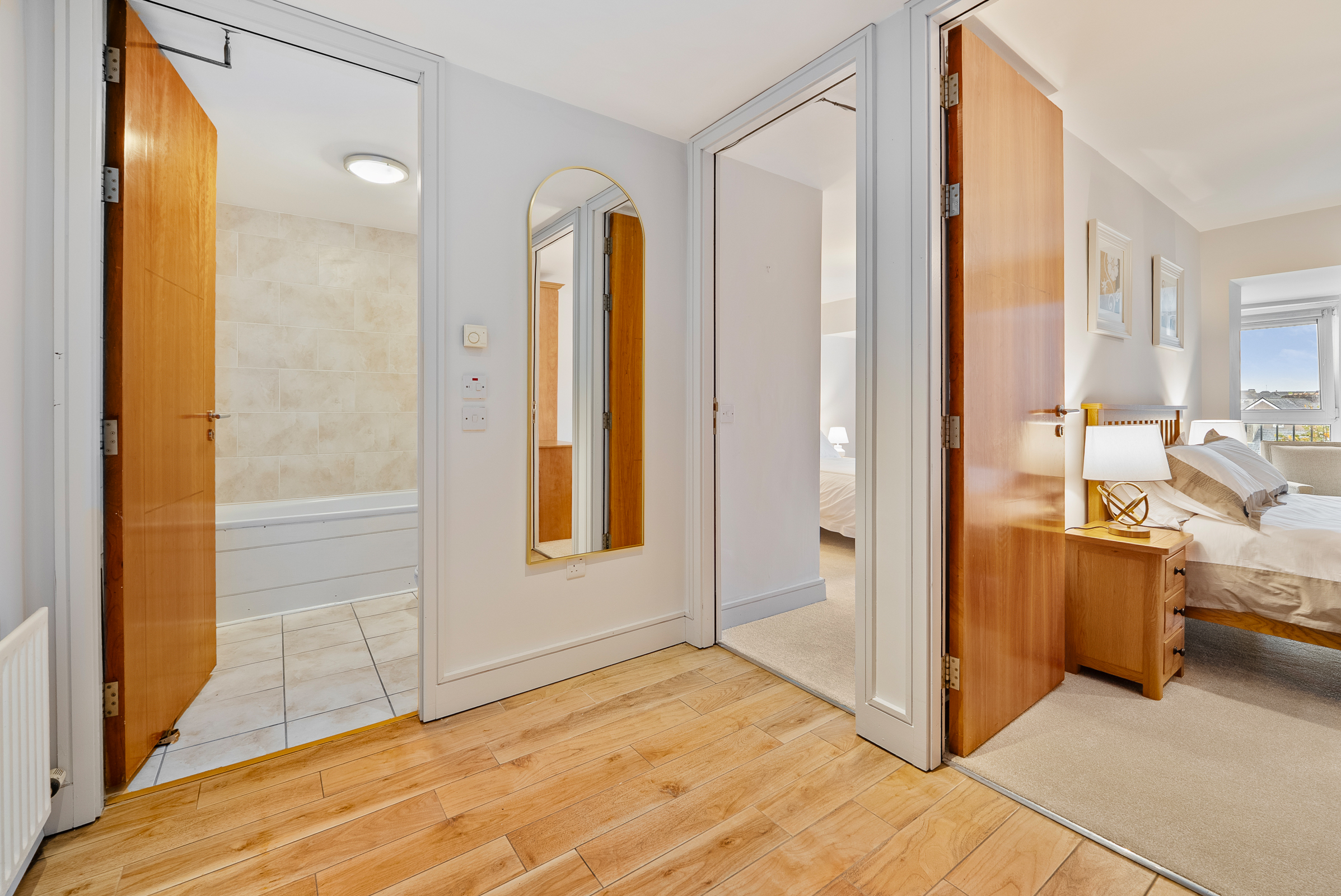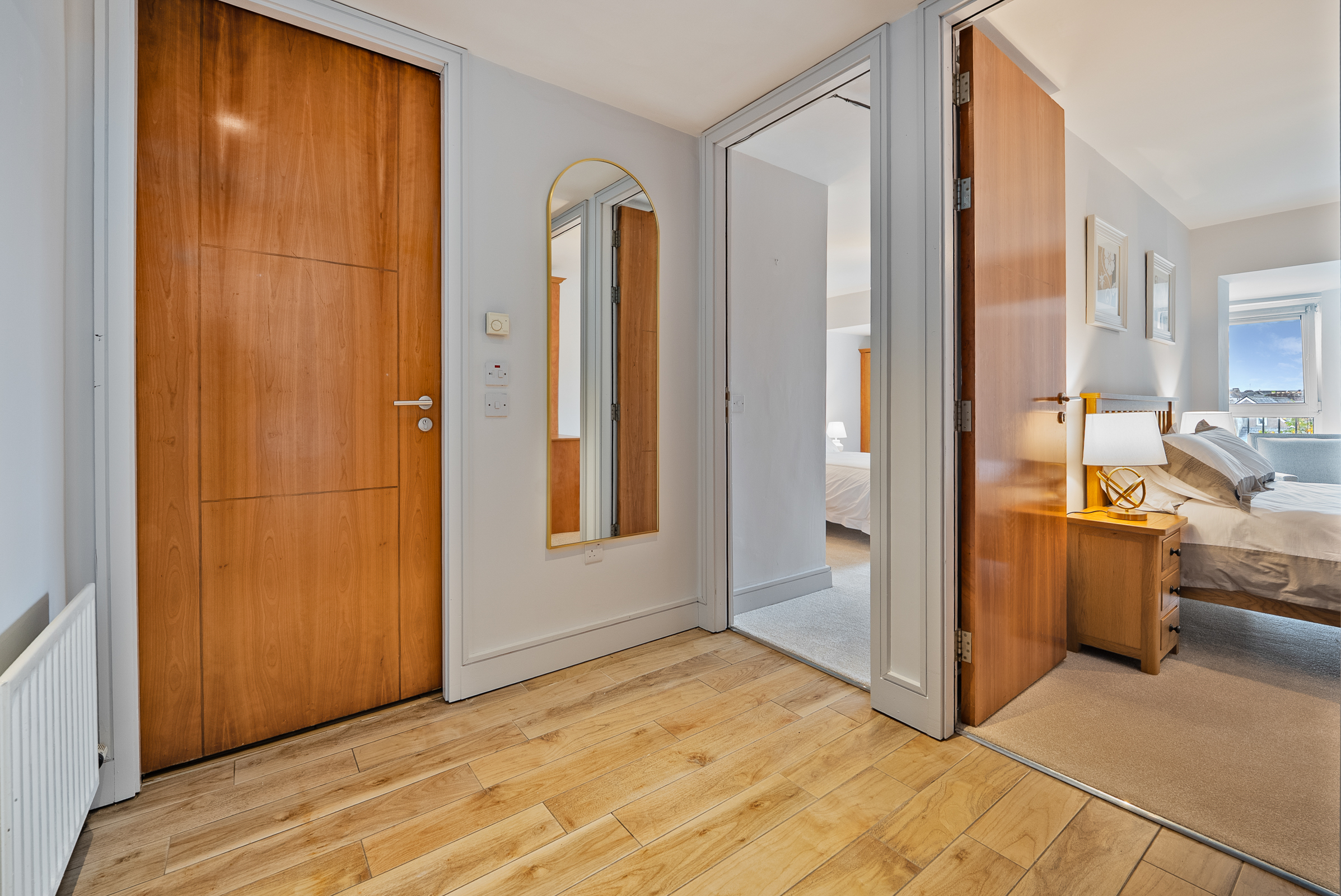A timber door allows access to the main reception hallway. The hallway features high quality timber effect tile flooring, neutral décor, recessed spot lighting, power points, access to the hot press, and one radiator.