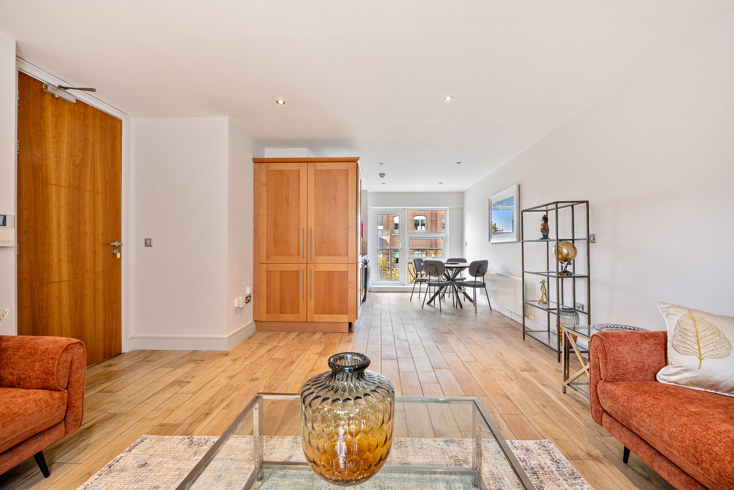 This is a beautiful and bright open plan kitchen/dining/living area which features recessed lighting, high quality timber effect tile flooring, and neutral décor throughout. The room is dual aspect, with one window overlooking the front of the property, and a glass door and accompanying window to the rear allows access to the west facing balcony area.