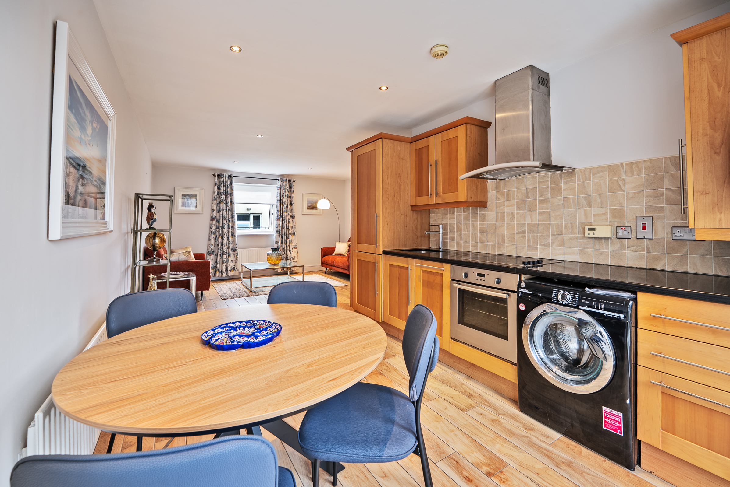 The kitchen/dining area features modern fitted units at eye and floor level work, with worktop counter and tile splashback. The kitchen includes an integrated oven/hob/extractor fan, integrated fridge freezer, a stainless steel sink, plumbing for a washing machine, and power points. There is one large radiator and a smoke alarm.