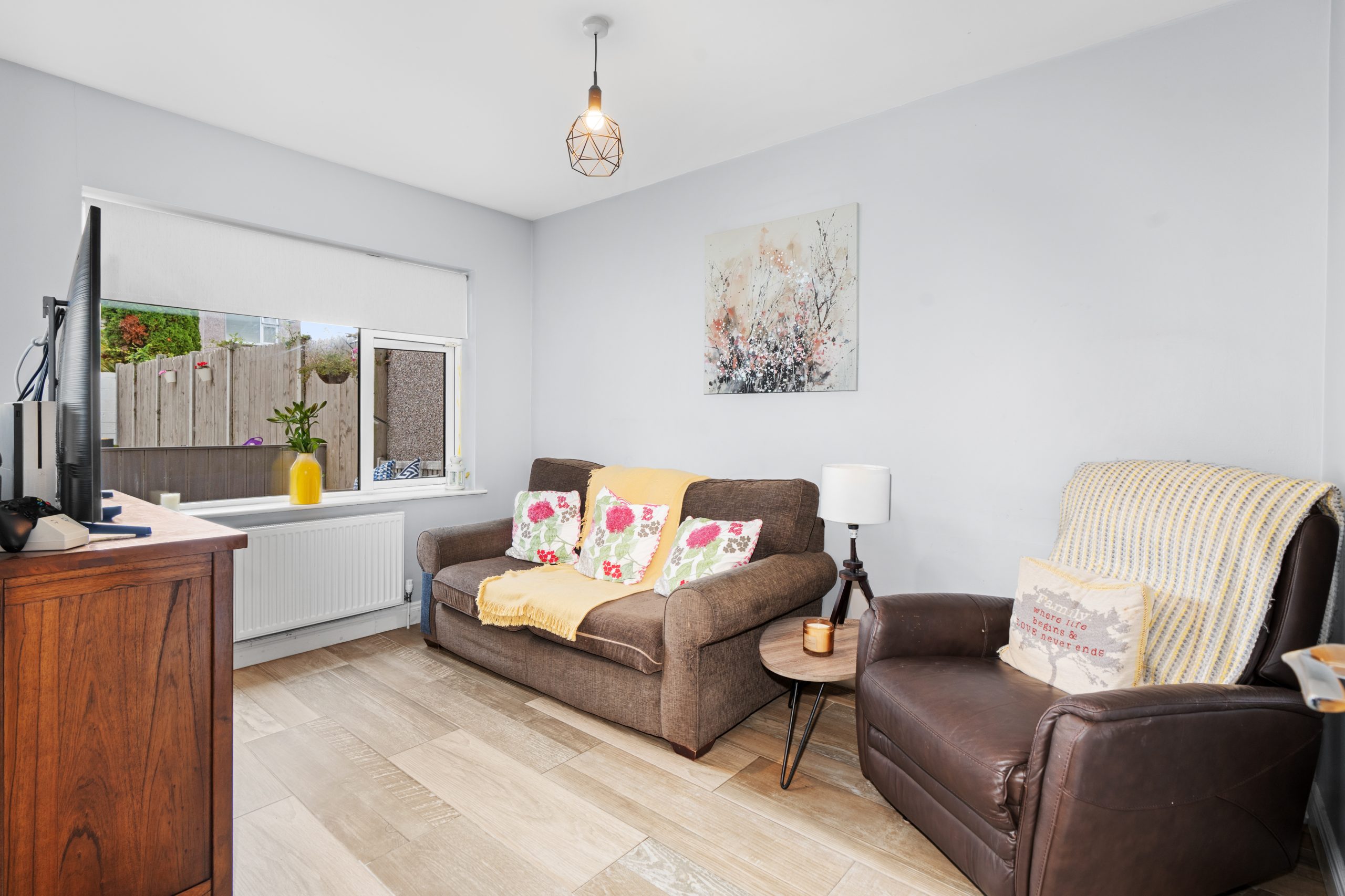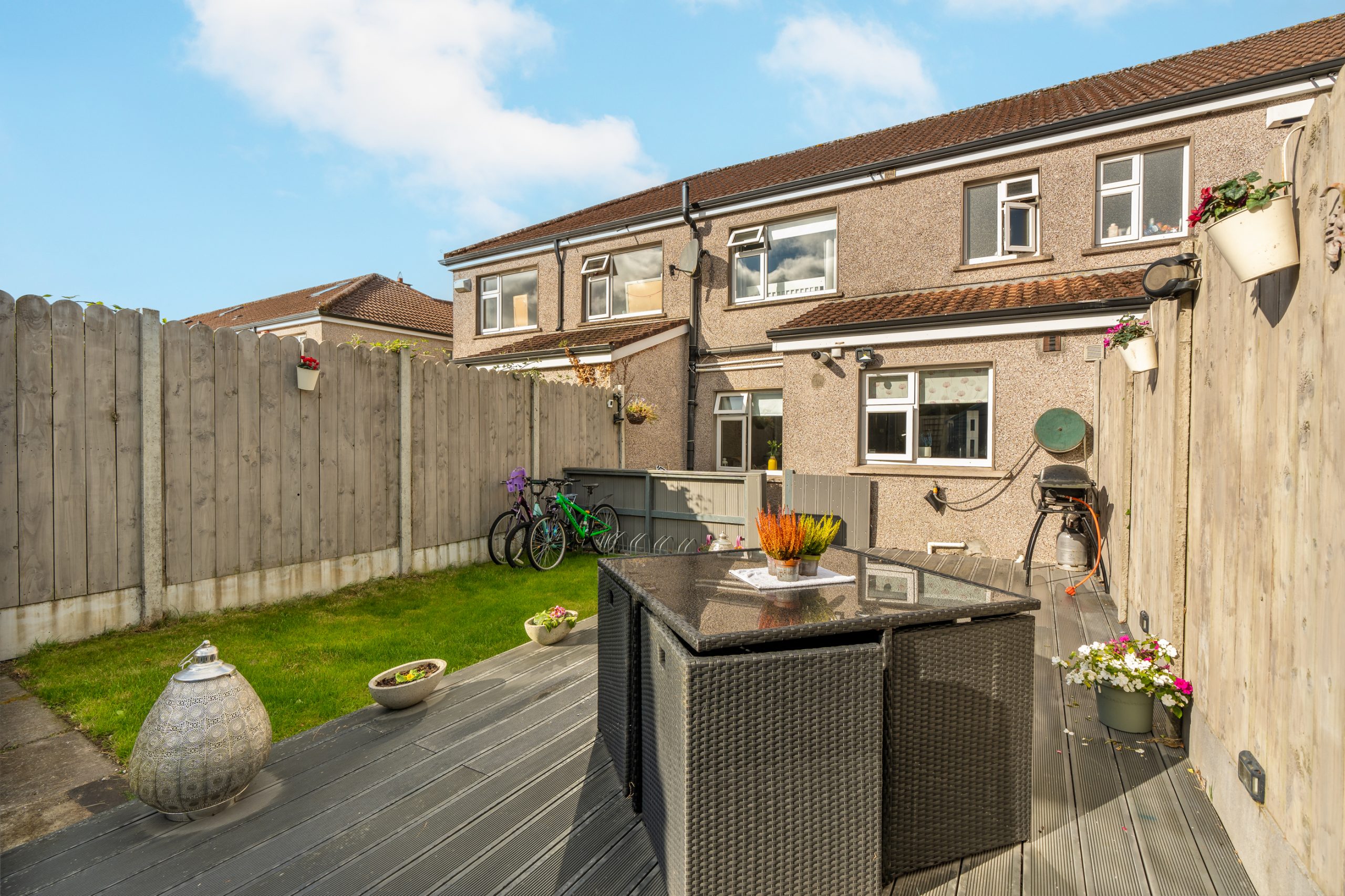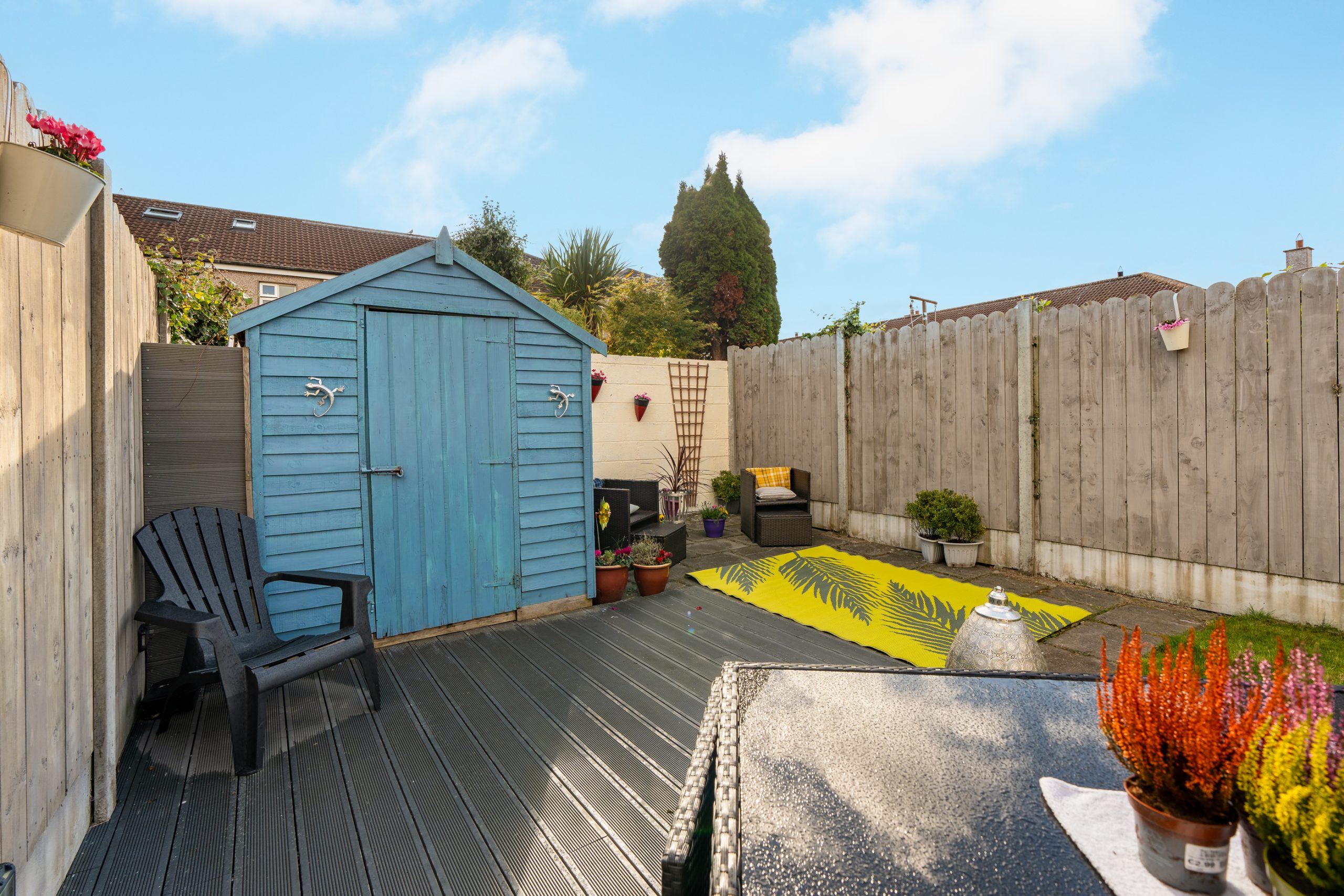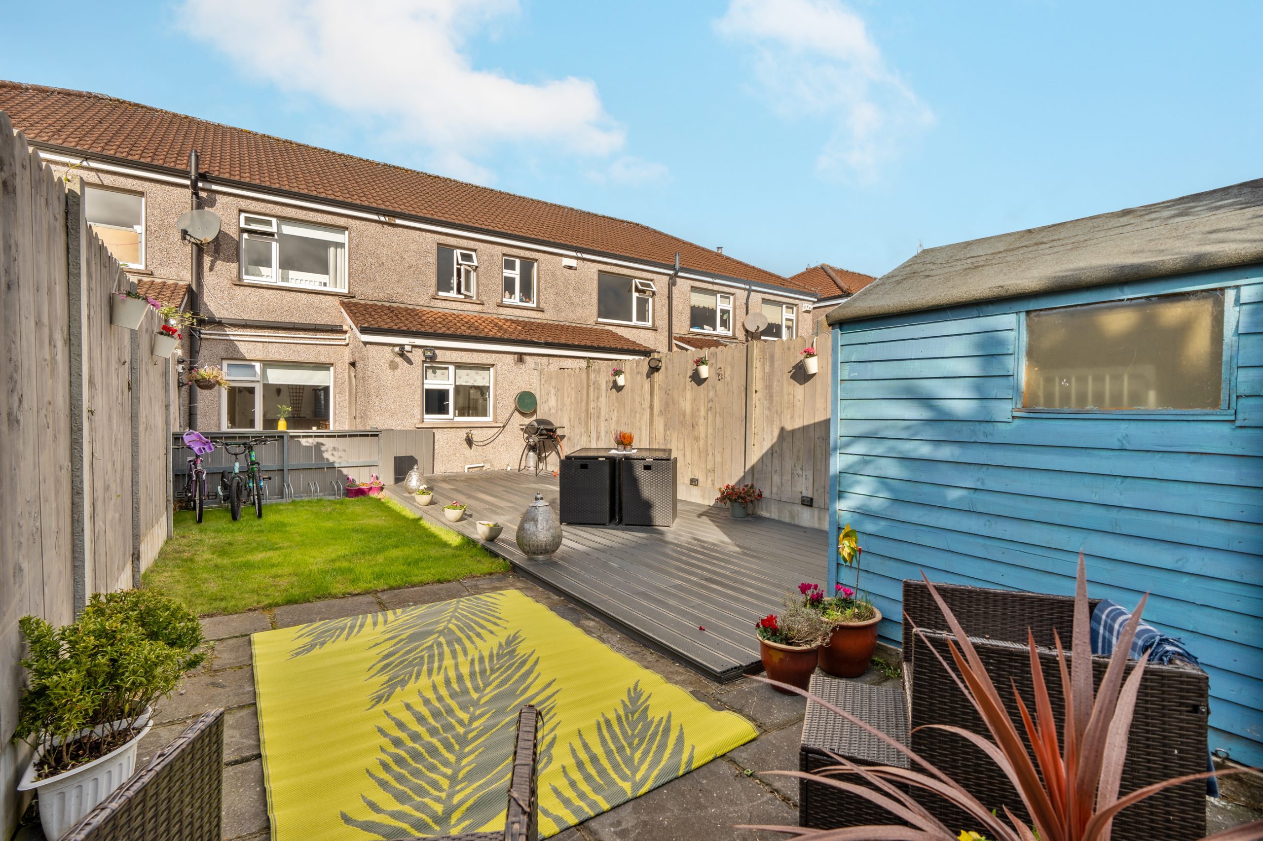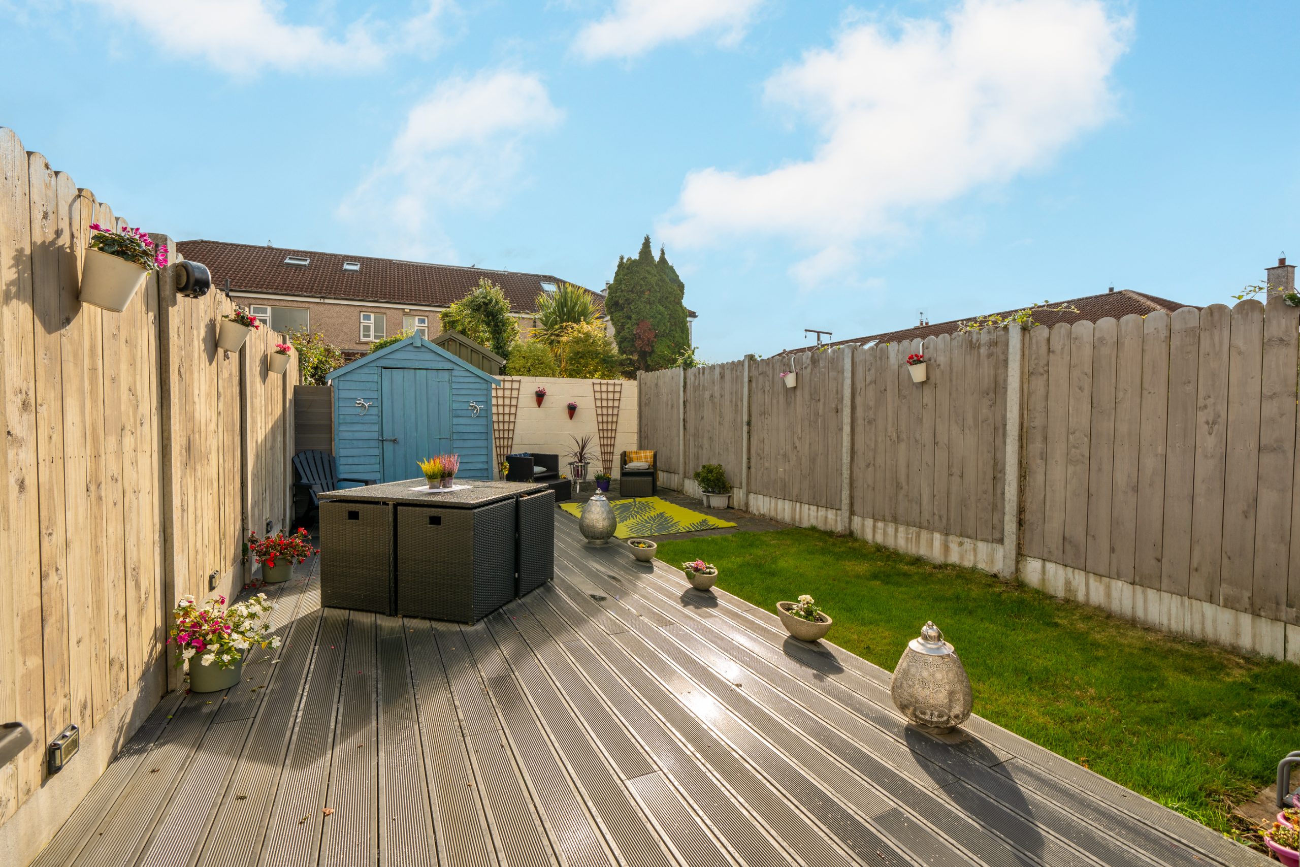 The rear of the property is fully enclosed on all sides. There is a superb patio area and raised decking which are ideal for outdoor entertaining, a well-maintained garden area which is laid to lawn, and a Barna shed for storage.