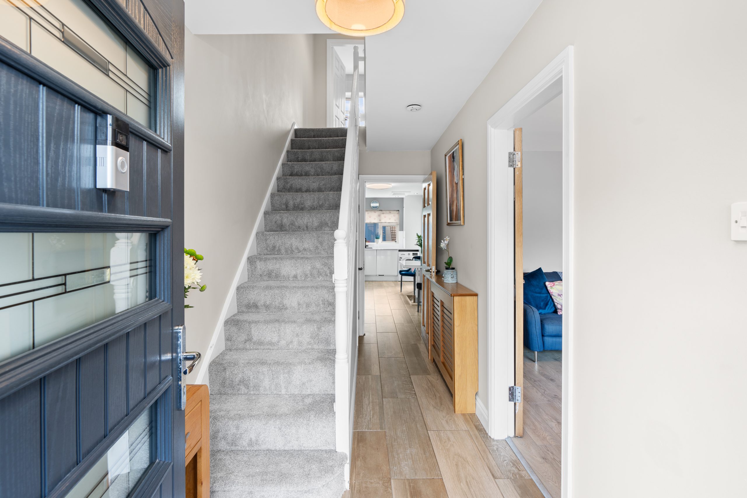 A solid door with impressive glass panelling on either side allows access into the main reception hallway. The hallway has high quality tile flooring, attractive neutral décor, one centre light piece, one radiator and a door allowing access into the guest w.c, living room and kitchen.