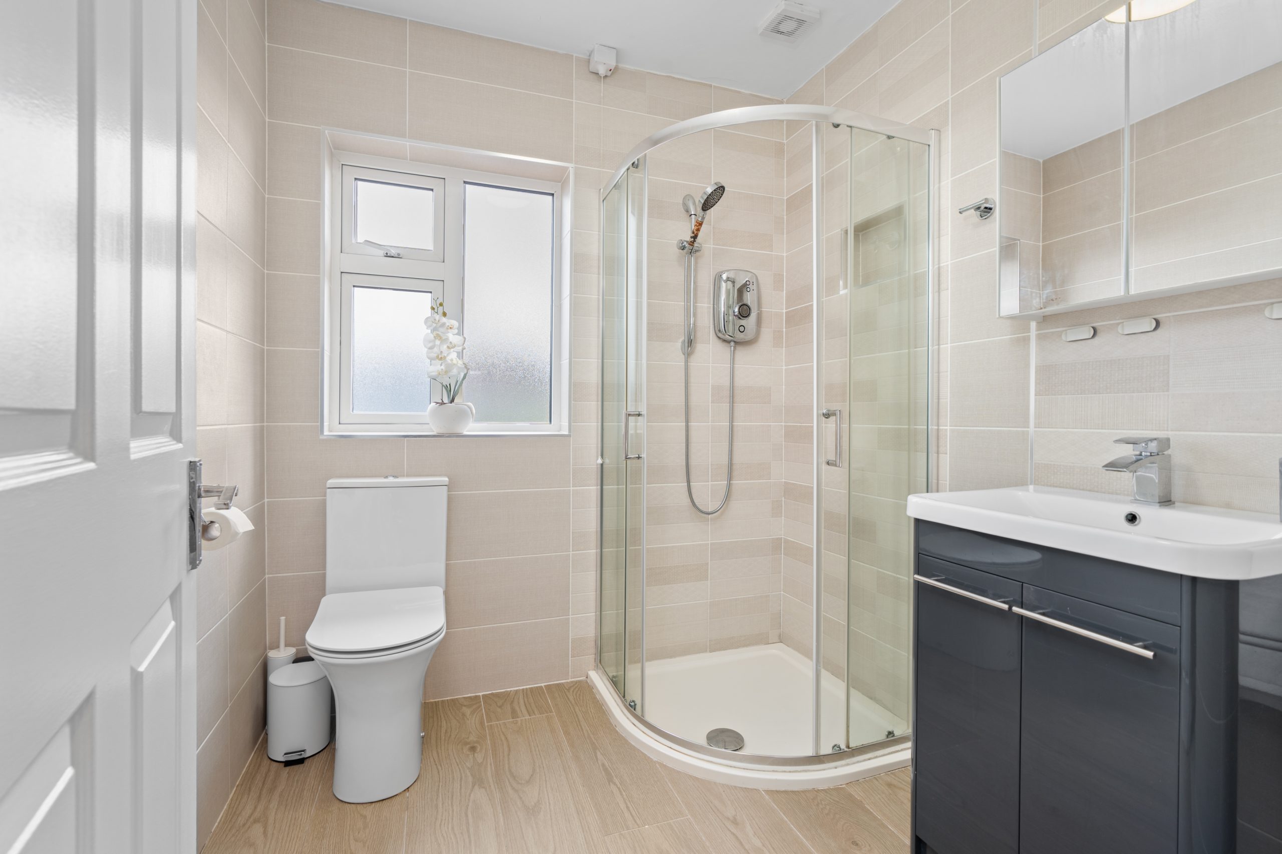 The main family bathroom features a three piece suite including a corner shower cubicle incorporating an electric shower, one window to the rear of the property, one centre light piece, modern floor and wall tiling, a wall-mounted heated towel rail, attractive neutral décor and one radiator.