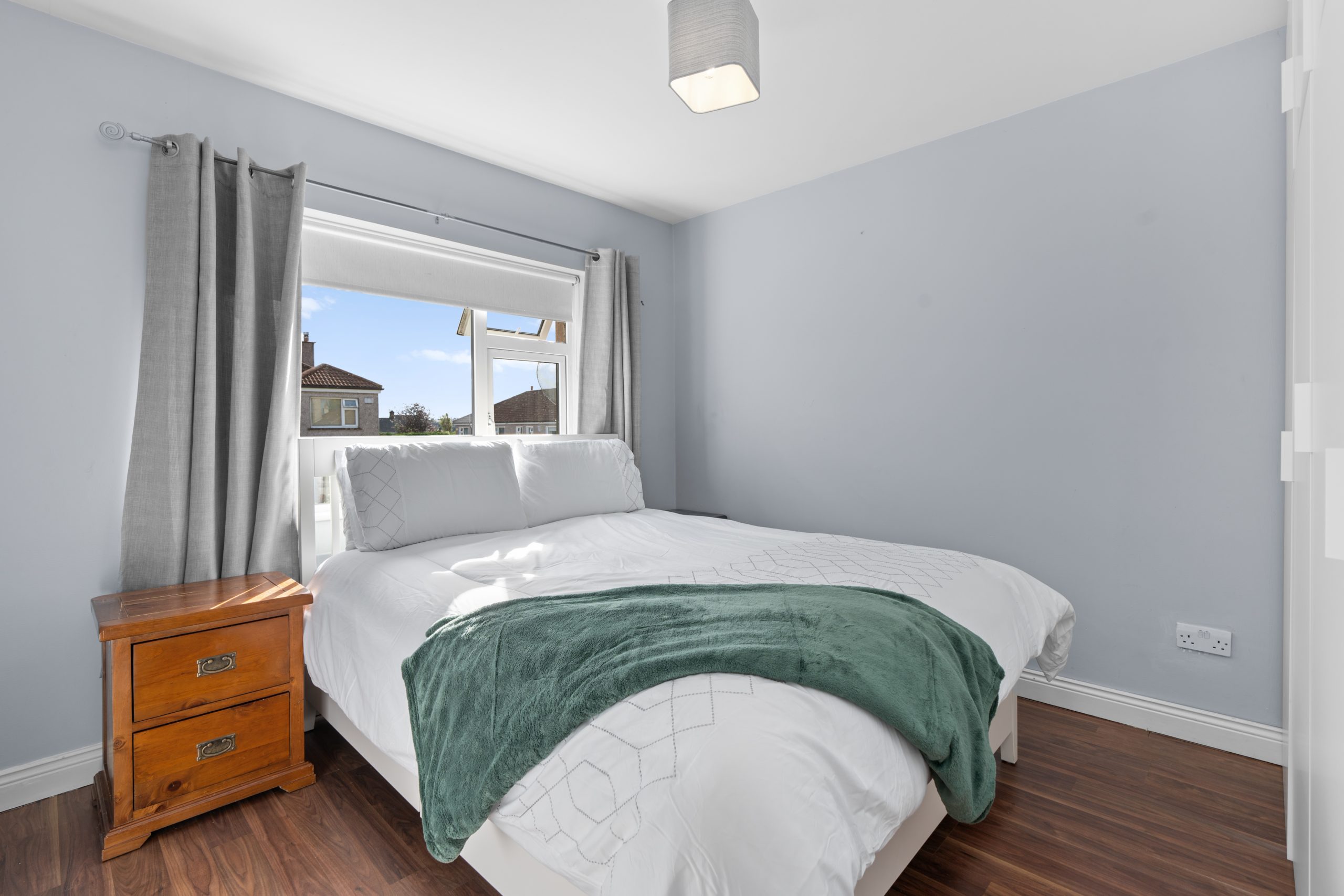 This double bedroom has one window to the rear of the property, one centre light piece, laminate flooring, one radiator, and neutral décor.