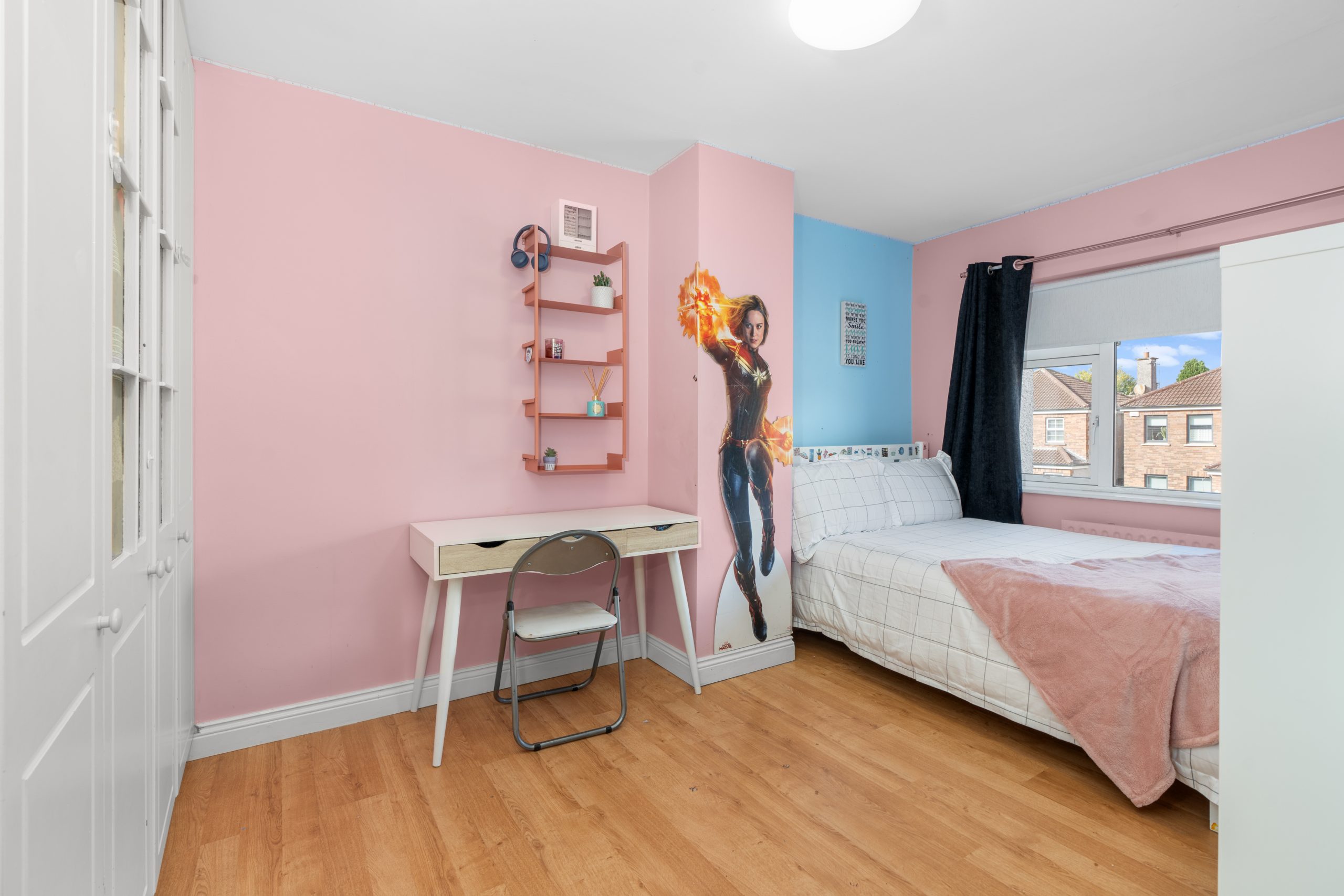 A spacious double bedroom has one window to the front of the property, one centre light piece, laminate flooring, built-in wardrobe units, one radiator and a charming children’s colour palette.