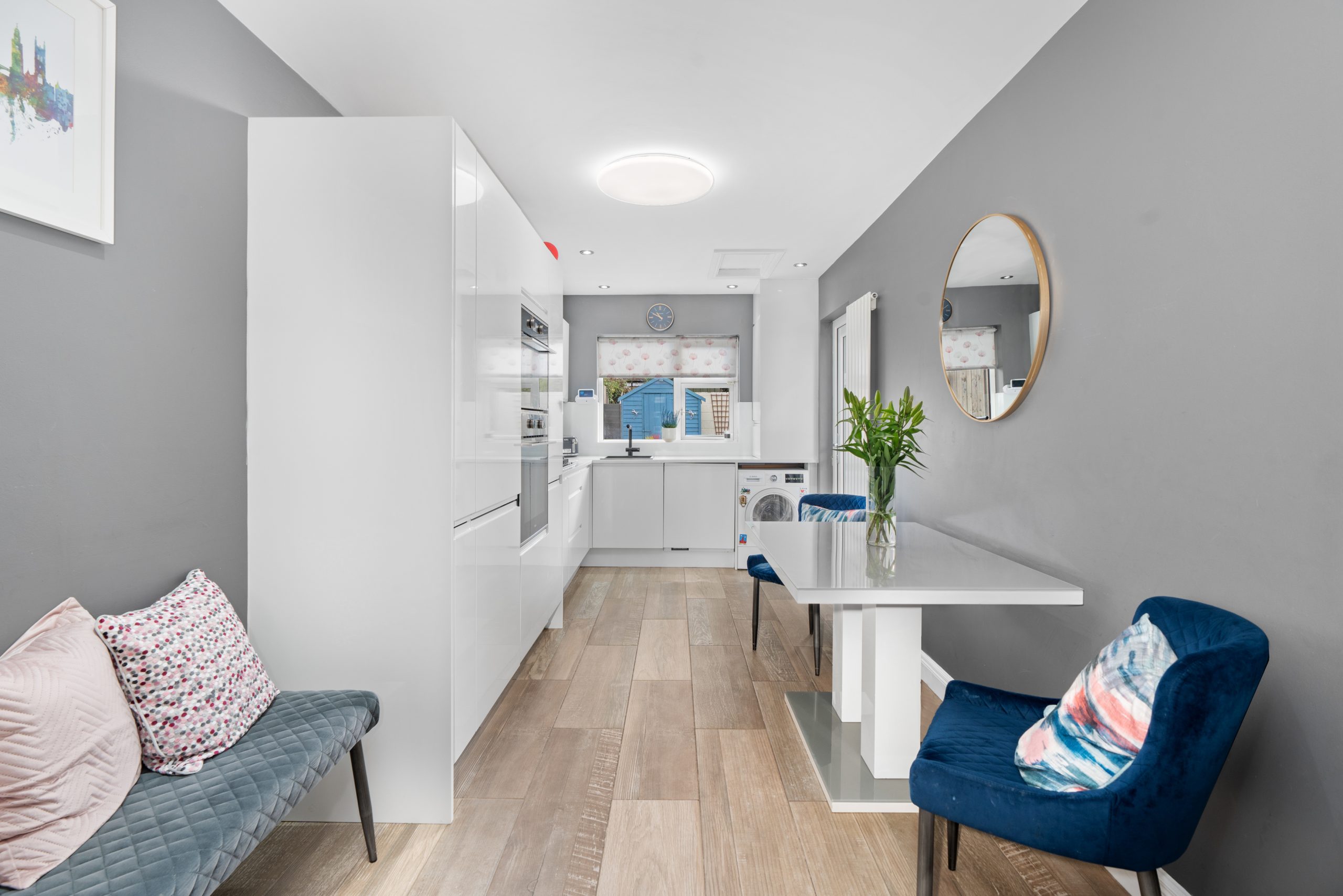 The bright kitchen/dining area has one window to the rear of the property and a glass panelled door allowing access to the rear garden. Throughout the room there is attractive neutral décor, high quality tile flooring, ample power points, one centre light piece and recessed spot lighting.