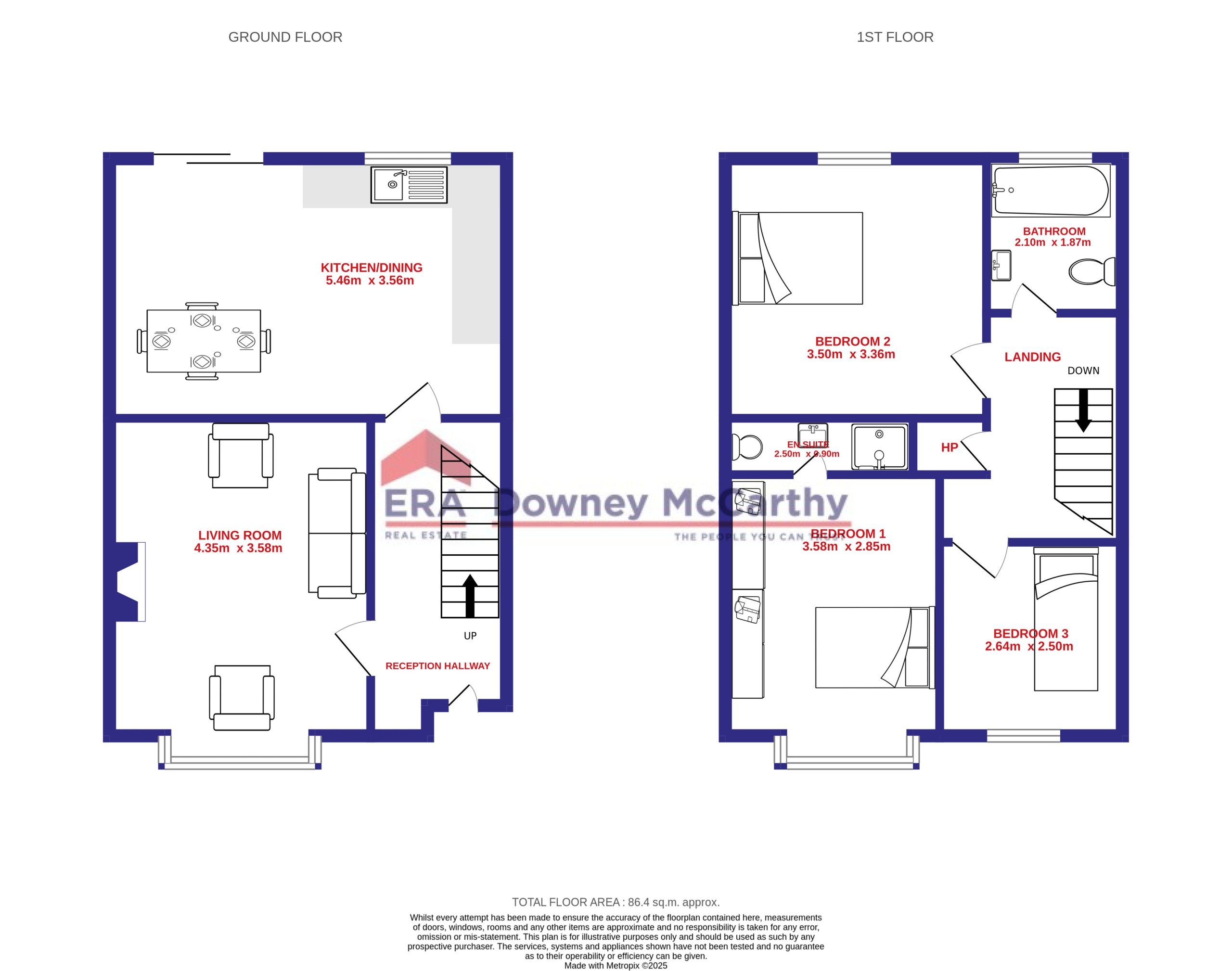 Accommodation consists of reception hallway, living room, and kitchen/dining area on the ground floor. Upstairs the property offers three spacious bedrooms, an en suite bathroom, and the main family bathroom.