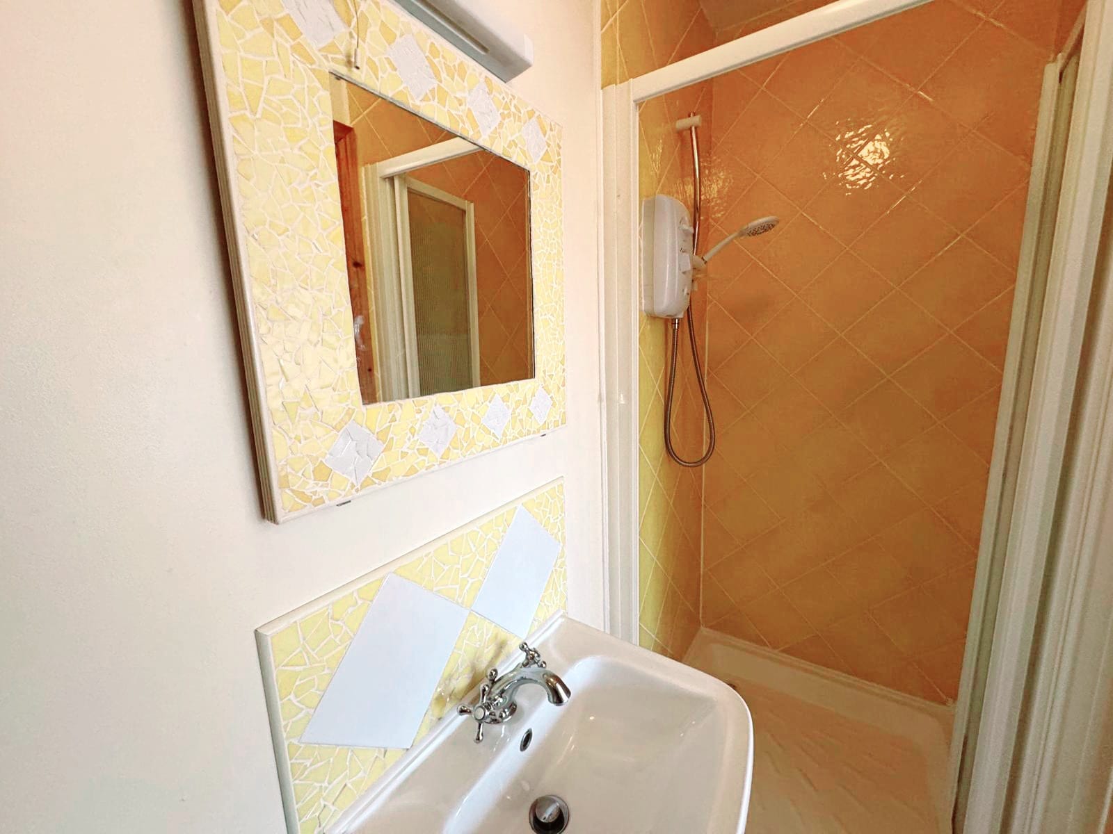 The en suite features a three piece suite including a Triton T80Z electric shower. The room has solid timber flooring, tiling surrounding the shower area, one centre light piece, one wall-mounted light piece, wall-mounted shelving with integrated storage, one radiator, and one extractor fan.