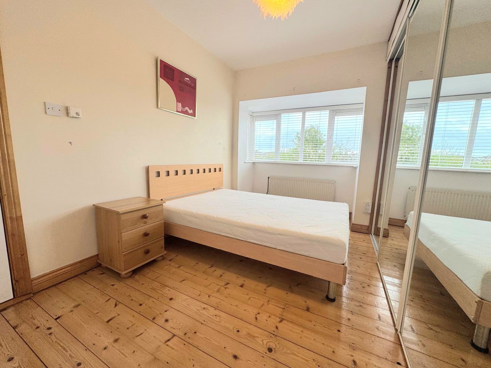 A spacious double bedroom has one window to the rear of the property, including a Venetian blind, a curtain rail, and curtains. The room has carpet flooring, one centre light piece, one large radiator, and two power points.