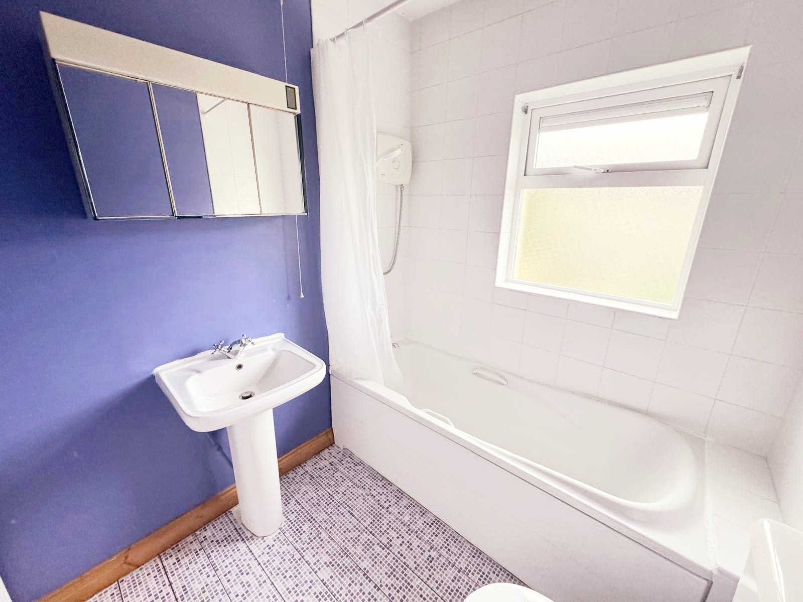 The family bathroom features a four piece suite including a Triton T90 XR shower fitted over the bath. The room has painted solid timber flooring finished as mosaic tiles, one window to the rear, tiling around the bath, one centre light piece, one extractor fan, and one radiator.