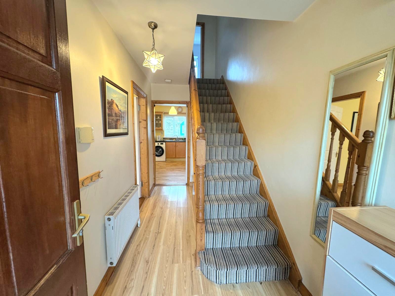 An open porch allows access to a teak door with glass side panelling, leading to the main reception hallway. The bright and spacious reception hallway has laminate timber flooring, attractive décor, one centre light piece, and one large radiator. The area has an alarm control point, one telephone point, four power points, and access to under stair storage.