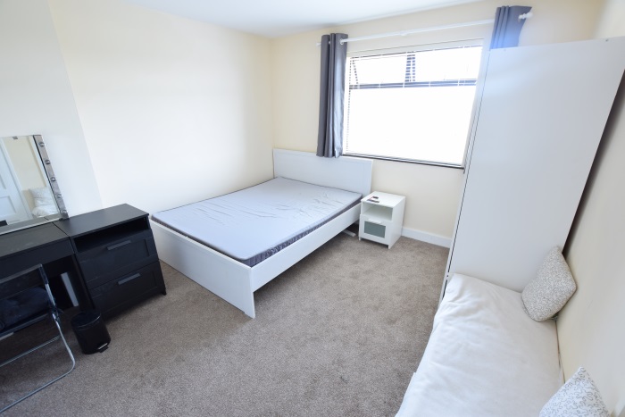 A large single bedroom has one window to the rear of the property, including a Venetian blind, a curtain rail and curtains. The room has carpet flooring, one large radiator, one centre light piece, and two power points.