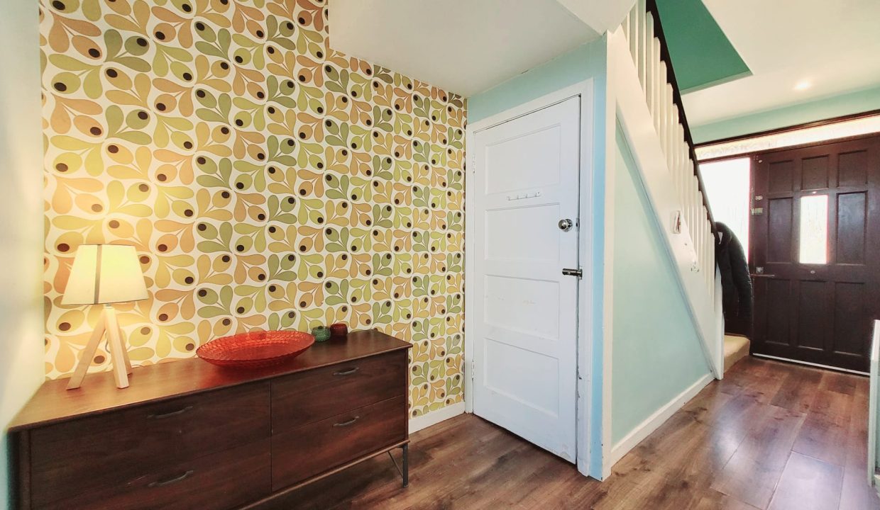 The hallway features attractive décor with high quality walnut laminate timber flooring, recessed spot lighting, and extensive under stair storage. The area has four power points, one radiator, one alarm control point, and a thermostat control for the heating.
