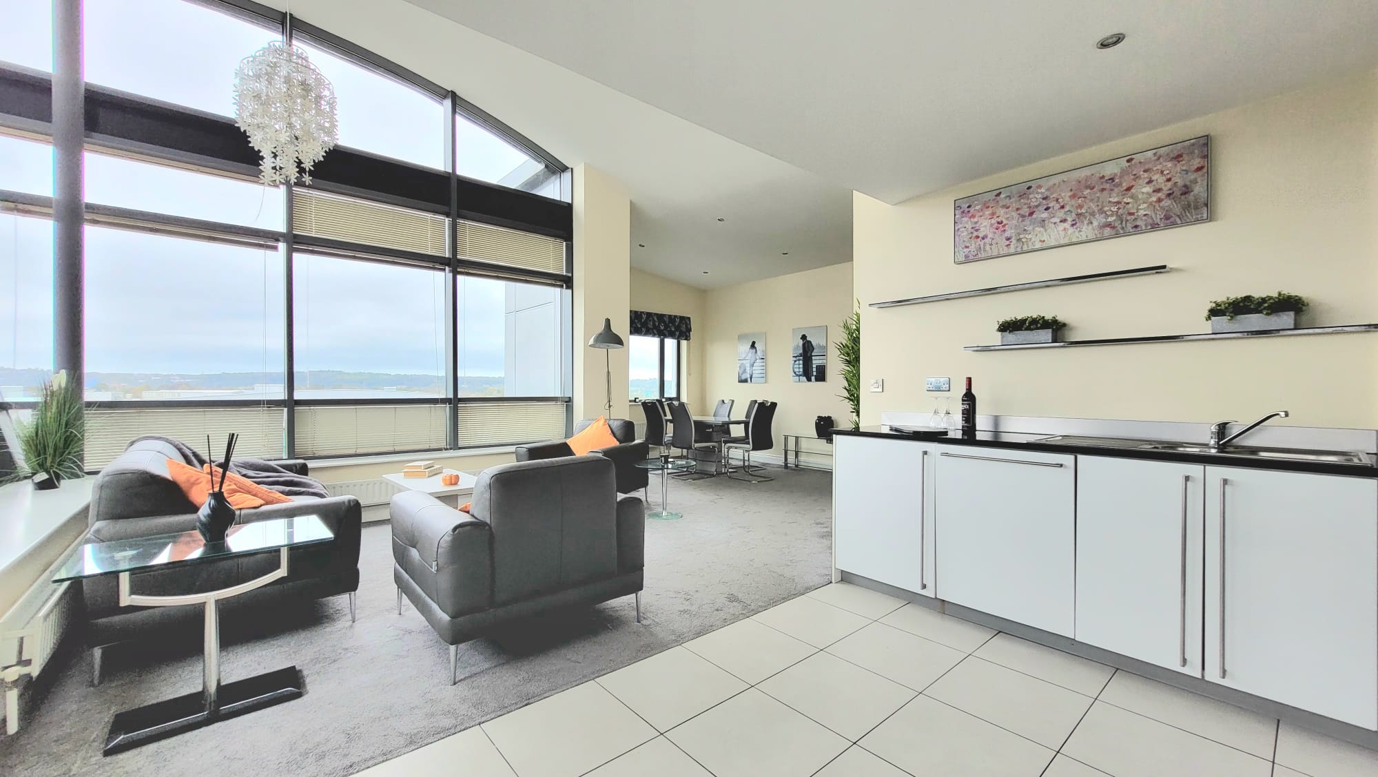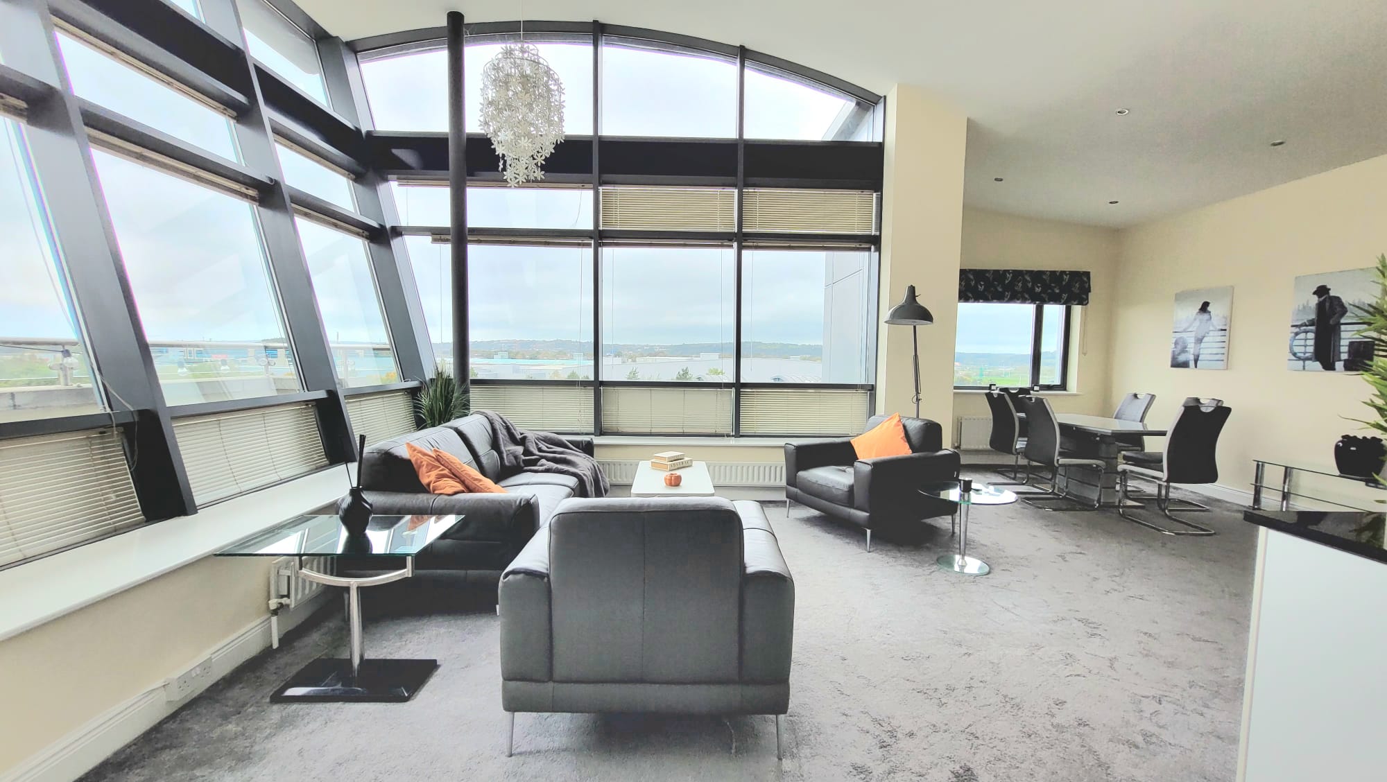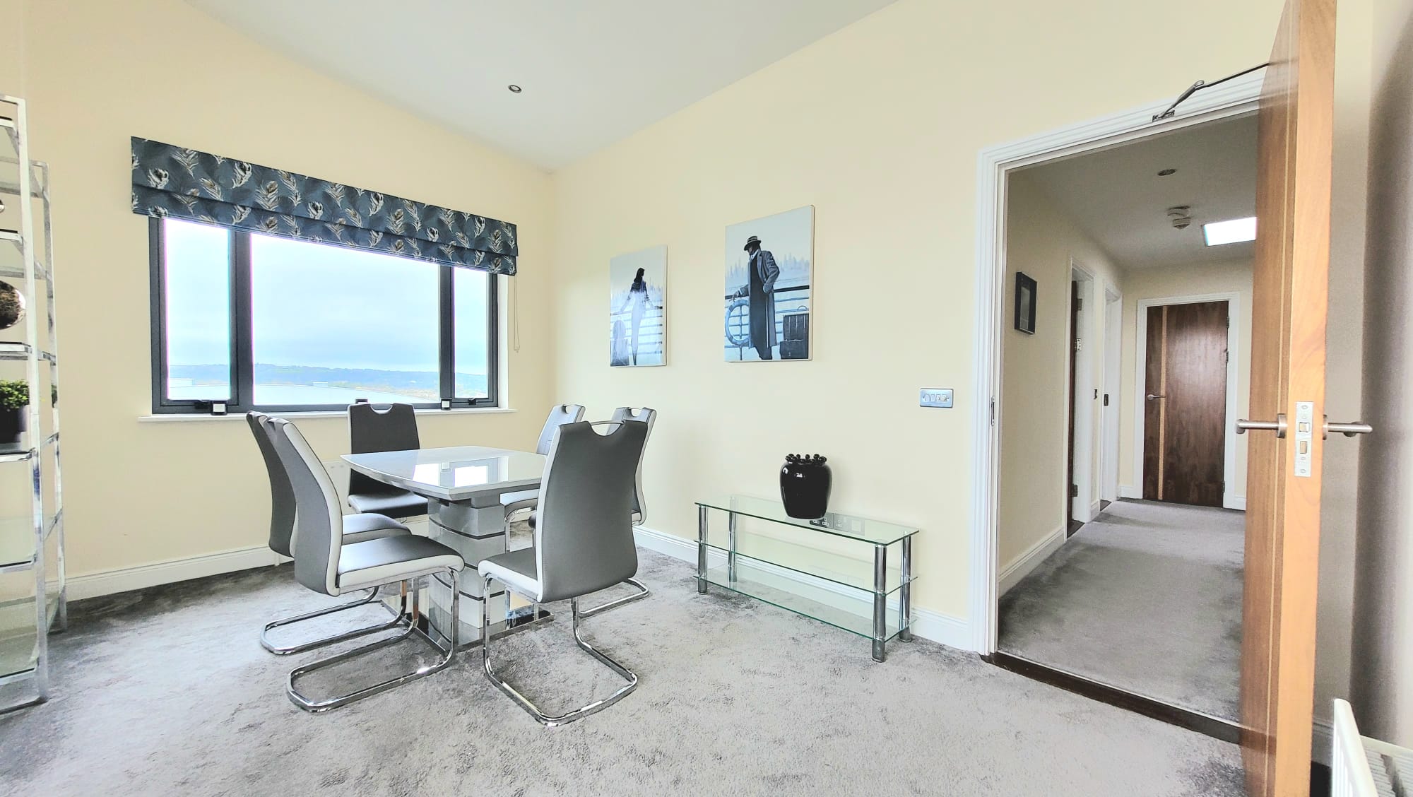 A magnificent dual aspect open plan kitchen/dining/living area offers panoramic views across the Lough Mahon estuary, Cork city, Douglas and Rochestown. The room has carpet flooring within the extensive light filled living space, attractive neutral décor, recessed spot lighting, a feature centre light piece, and feature wall-mounted lighting. The area has three large radiators, six power points, two television points, and two telephone points.