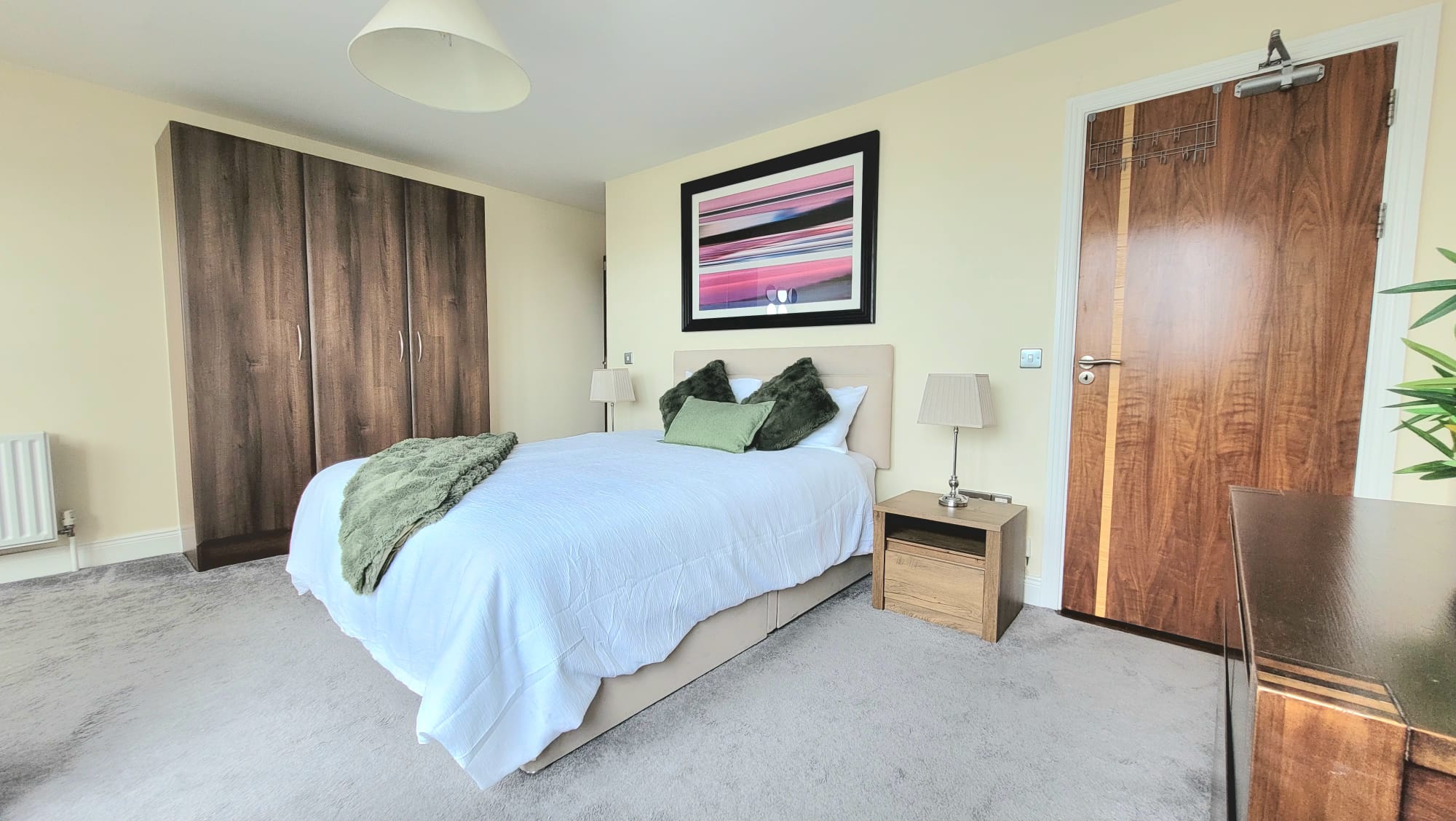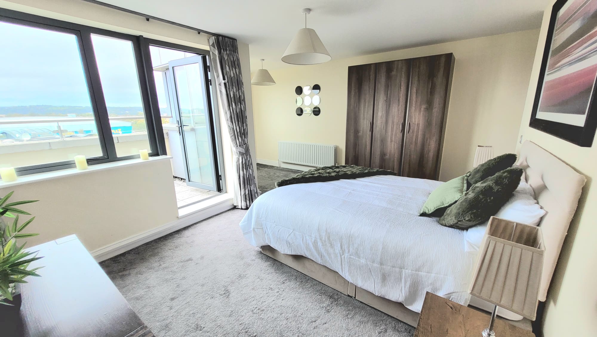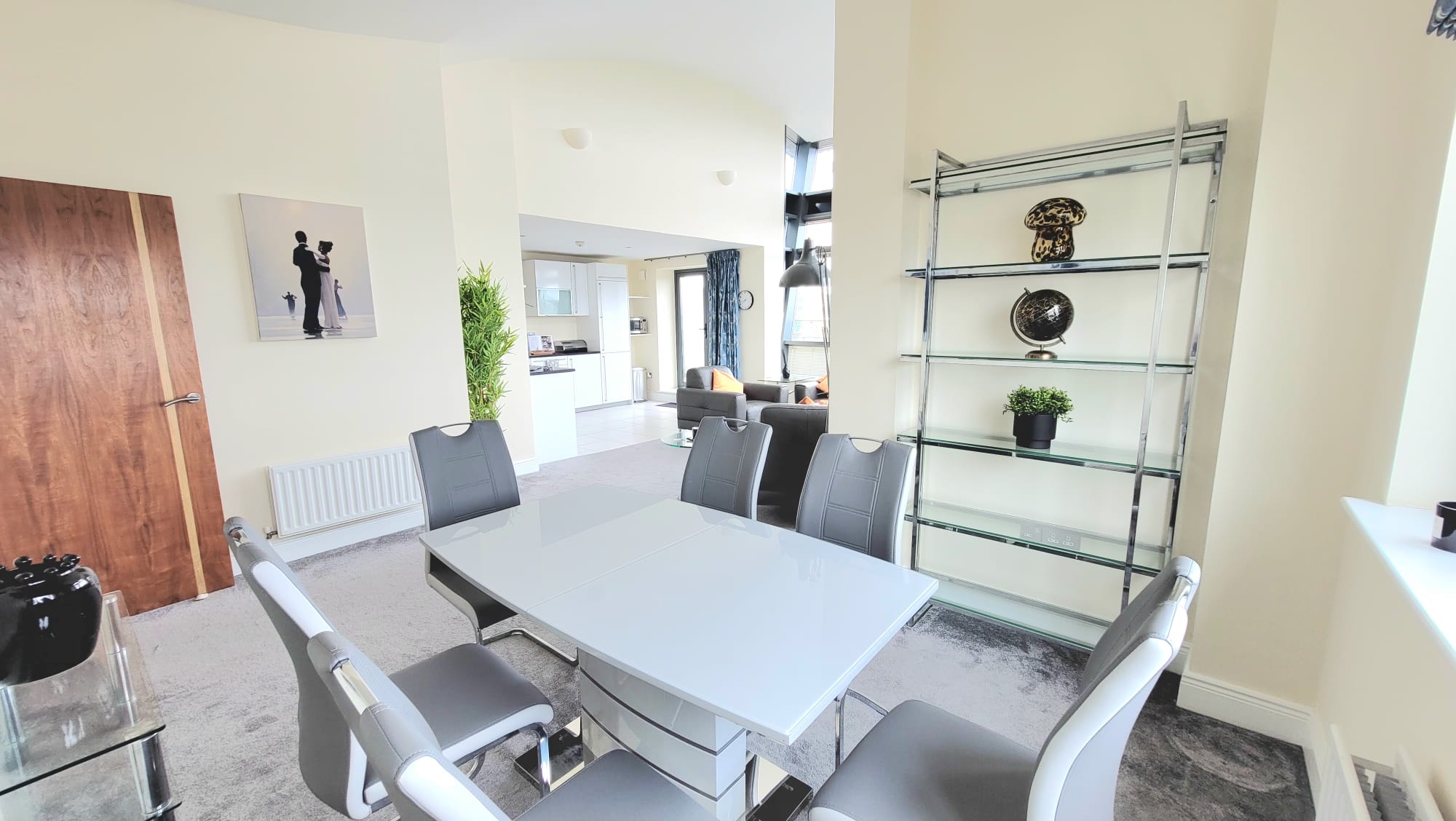 A magnificent dual aspect open plan kitchen/dining/living area offers panoramic views across the Lough Mahon estuary, Cork city, Douglas and Rochestown. The room has carpet flooring within the extensive light filled living space, attractive neutral décor, recessed spot lighting, a feature centre light piece, and feature wall-mounted lighting. The area has three large radiators, six power points, two television points, and two telephone points.