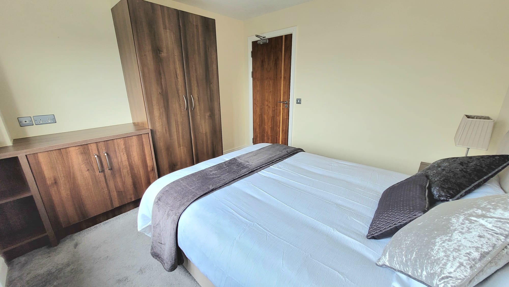 A spacious double bedroom has one window overlooking the side of the property and including a Roman blind. The room has carpet flooring, built-in storage, one centre light piece, one large radiator, six power points, and one television point.