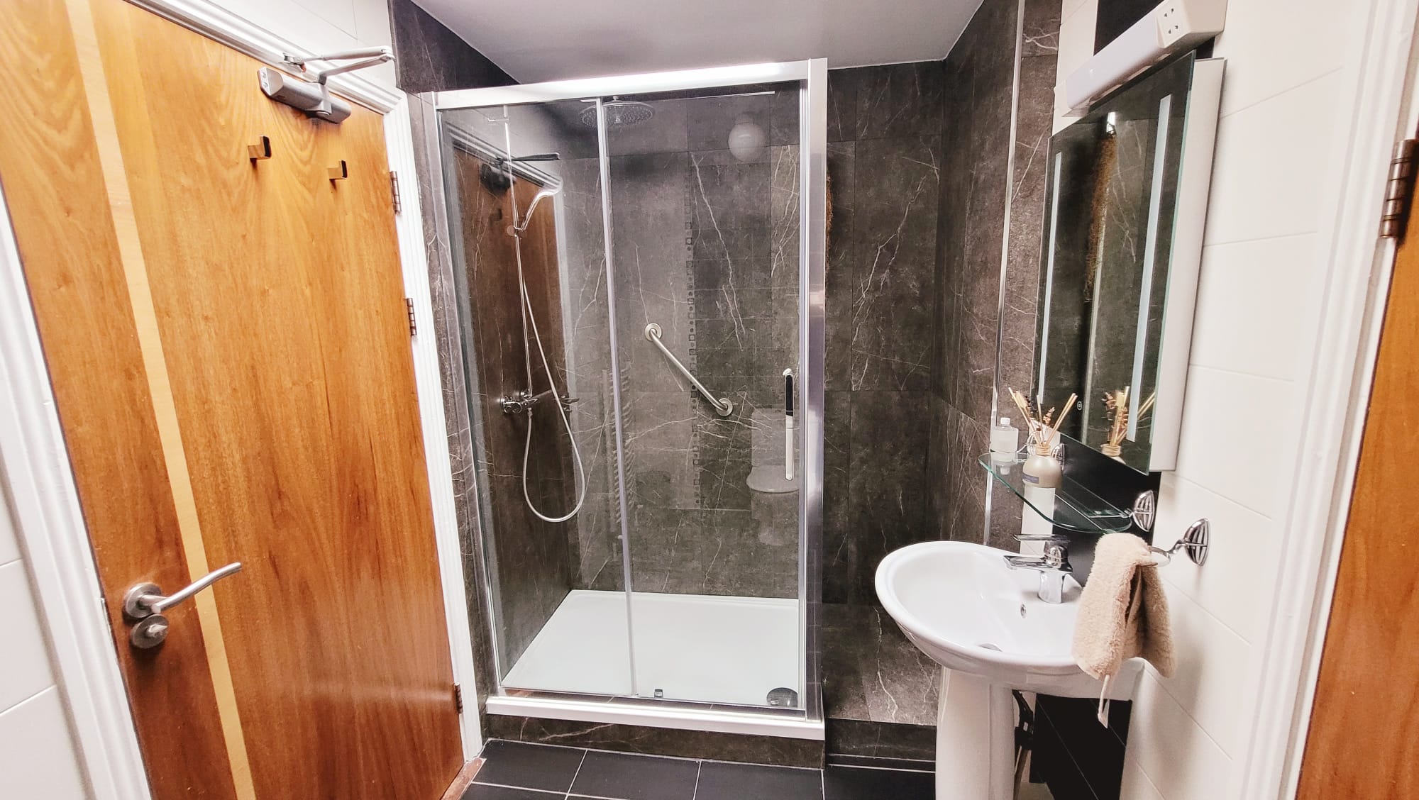 A newly refurbished en suite bathroom features a three piece suite including a shower cubicle incorporating a mains operated shower. There is modern tiling from floor to ceiling, one centre light piece, one wall-mounted light piece, a heated towel rail, and a velux window.