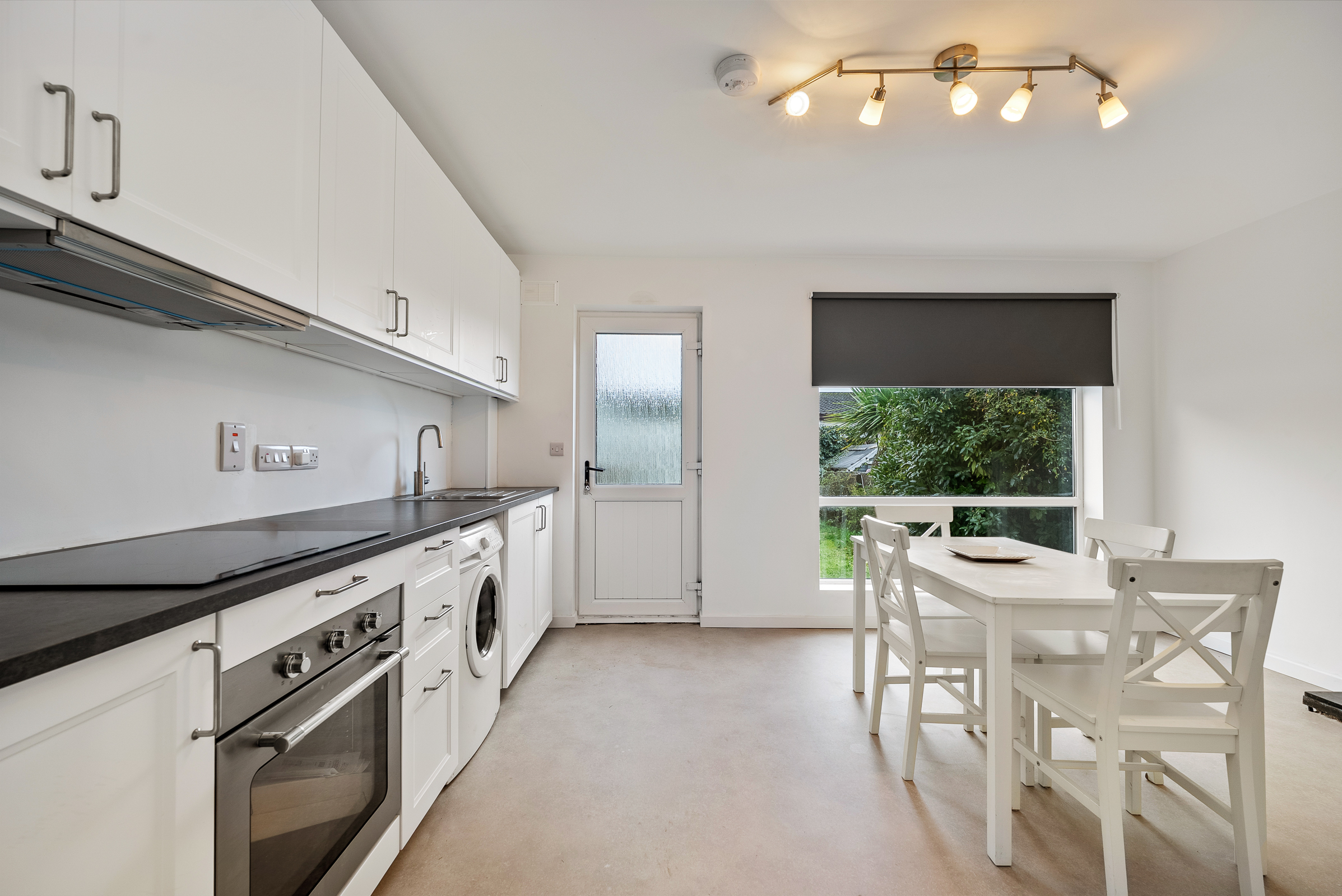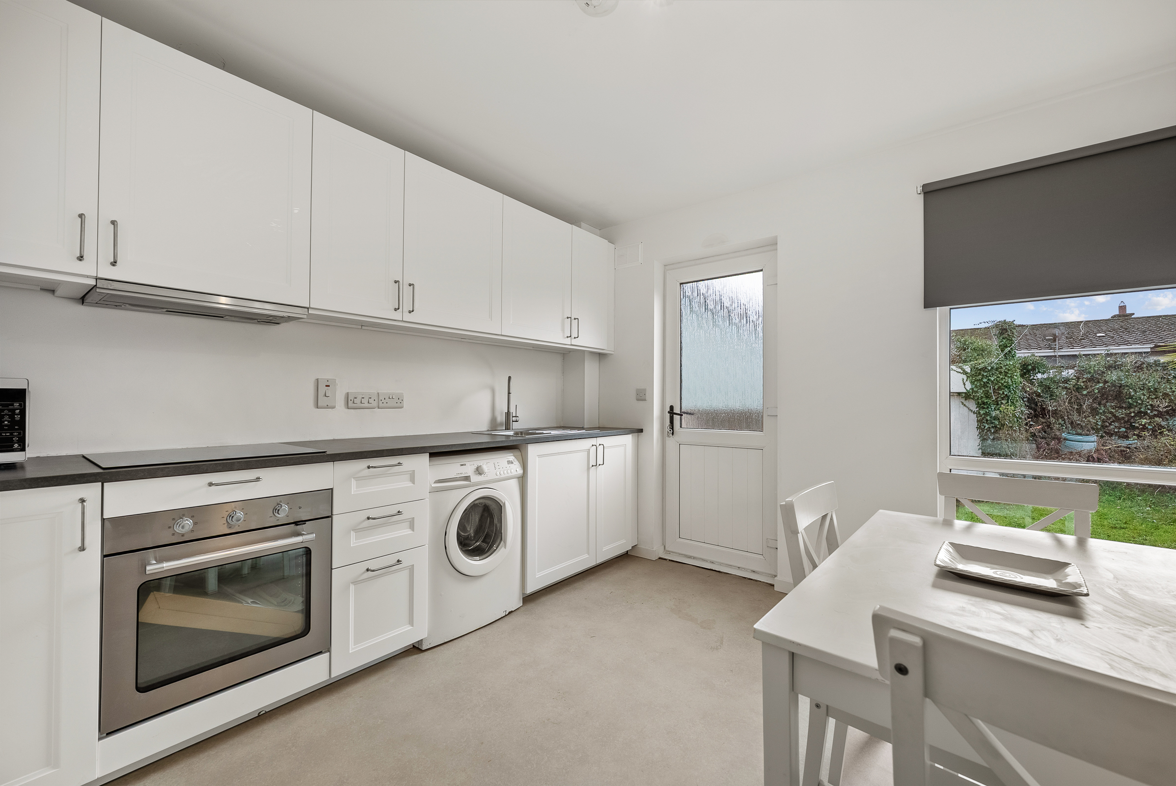 The kitchen/dining area has vinyl flooring, one window overlooking the back garden, and a door allowing access to same. The kitchen has newly fitted units at eye and floor level with an extensive worktop counter, tile splashback, stainless steel sink, oven/hob/extractor fan, plumbing for a washing machine, space for a fridge freezer, and some power points. The dining area has ample space for a table and chairs, one centre light fitting, a fireplace with an open insert, access to storage space, and one radiator. The boiler is also housed within the kitchen/dining space.
