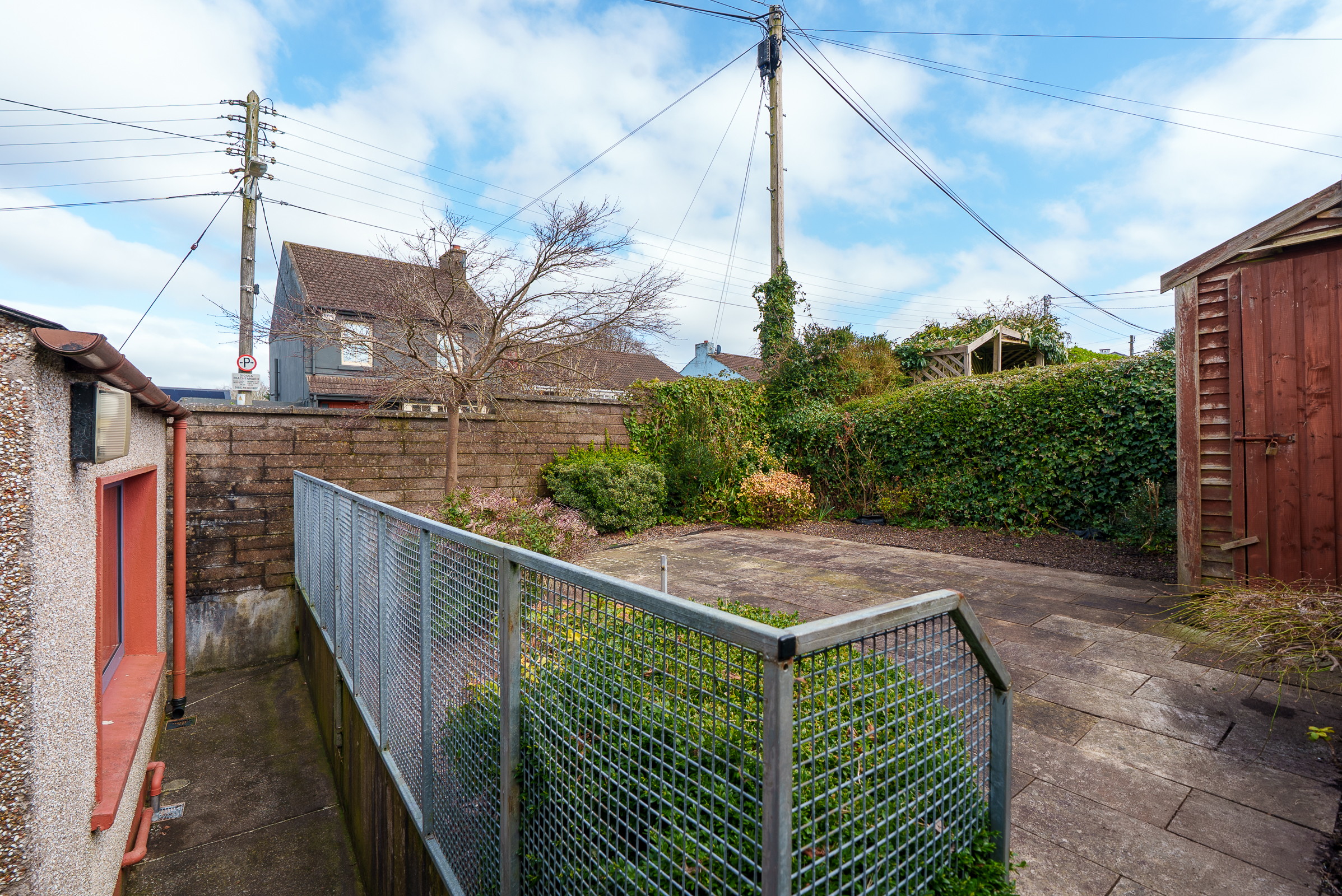 The rear garden is fully enclosed and designed for low maintenance. A concrete pathway leads to a well-maintained patio area, complemented by mature shrubs and planting. A flower bed and a Barna shed are also positioned to the rear of the property.