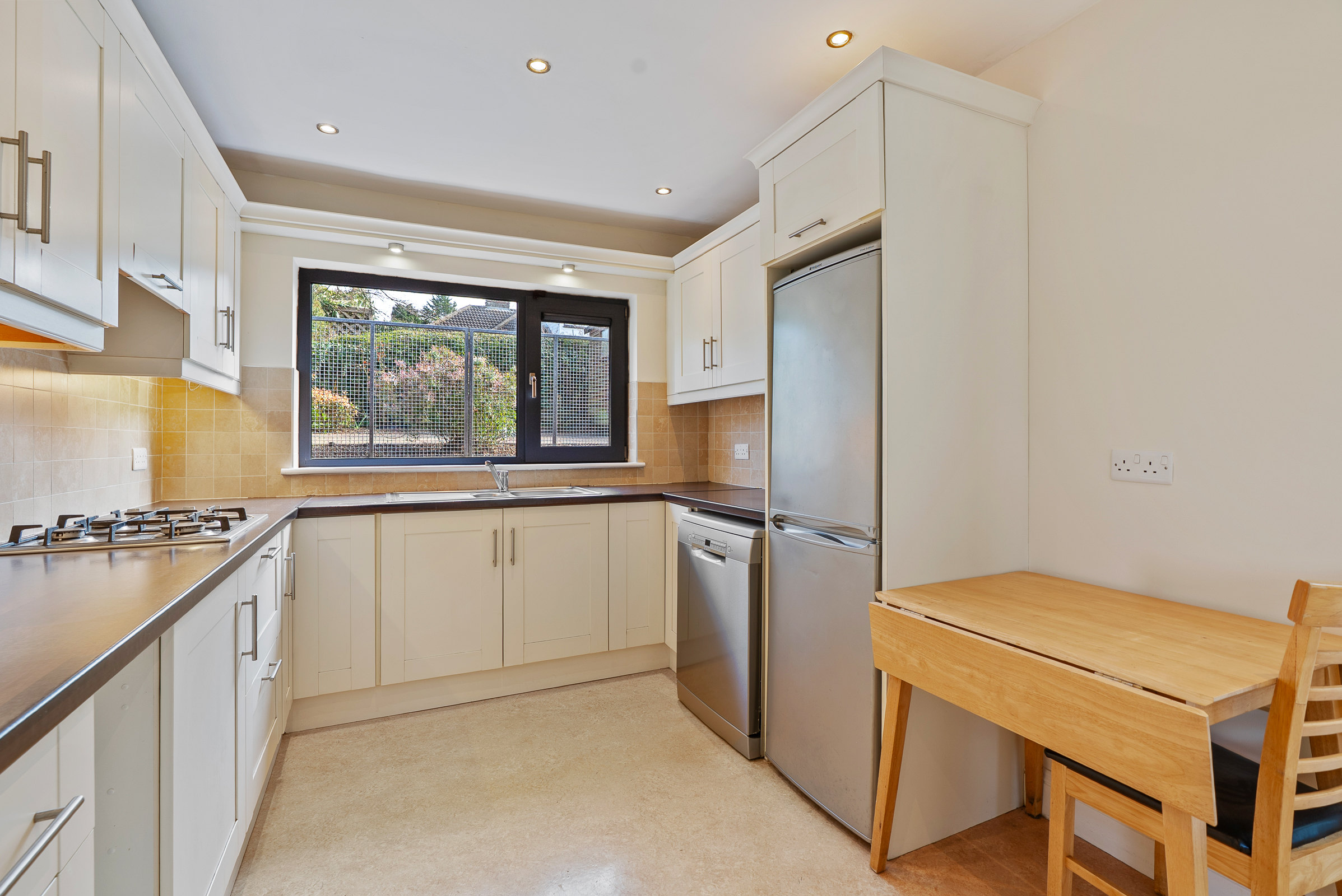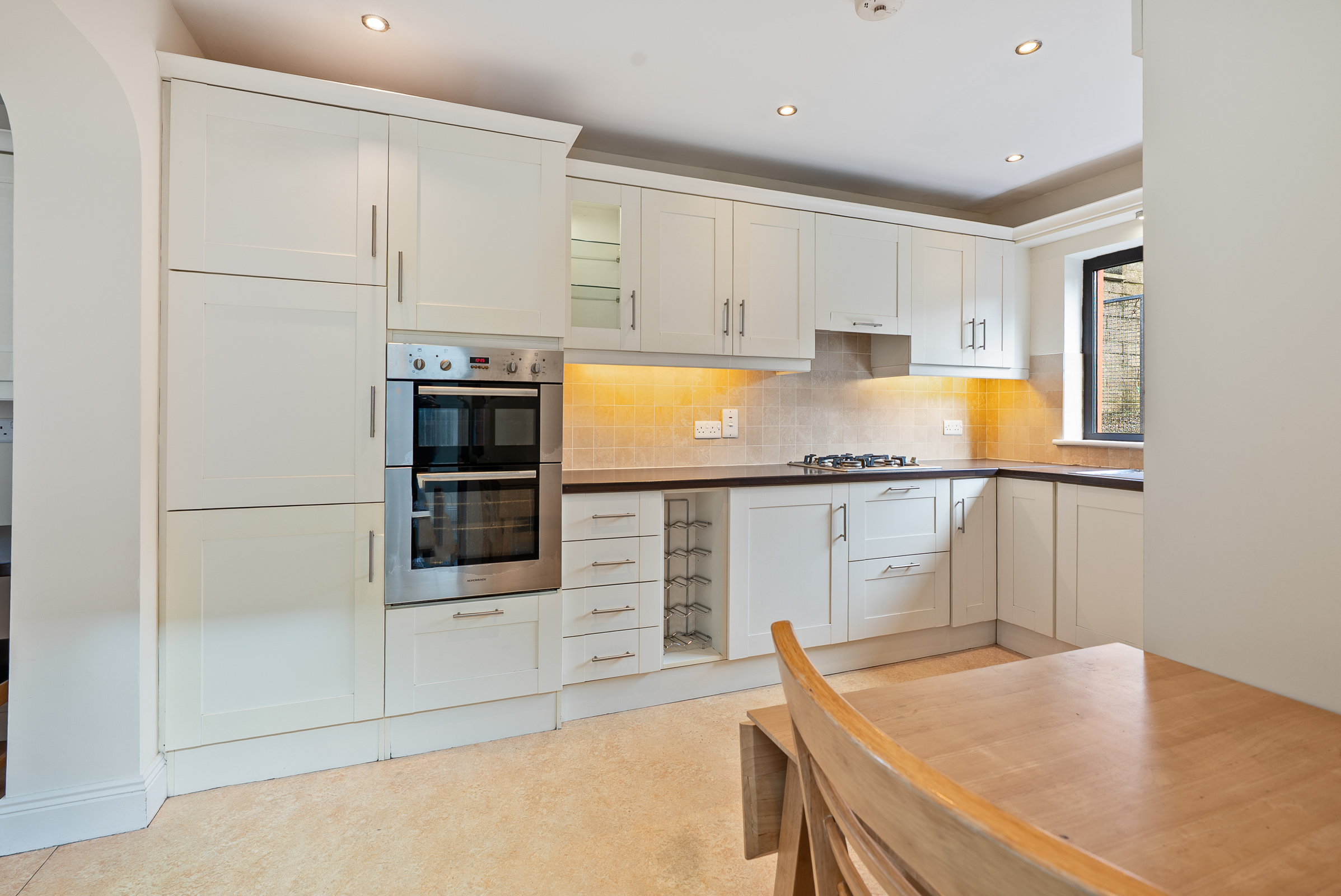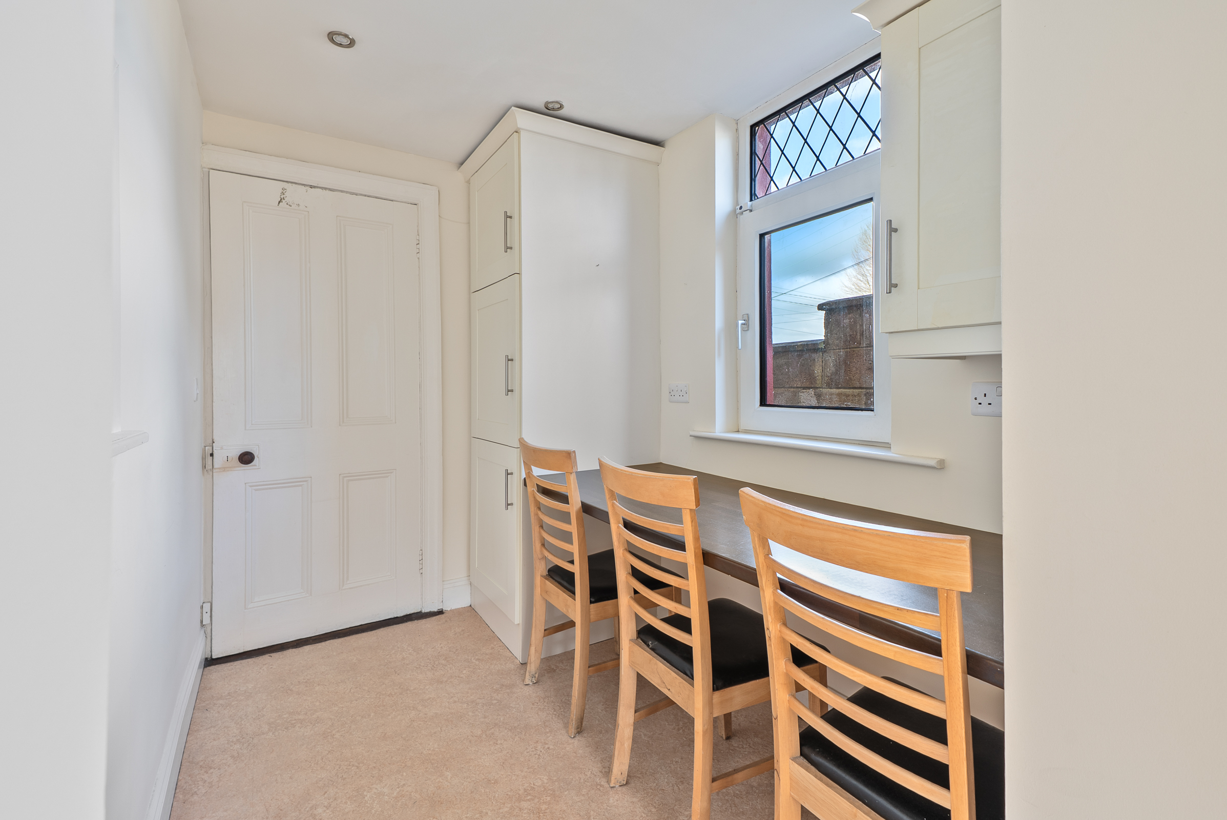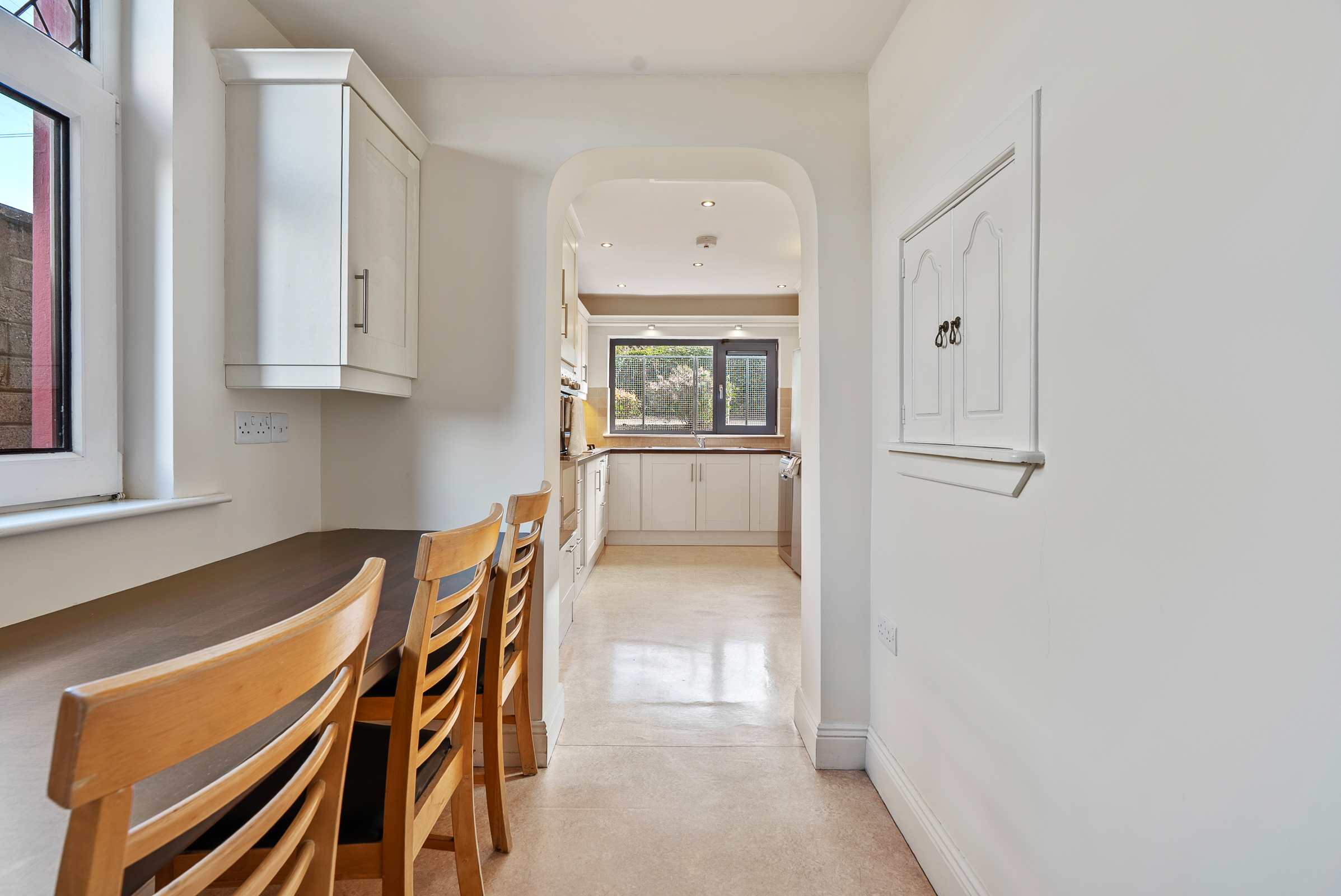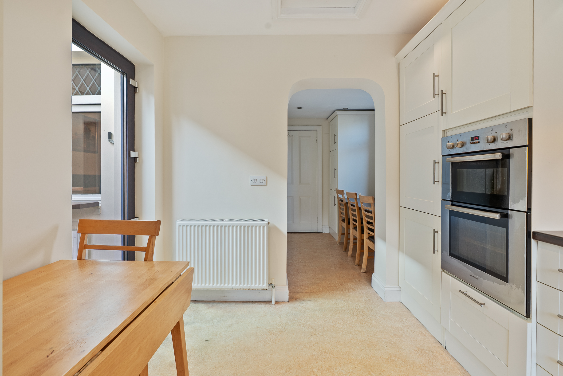 A spacious kitchen area that has built-in units from floor to ceiling, extensive worktop counter, tile splashback, integrated oven/hob/extractor fan, recessed spot lighting, fridge freezer, and a dishwasher. Flooring is laminate, there is a window to the rear, access to the attic, and an open arch allows access to the dining space. There is also a built-in unit containing the gas boiler and providing additional storage.