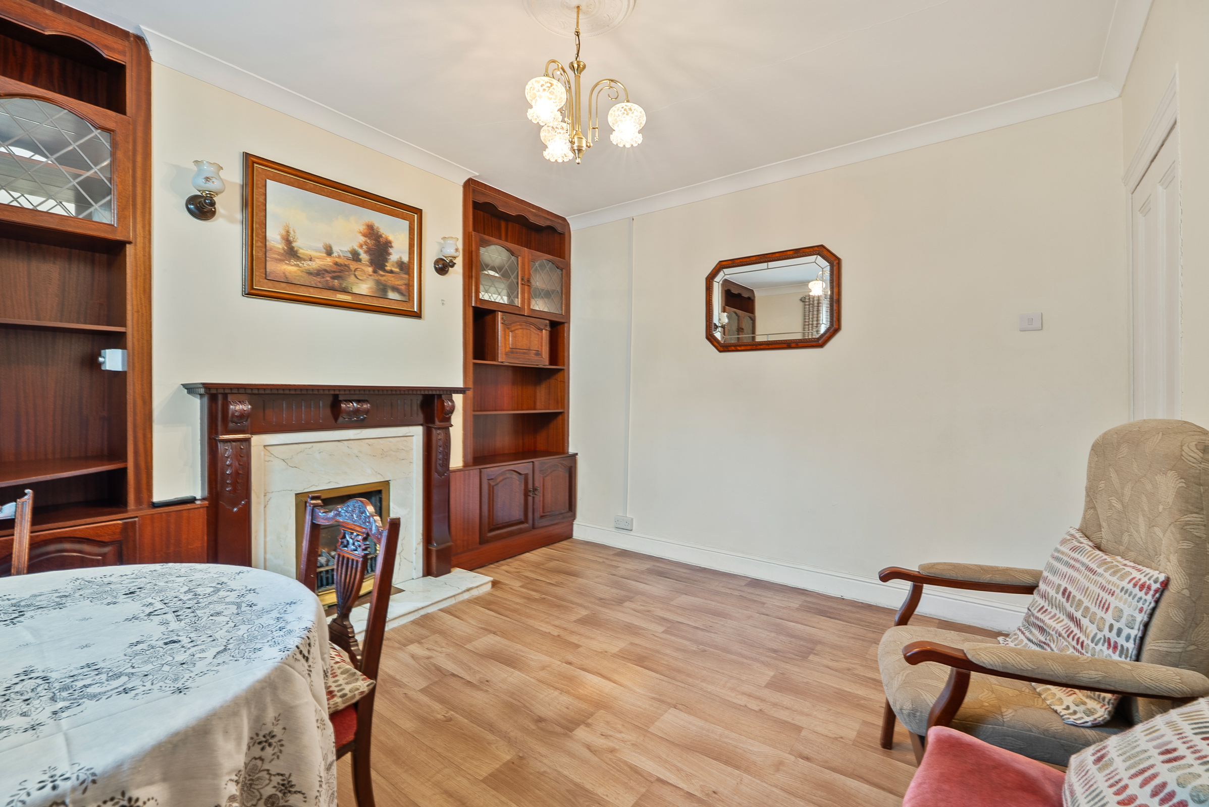 The formal dining room has a modern fireplace with open insert, mahogany surround, and attractive built-in units for display, one window to the rear of the property, one centre light fitting and vinyl flooring.