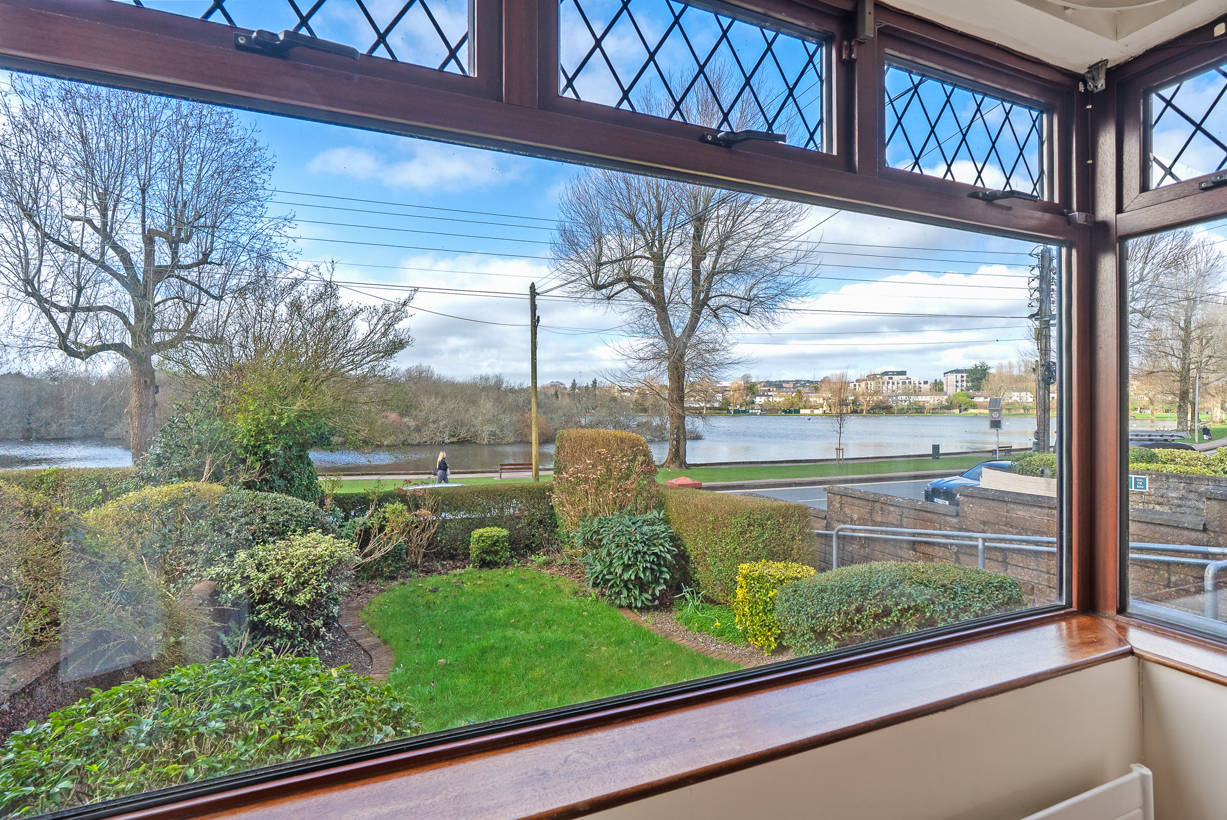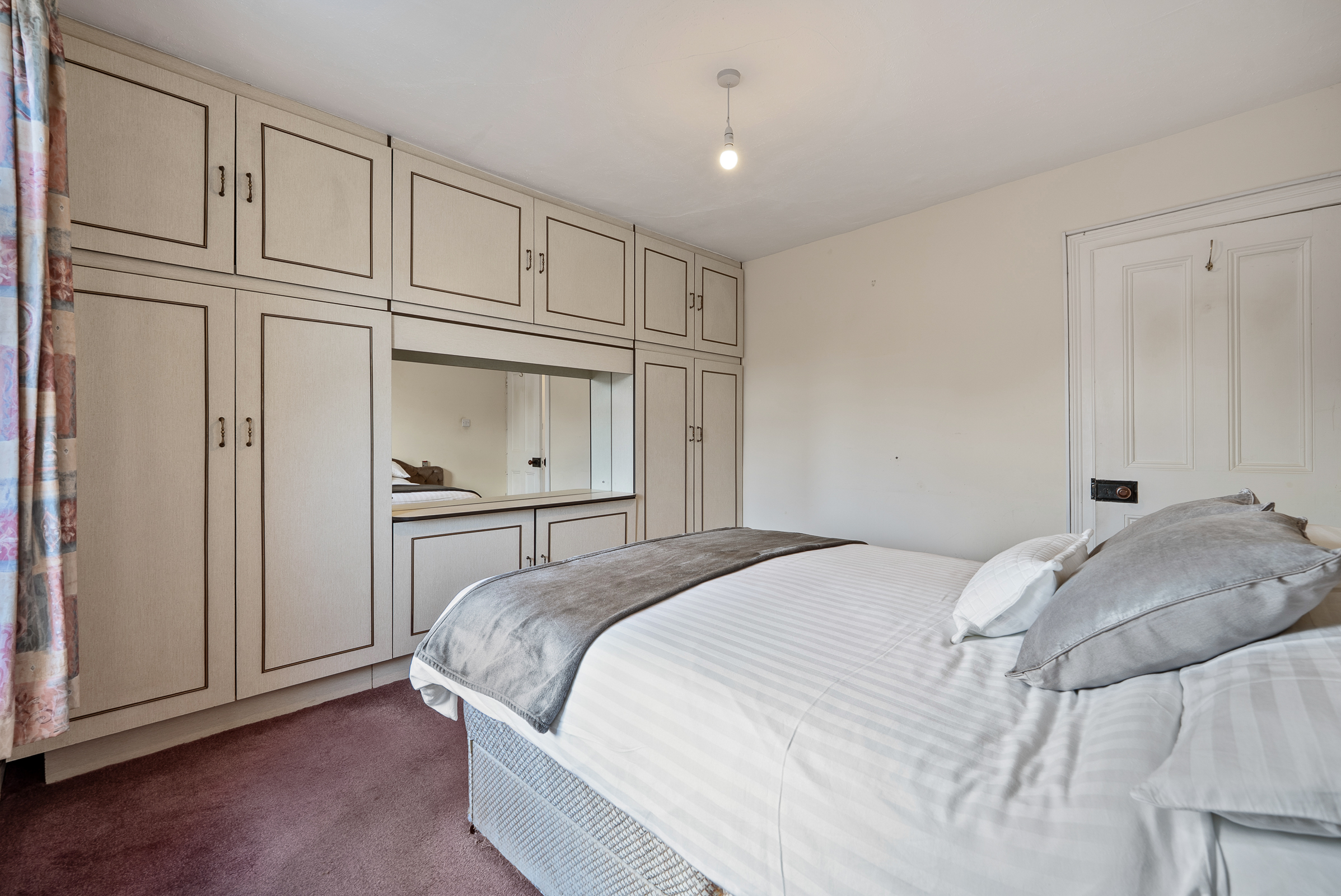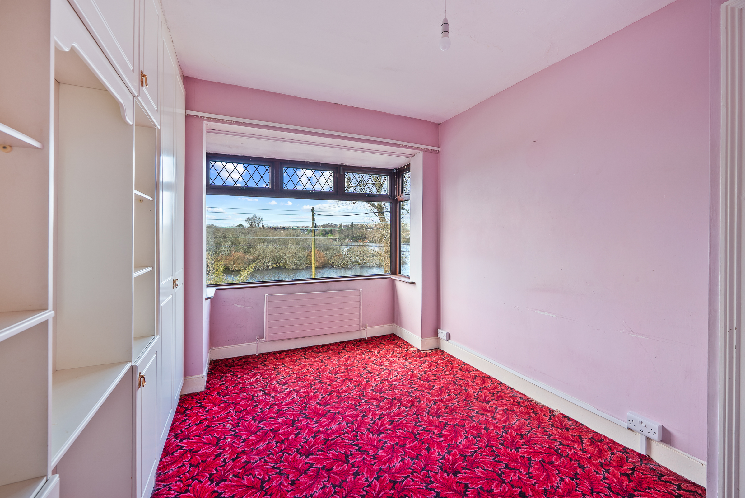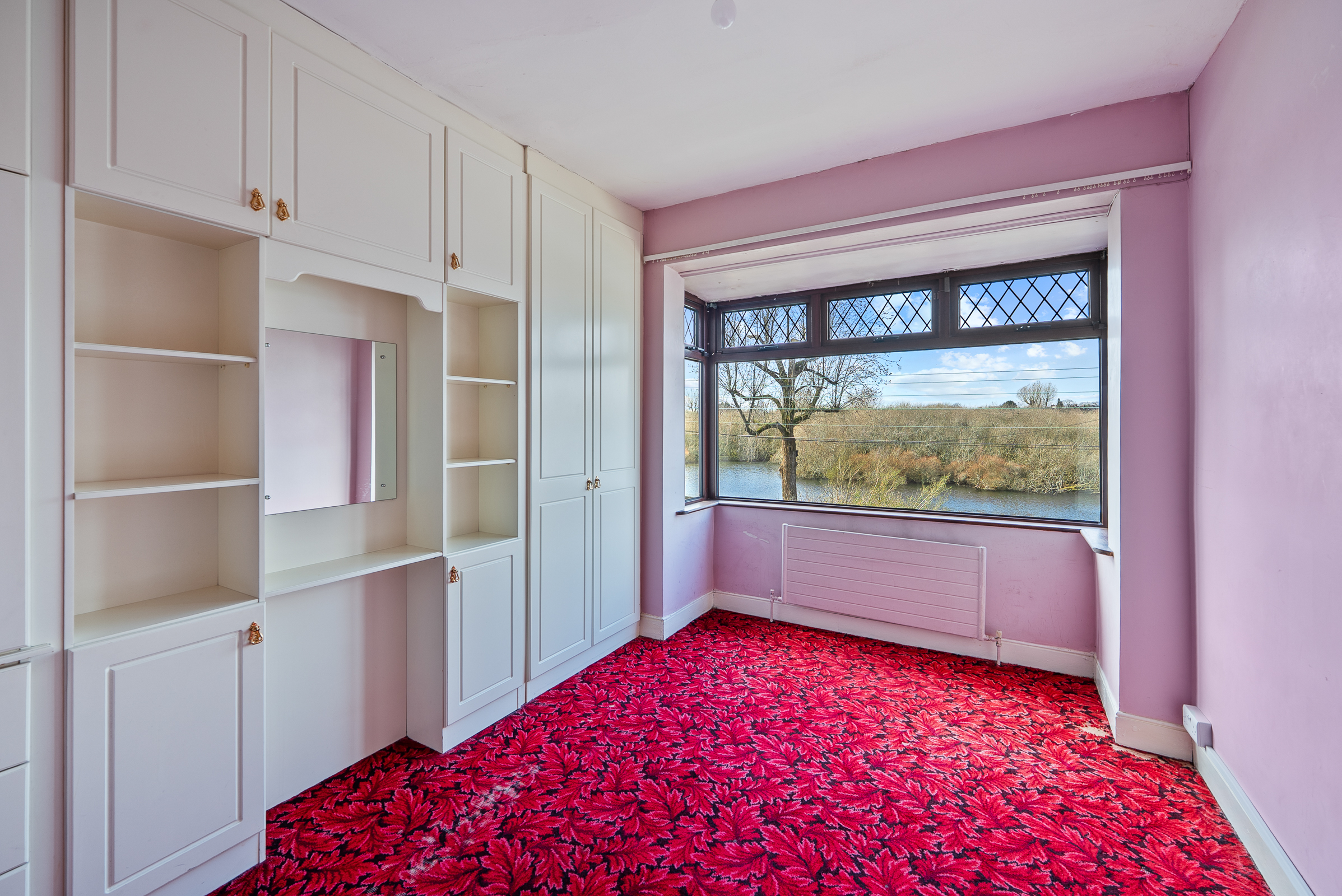 Another spacious double bedroom has a feature bay window to the front of the property, with picturesque water views, extensive built-in units for storage, radiator, centre light fitting, and carpet flooring.