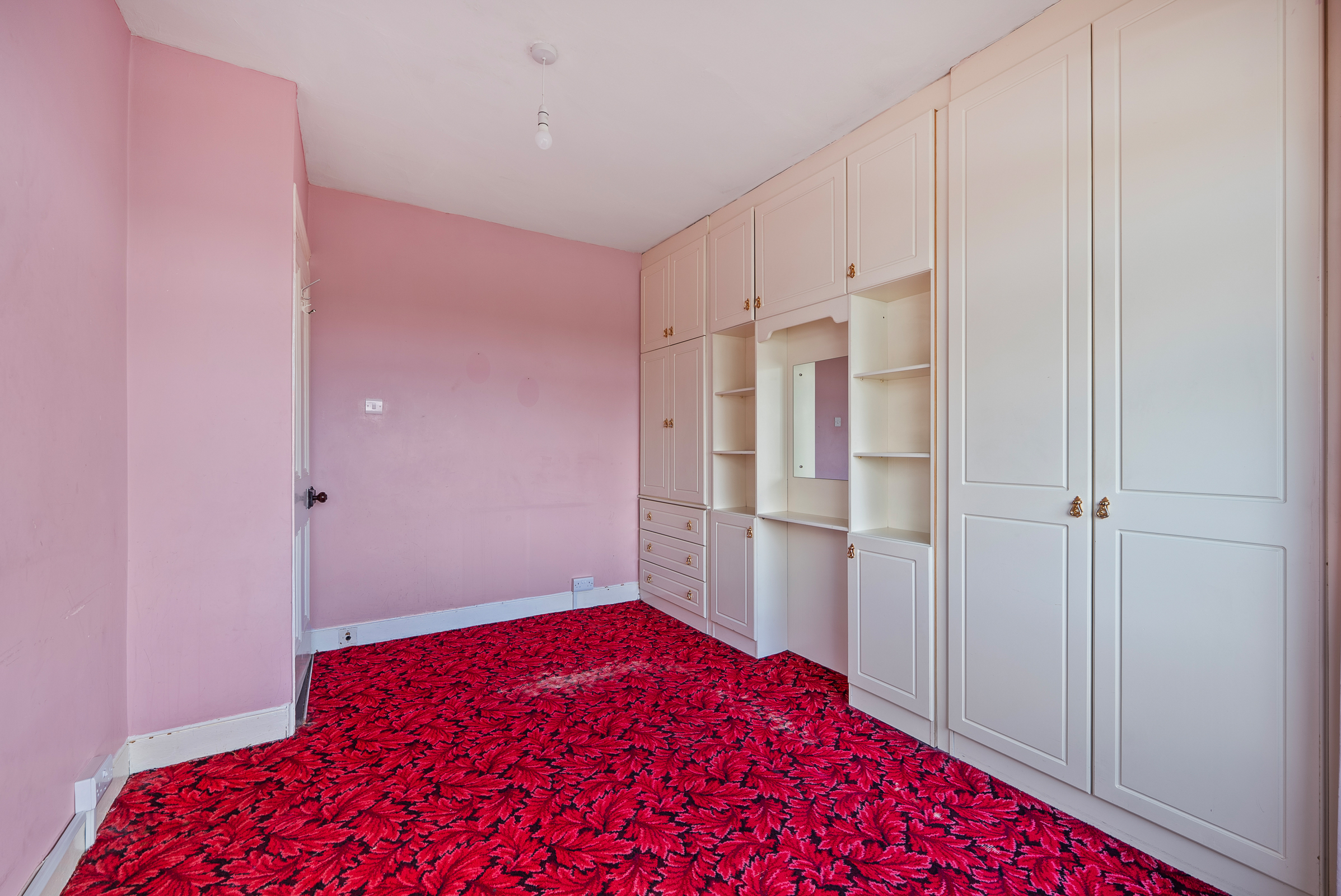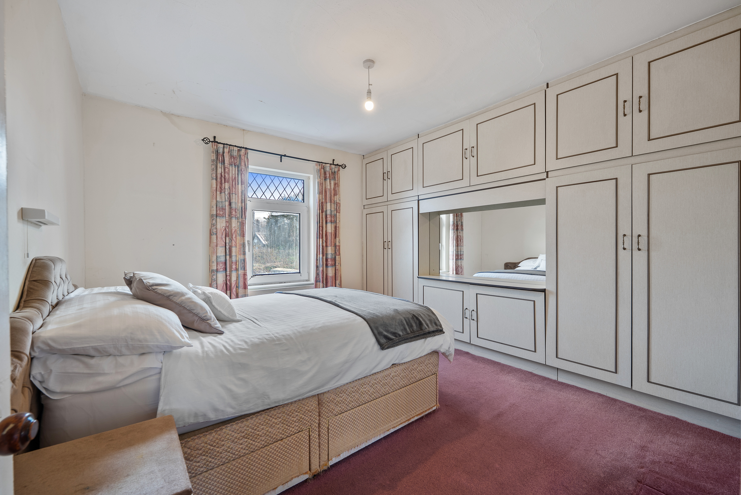 This spacious double bedroom has large built-in wardrobe units, a window to the rear of the property, radiator, centre light fitting and carpet flooring.
