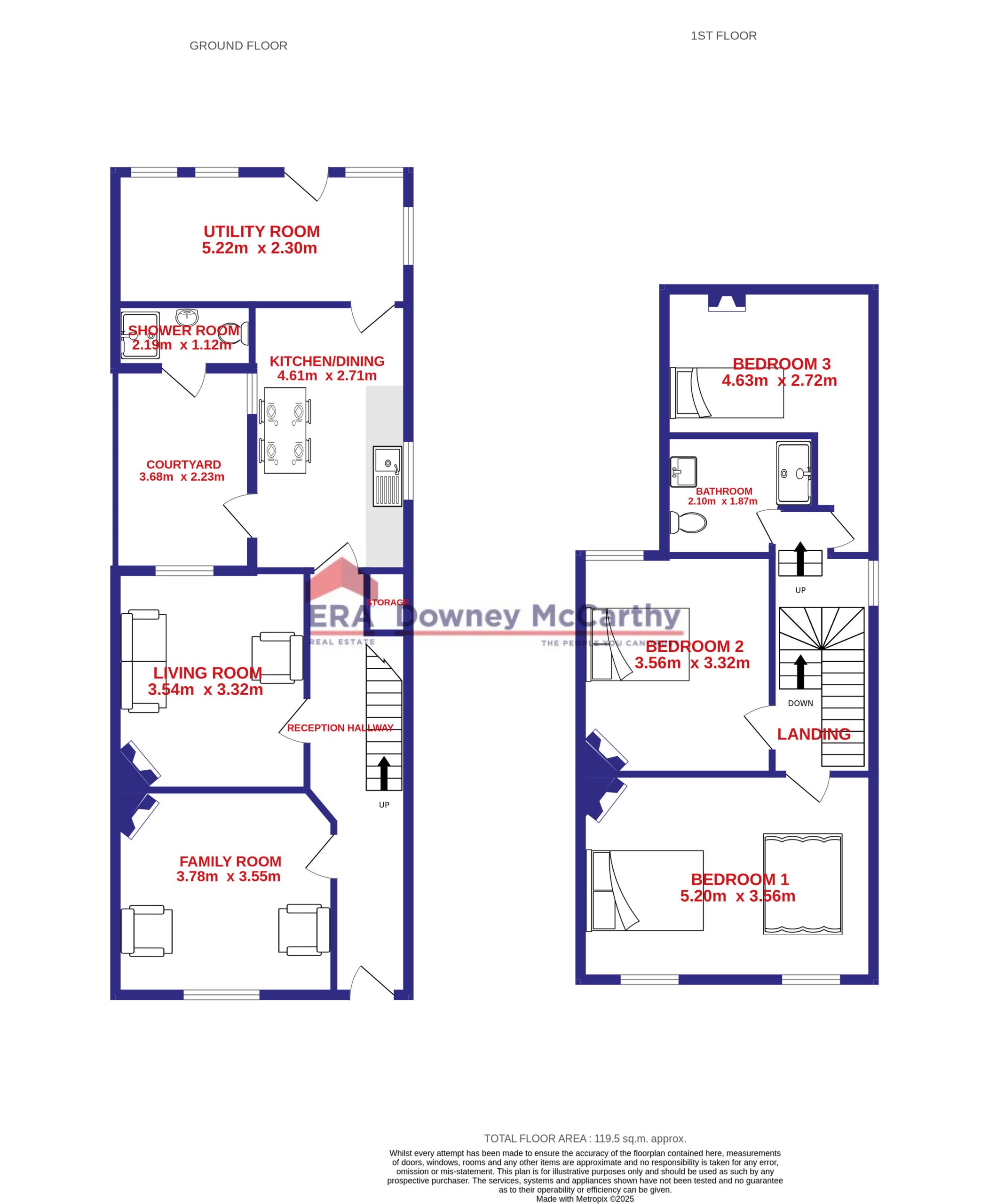 Accommodation consists of reception hallway, family room, living room, kitchen/dining area, utility room, an enclosed rear courtyard, and shower room on the ground floor. Upstairs the property offers three spacious bedrooms and the main bathroom.