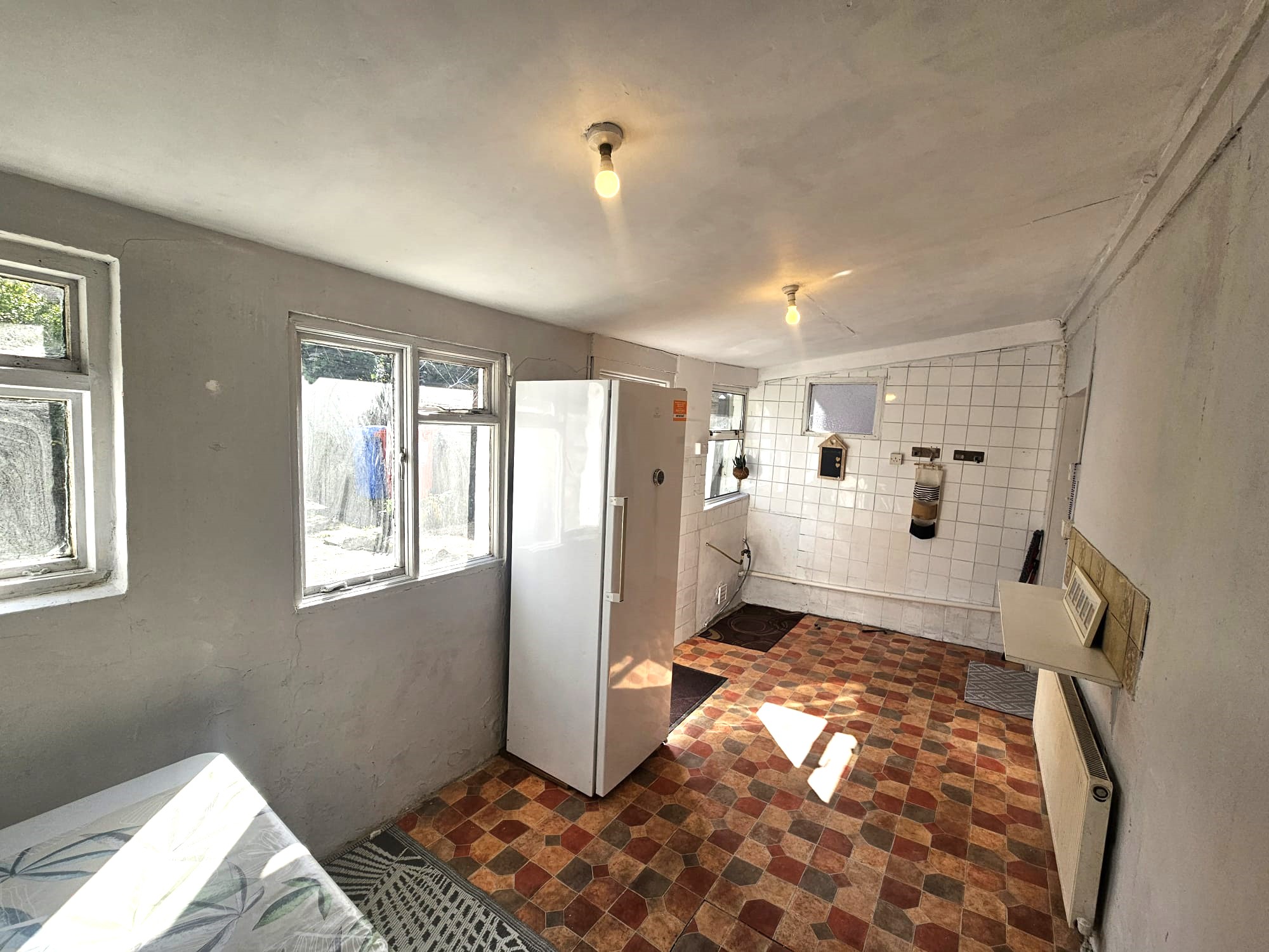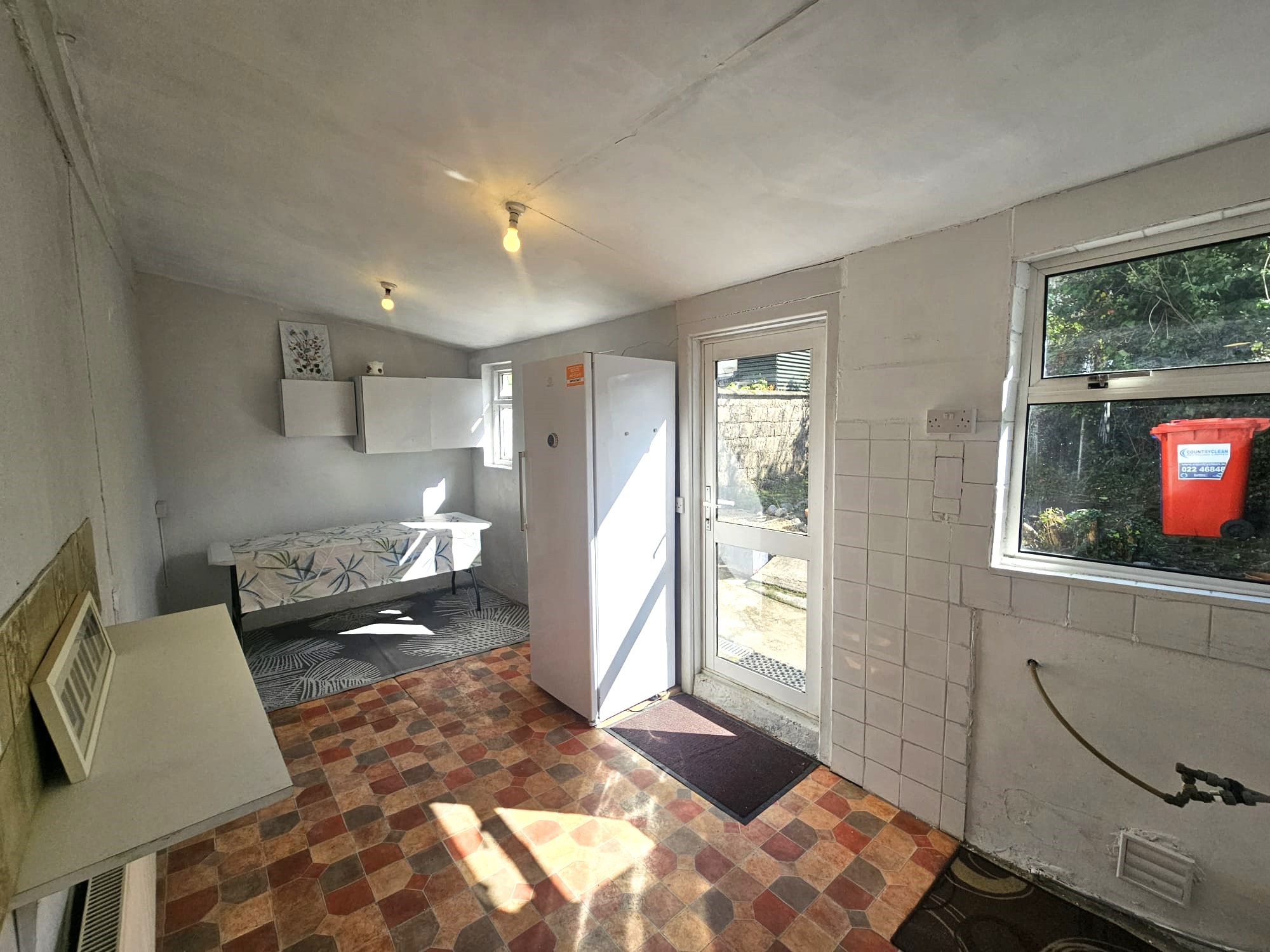 The dual aspect utility room features vinyl flooring, wall tiling, plumbing for a sink, plumbing for a washing machine, two light pieces, three windows to the rear, one window to the side, one large radiator, and eight power points. A PVC door with glass panelling allows access to the rear garden.