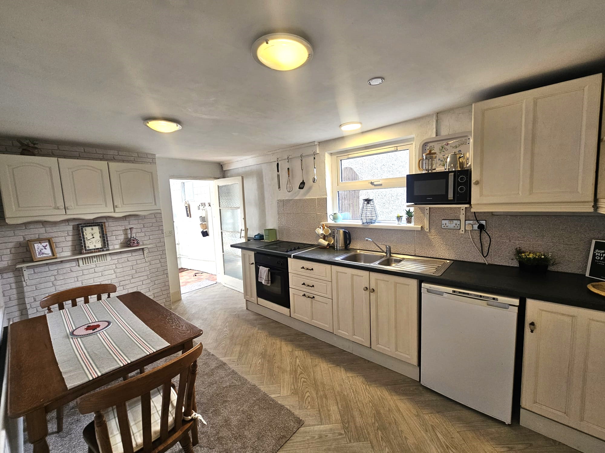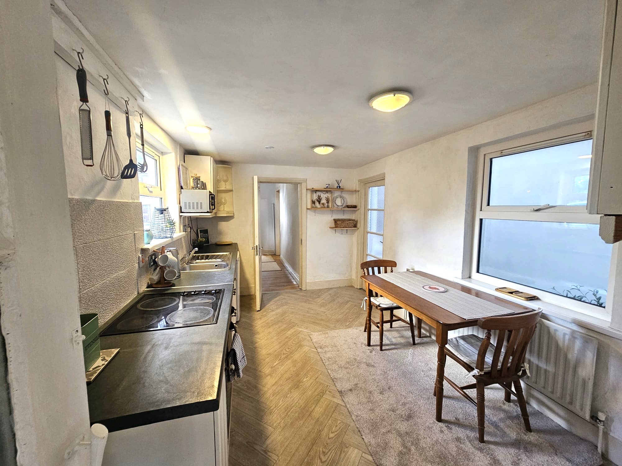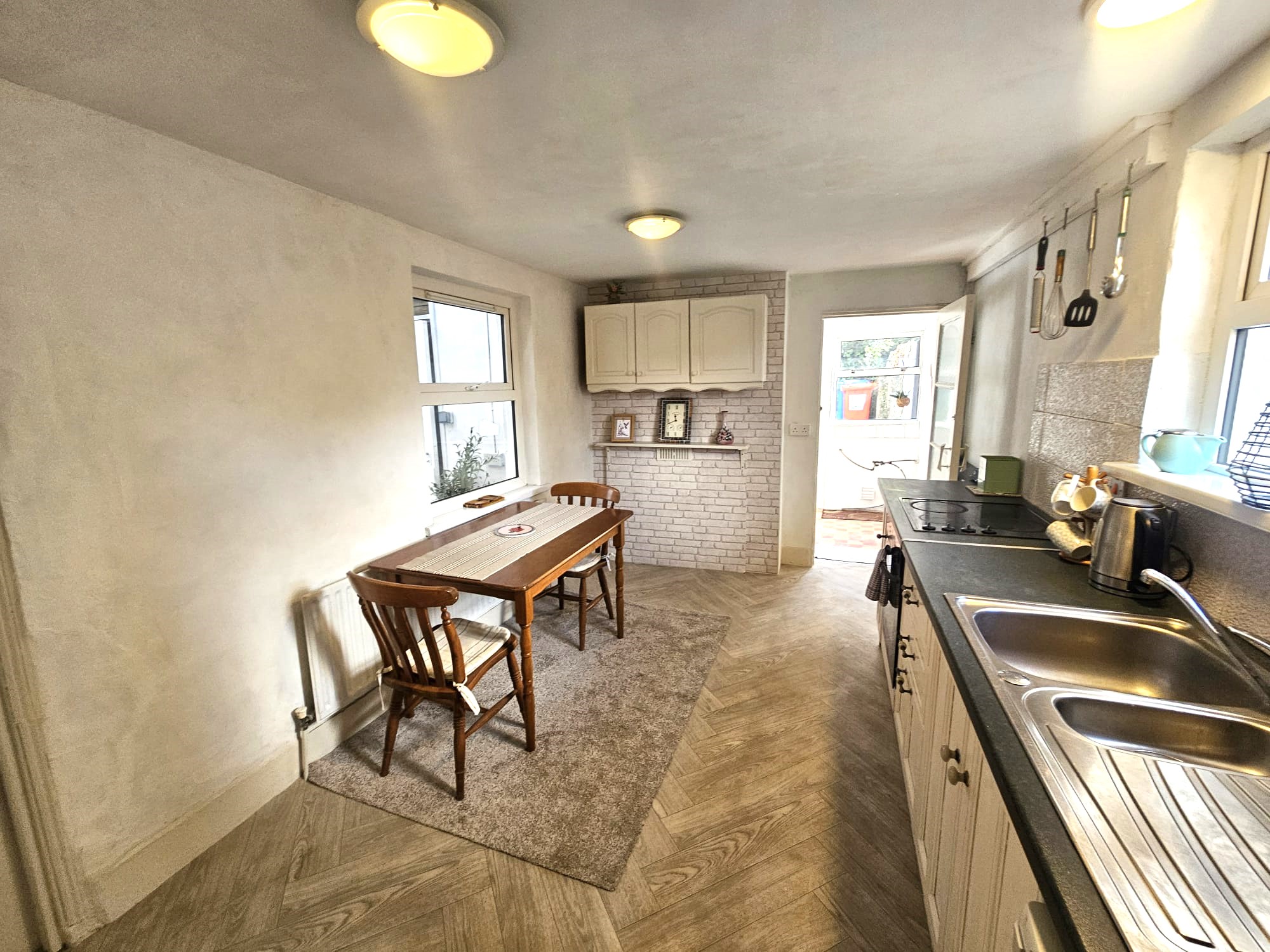 The extended kitchen/dining area is dual aspect with windows to either side of the property. The kitchen features solid fitted units at eye and floor level with worktop counter and tile splashback, a stainless steel sink, integrated oven/hob/extractor fan, and space for an under counter fridge freezer. The room has attractive new parquet vinyl flooring, neutral décor, four light pieces, one large radiator, and eight power points. Doors from the area allow access to the utility room and rear courtyard, respectively.