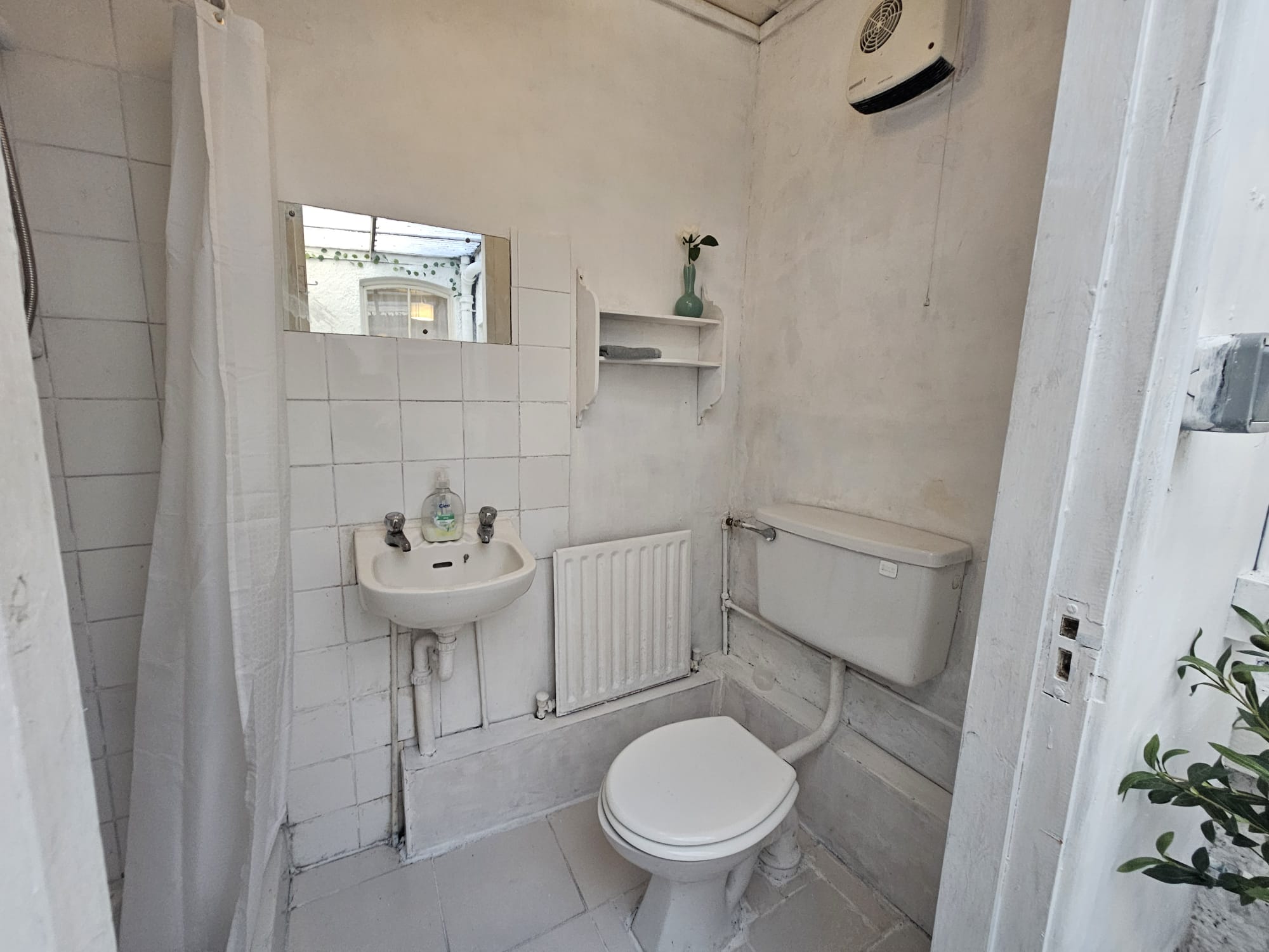 Accessed via the rear courtyard, this shower room features a three piece suite including a corner shower cubicle incorporating a Triton electric shower, floor and wall tiling, one radiator, and one centre light piece.