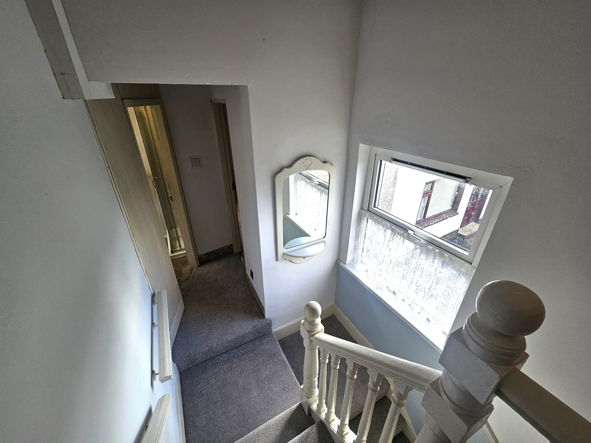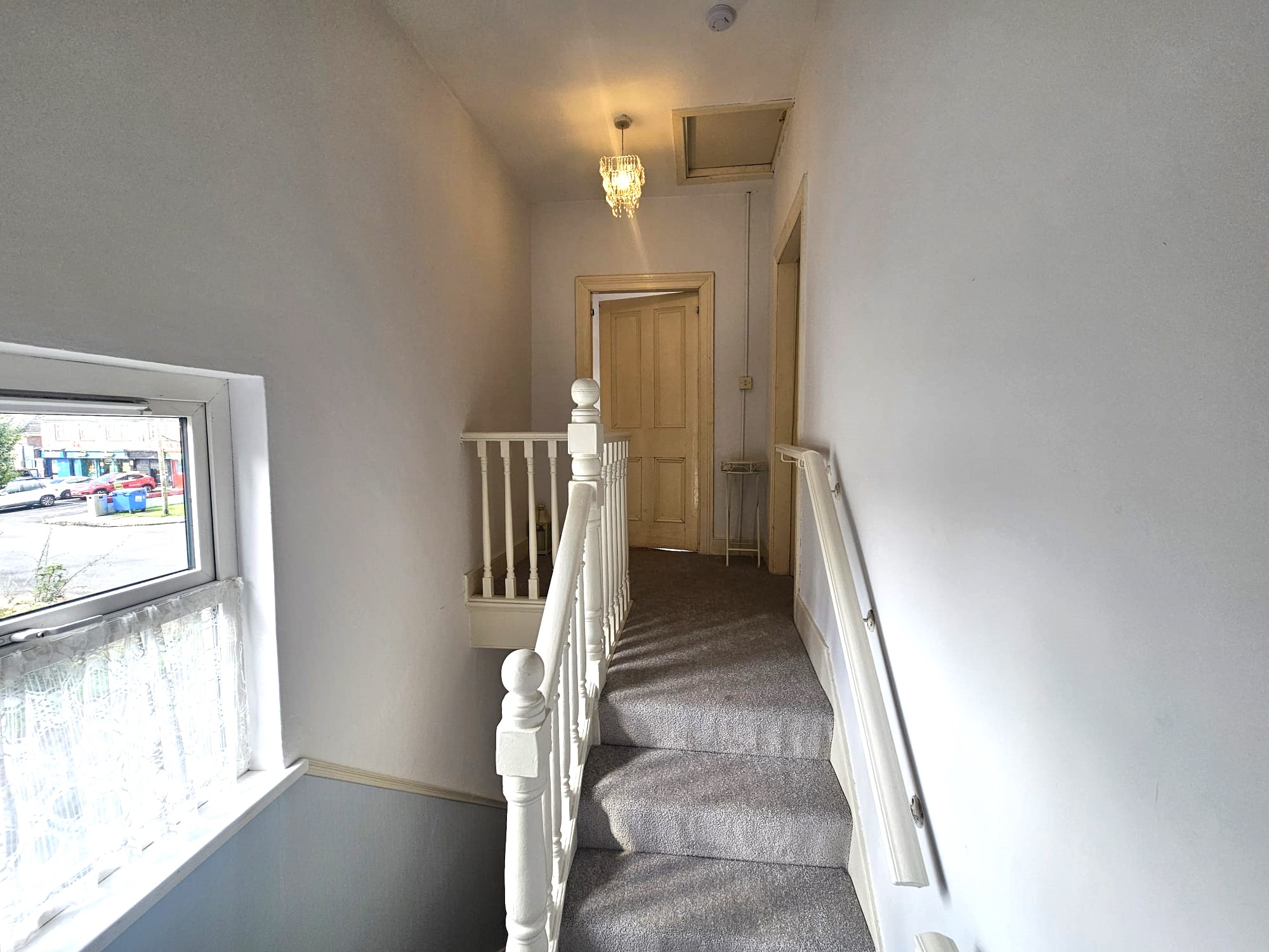 The stairs and landing are fitted with new carpet flooring throughout. At the half landing there is one window to the side of the property. The landing area has one centre light piece, neutral décor, and an access hatch to the attic.