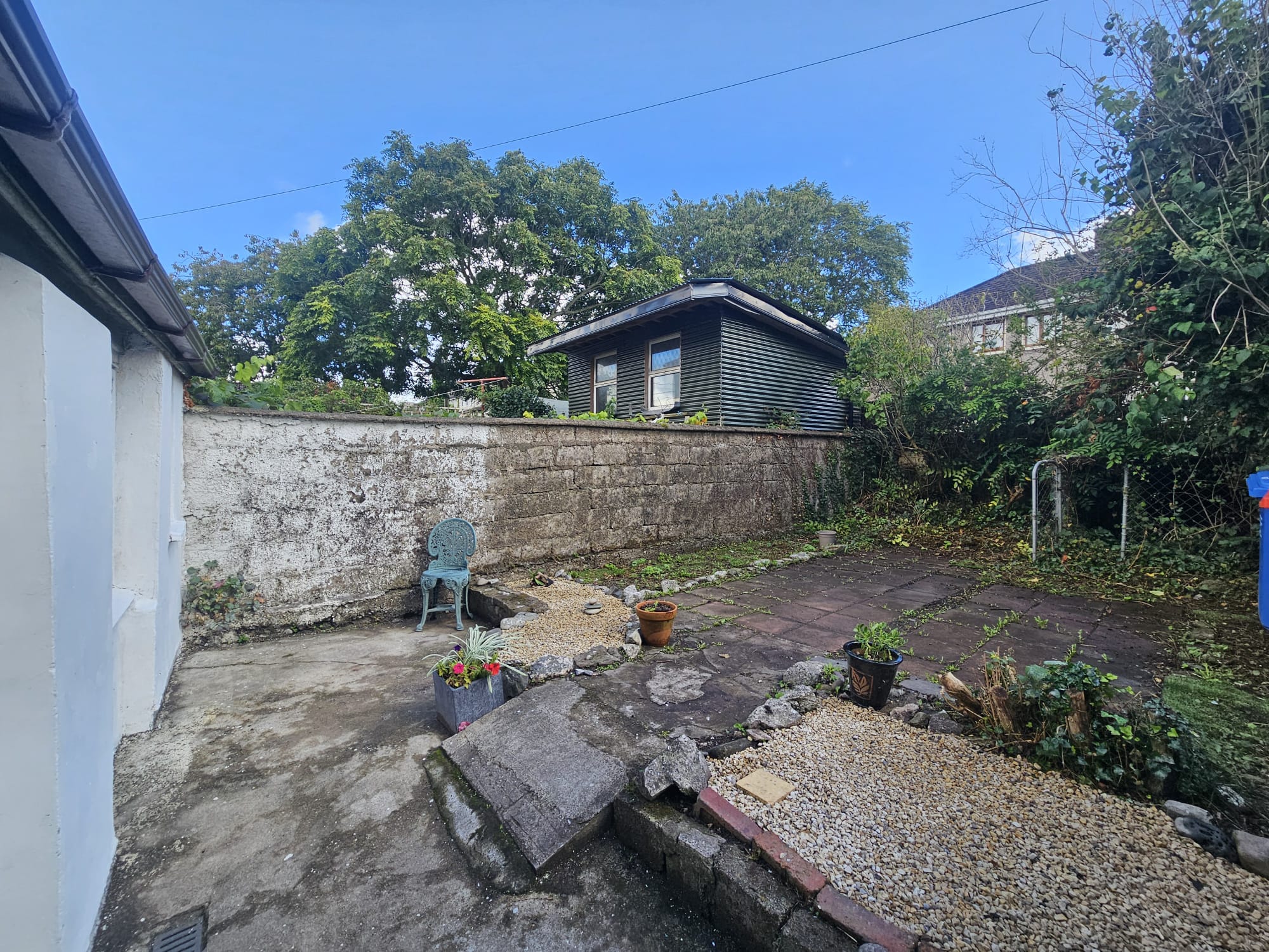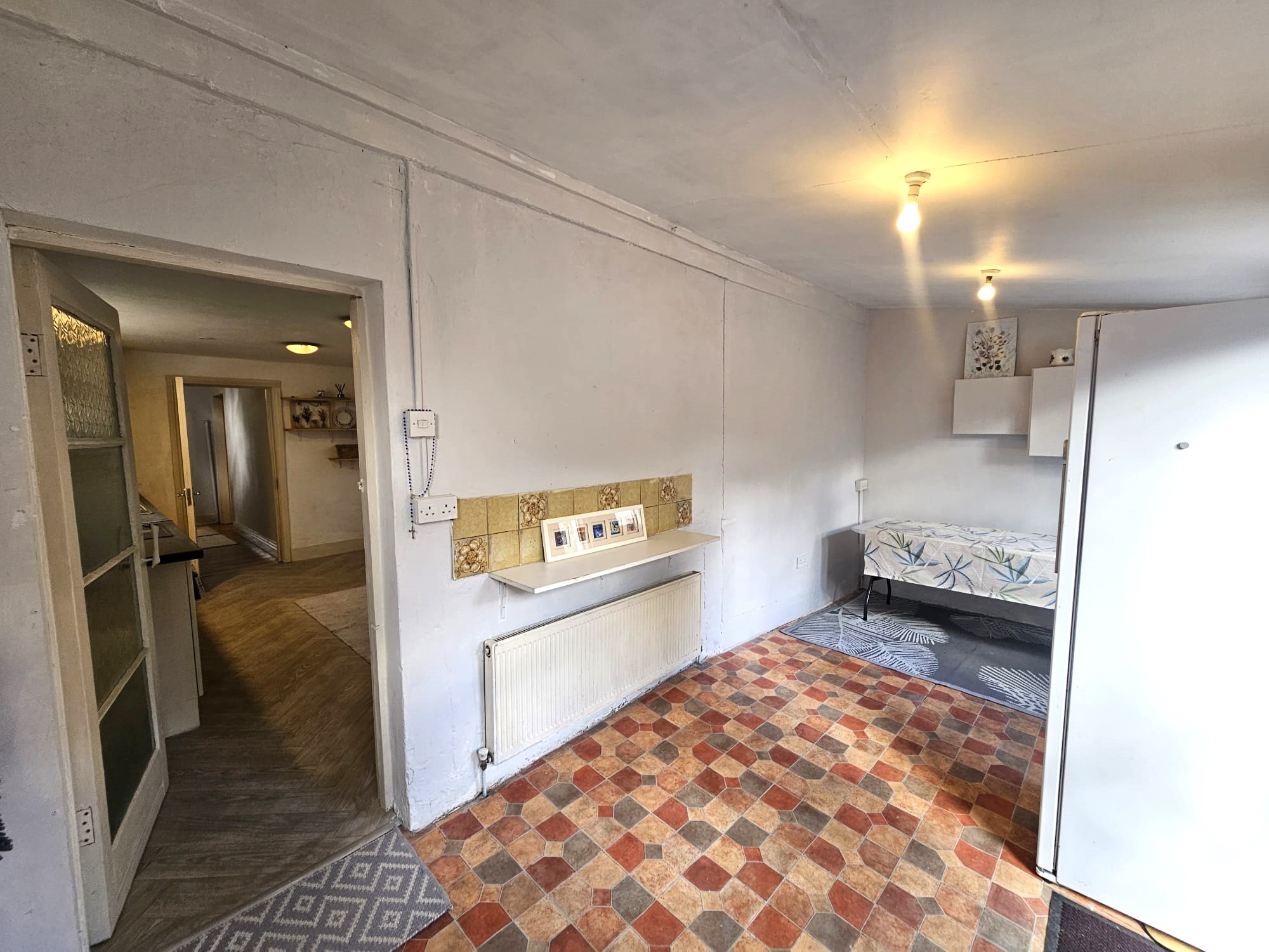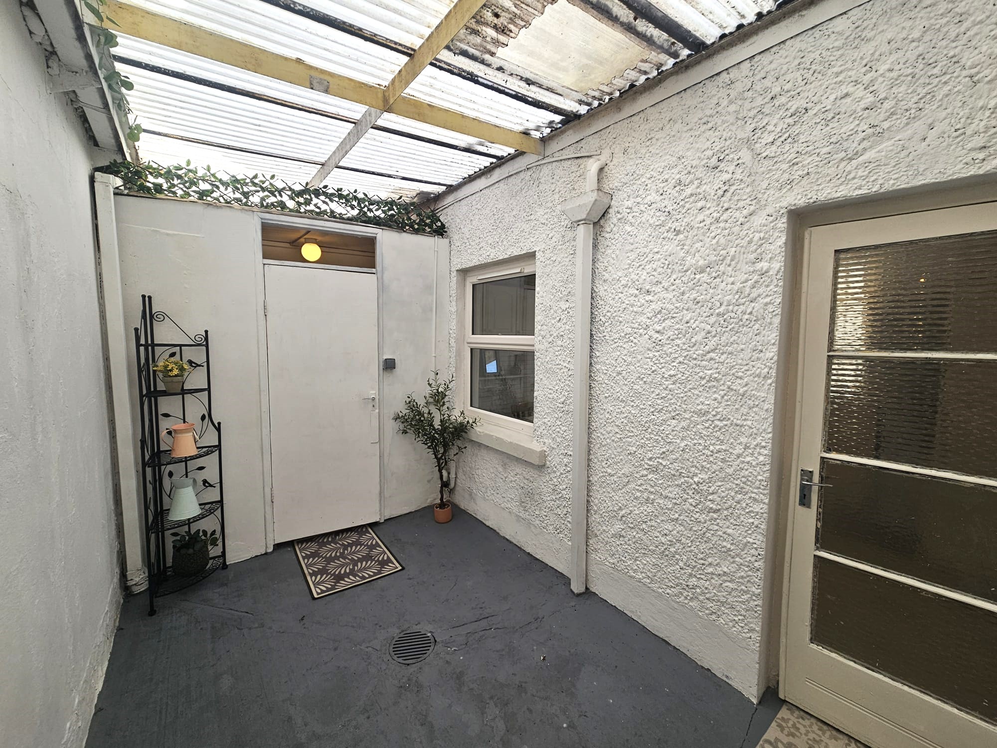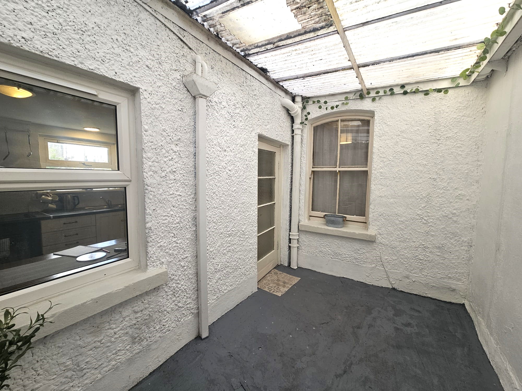 Accessed via the kitchen/dining area the courtyard has painted concrete flooring, a corrugated Perspex roof, two power points, plumbing for a washing machine, and allows access to the ground floor shower room.