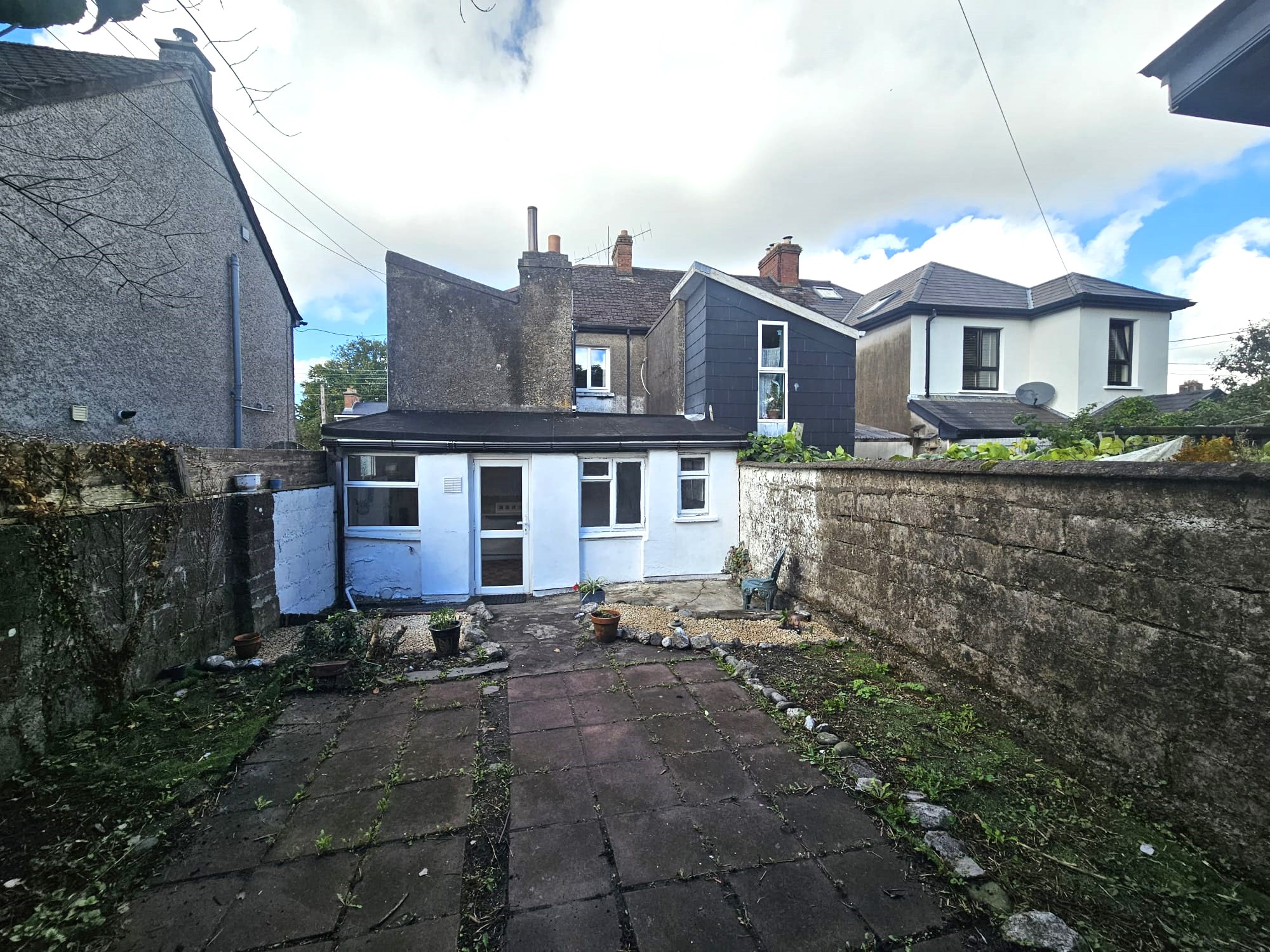 The rear of the property is fully enclosed to all sides. There is a raised patio area with flower beds to either side.