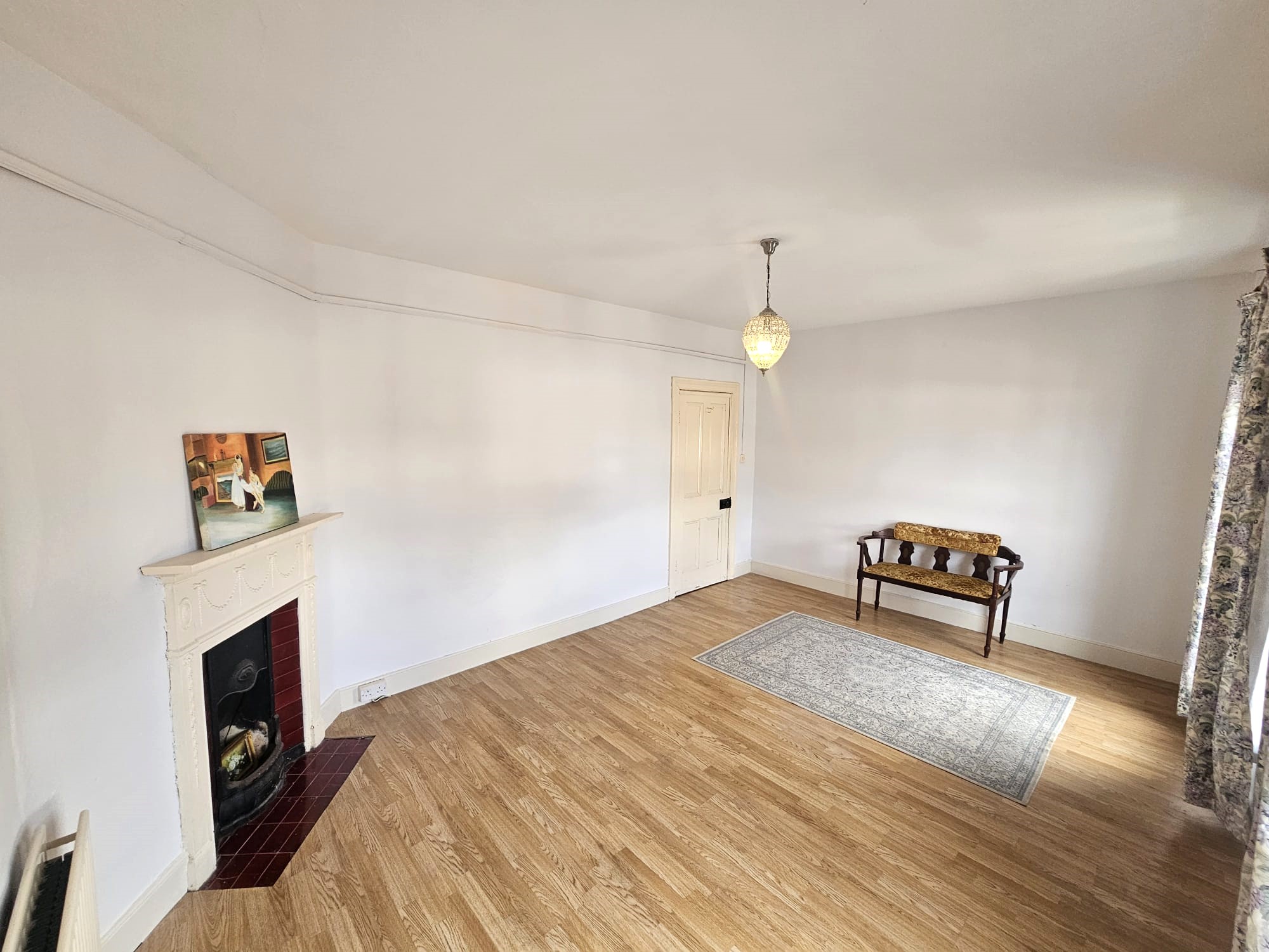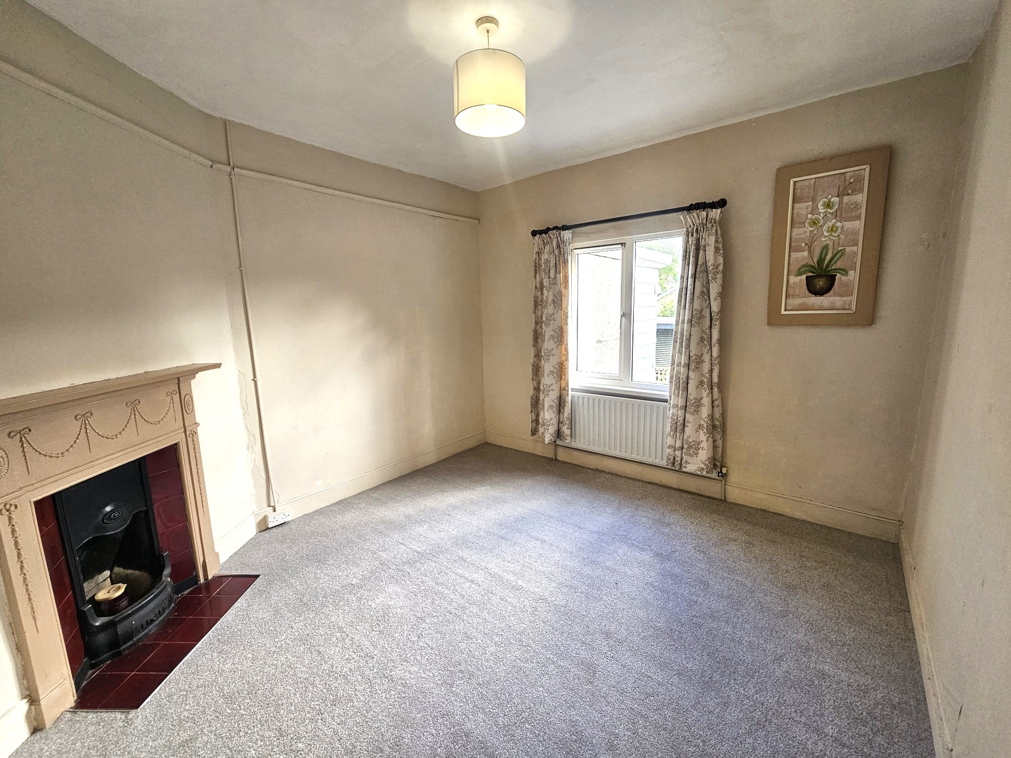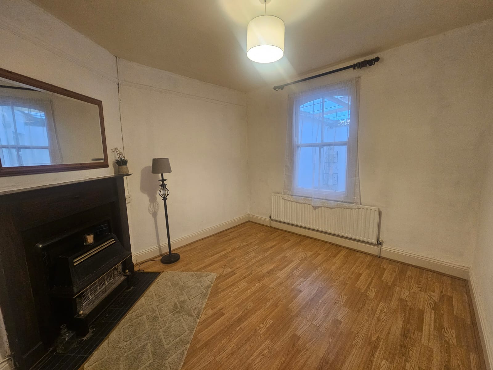 This second living area has laminate timber flooring, one sash window overlooking the rear courtyard, a feature fireplace with electric fire, one centre light piece, one large radiator, and two power points.