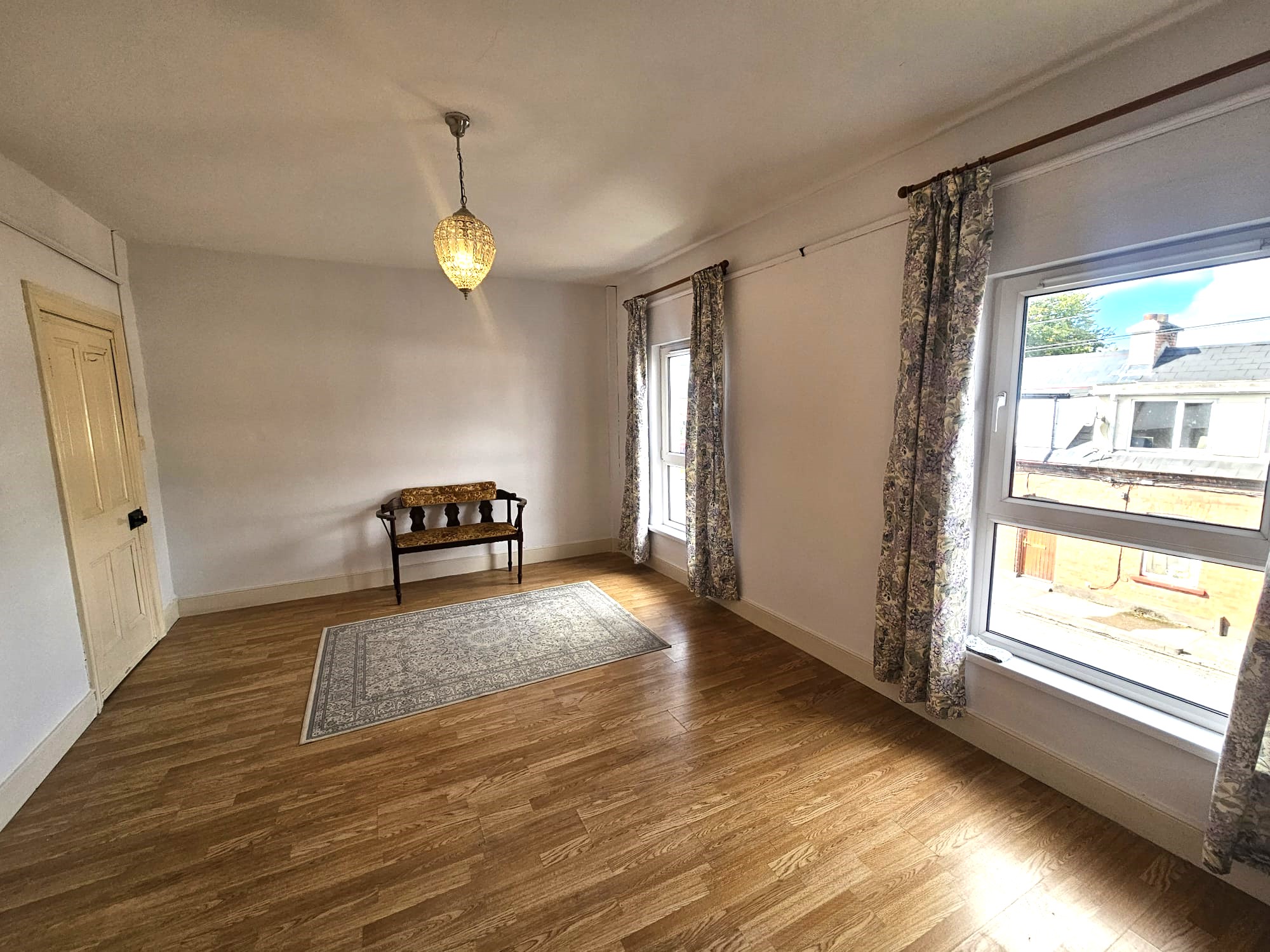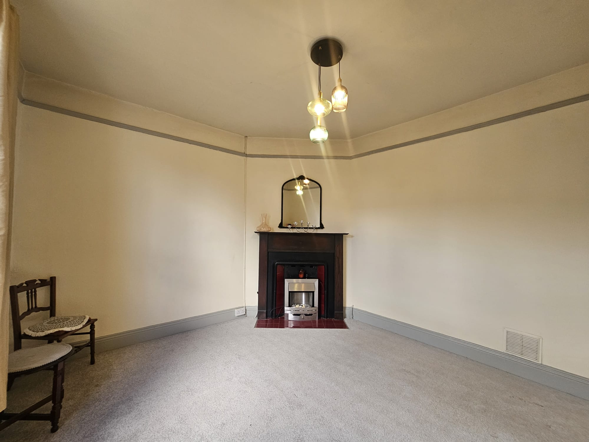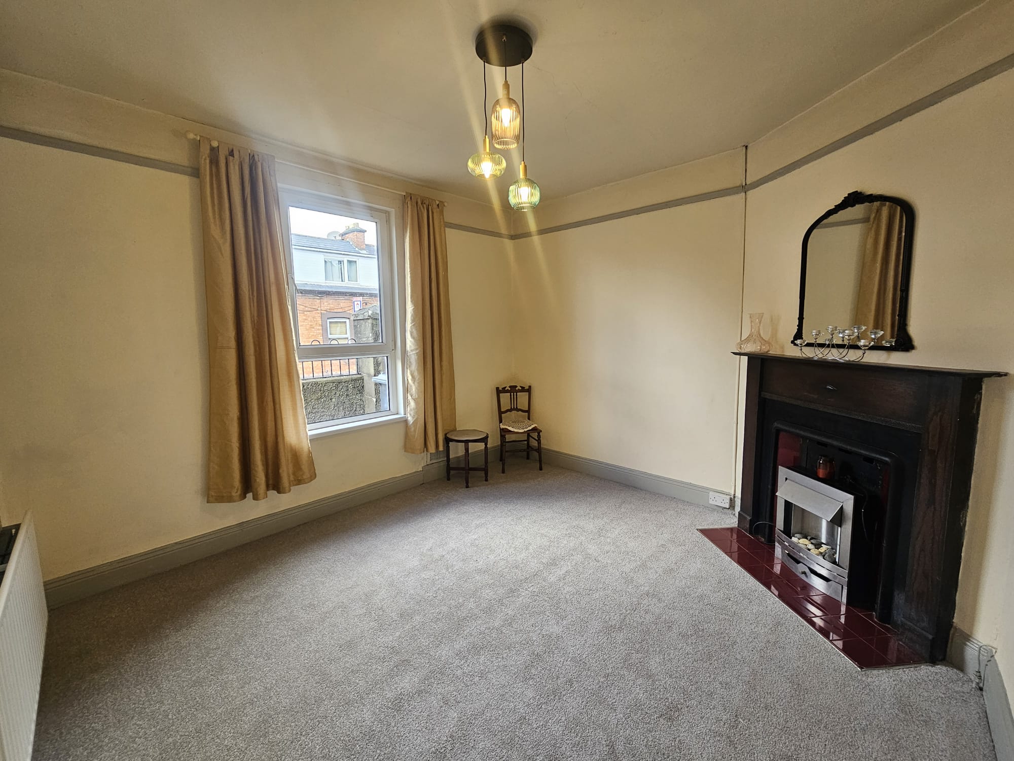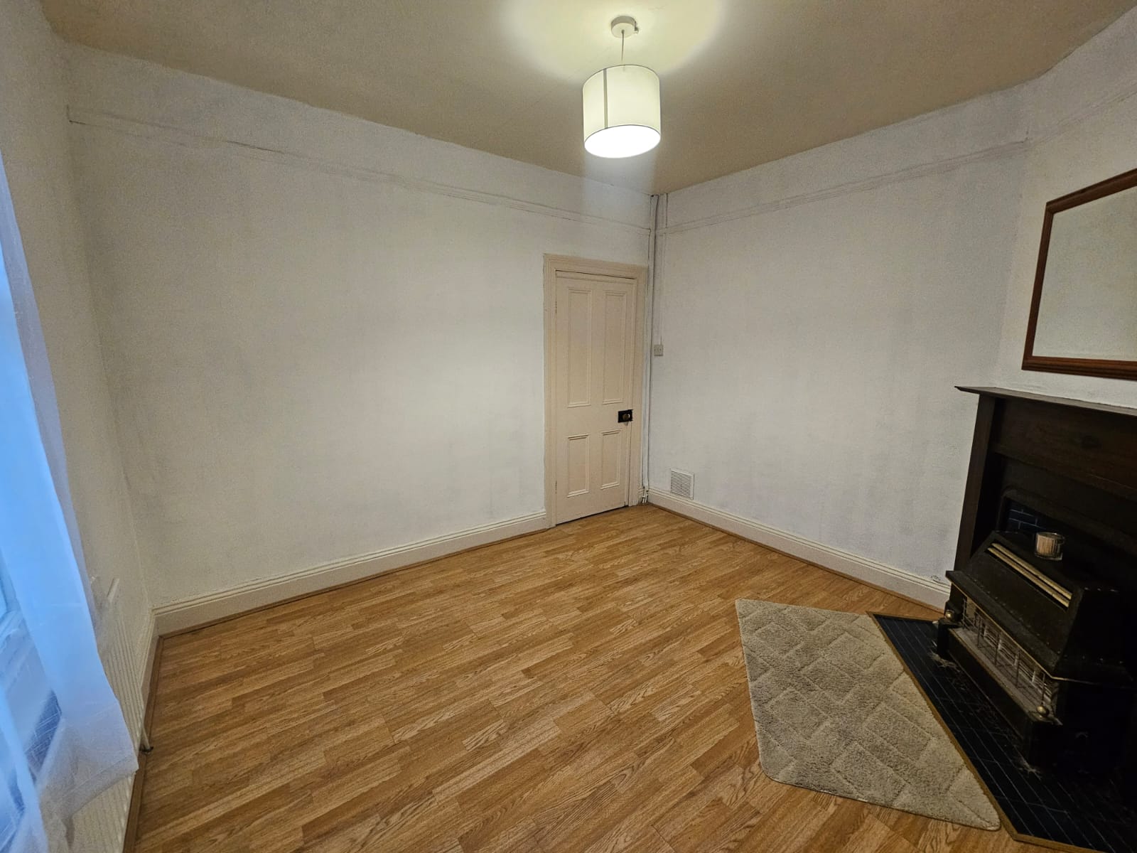 This second living area has laminate timber flooring, one sash window overlooking the rear courtyard, a feature fireplace with electric fire, one centre light piece, one large radiator, and two power points.